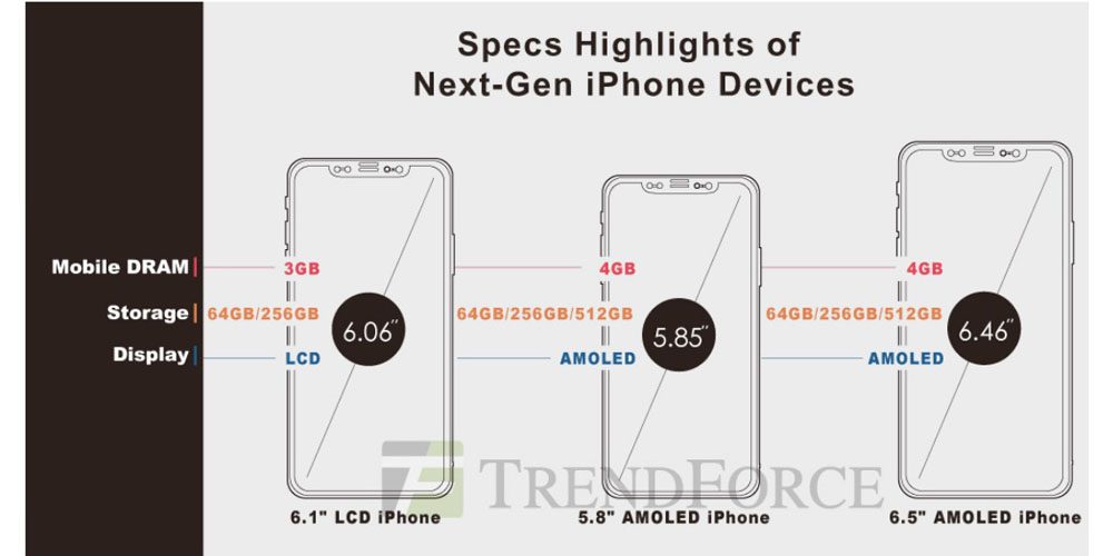 Per il modello di LCD entry-level, che dovrebbe offrire qualcosa di molto simile al design dell’iPhone X a un prezzo più conveniente, TrendForce si aspetta che Apple offra tagli da 64 GB e 256 GB e che il telefono abbia 3 GB di RAM in contrasto con 4 GB per i modelli OLED.
