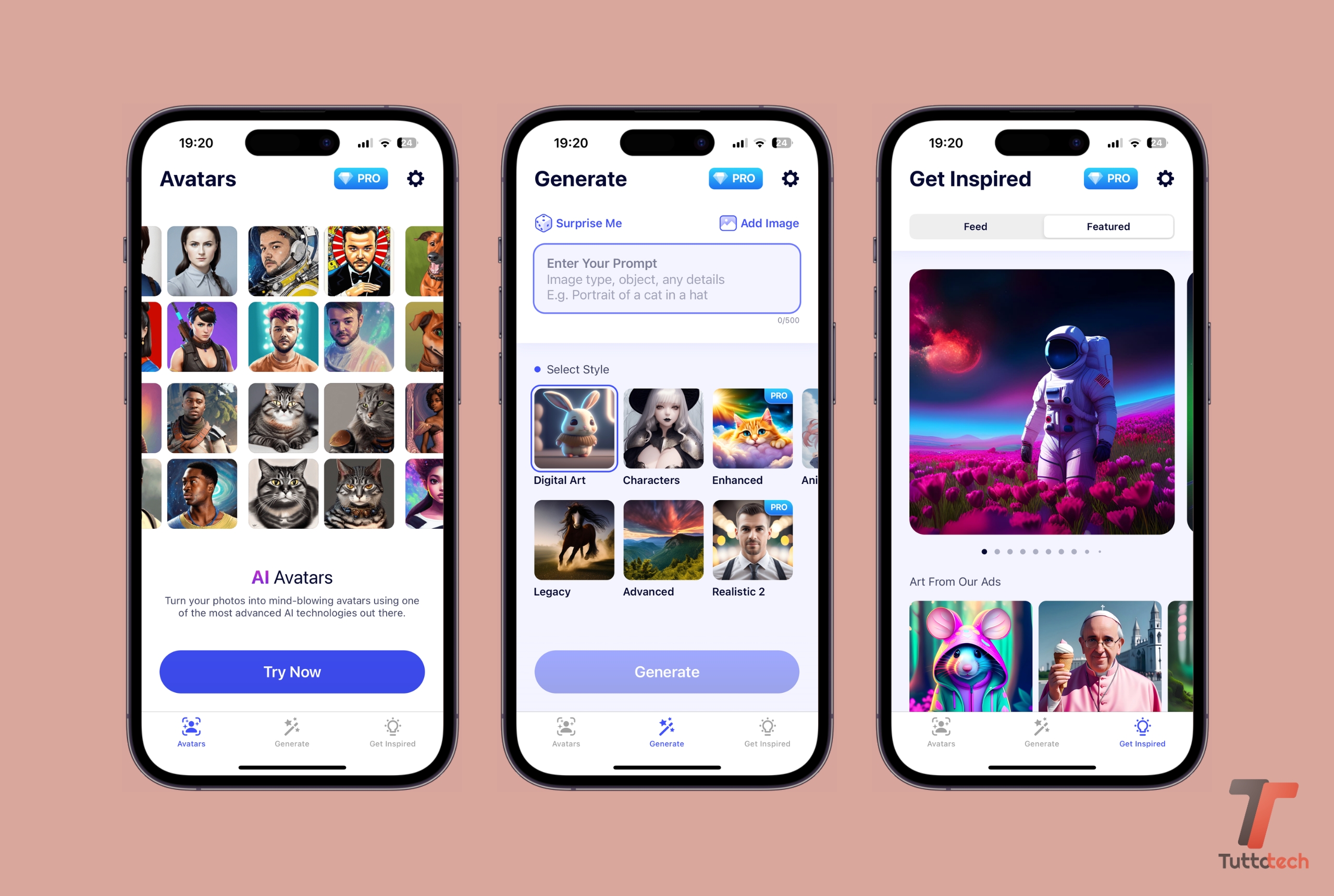 Come suggerito dallo stesso nome dell’app, l’intelligenza artificiale generativa la fa da padrone: l’app, infatti, consente di creare avatar, generare delle immagini a partire da una stringa di testo (in alternativa è possibile scegliere “Surprise Me” e verrà generata un’immagine casuale, o è possibile aggiungere un’immagine da usare come base) selezionando uno stile tra quelli proposti (alcuni disponibili solo in abbonamento), o trarre ispirazione da altri contenuti presenti all’interno di un feed.