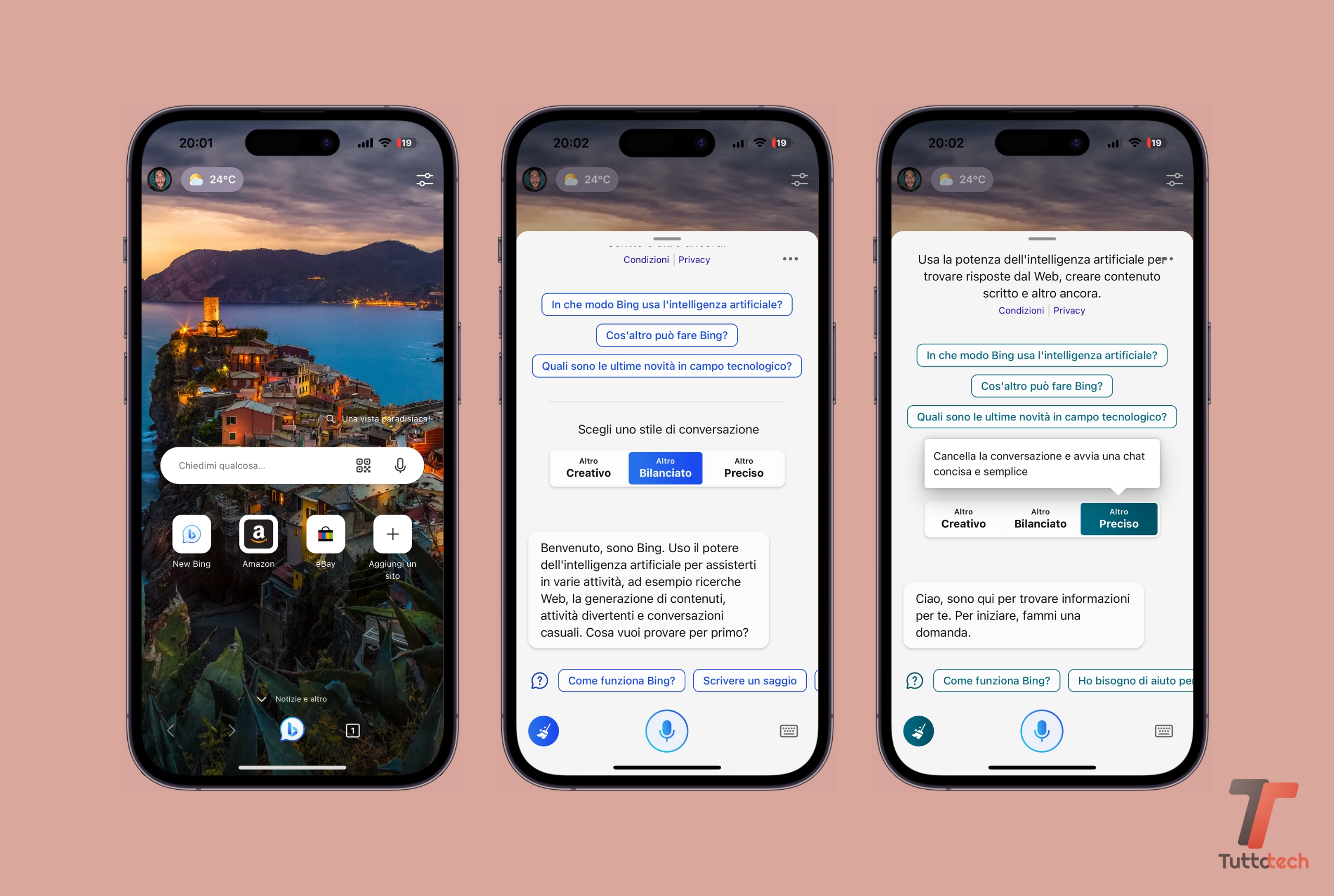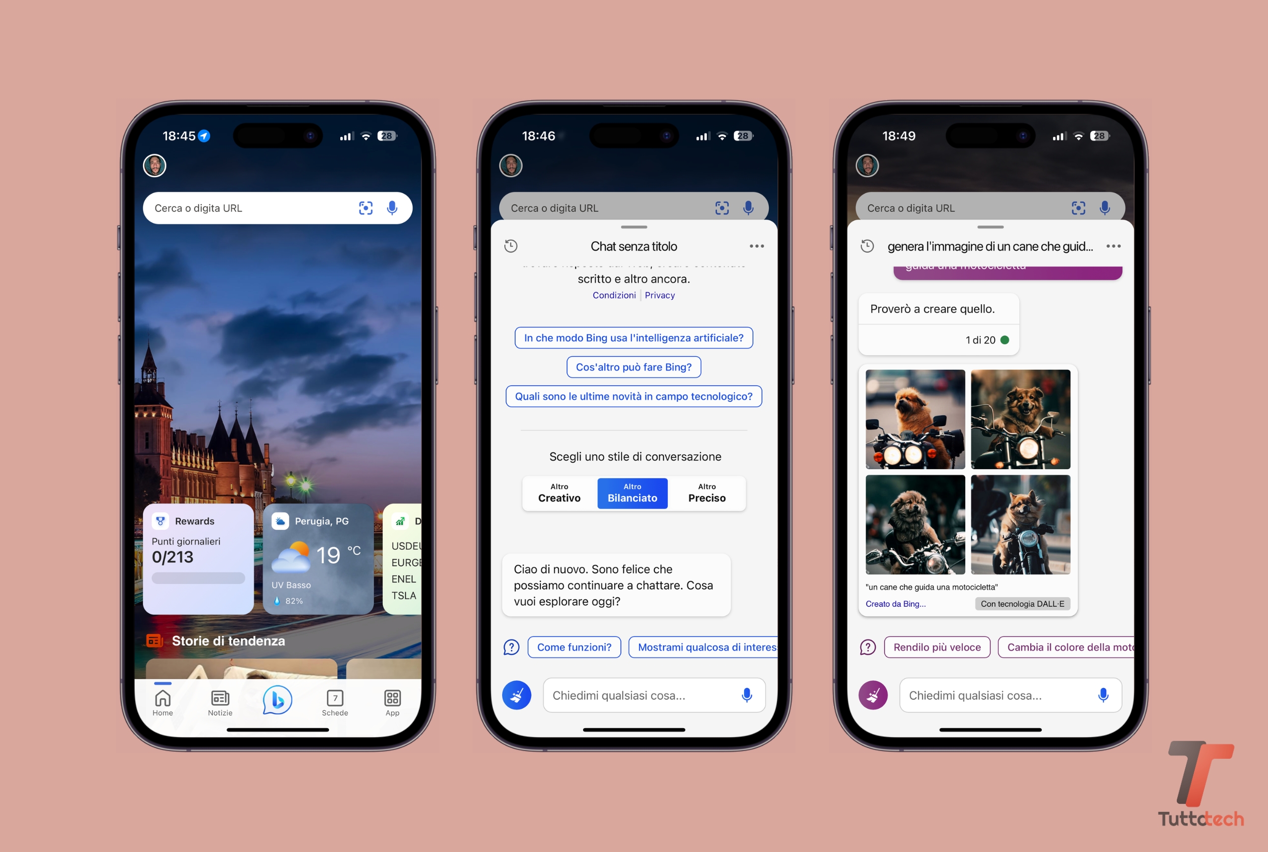 Bing ha le stesse potenzialità proposte con l’app dedicata, permettendo all’utente di scegliere tra tre livelli (creativo, bilanciato, preciso) di stile di conversazione per potere soddisfare le richieste, tramite risposte testuali o tramite immagini generate.