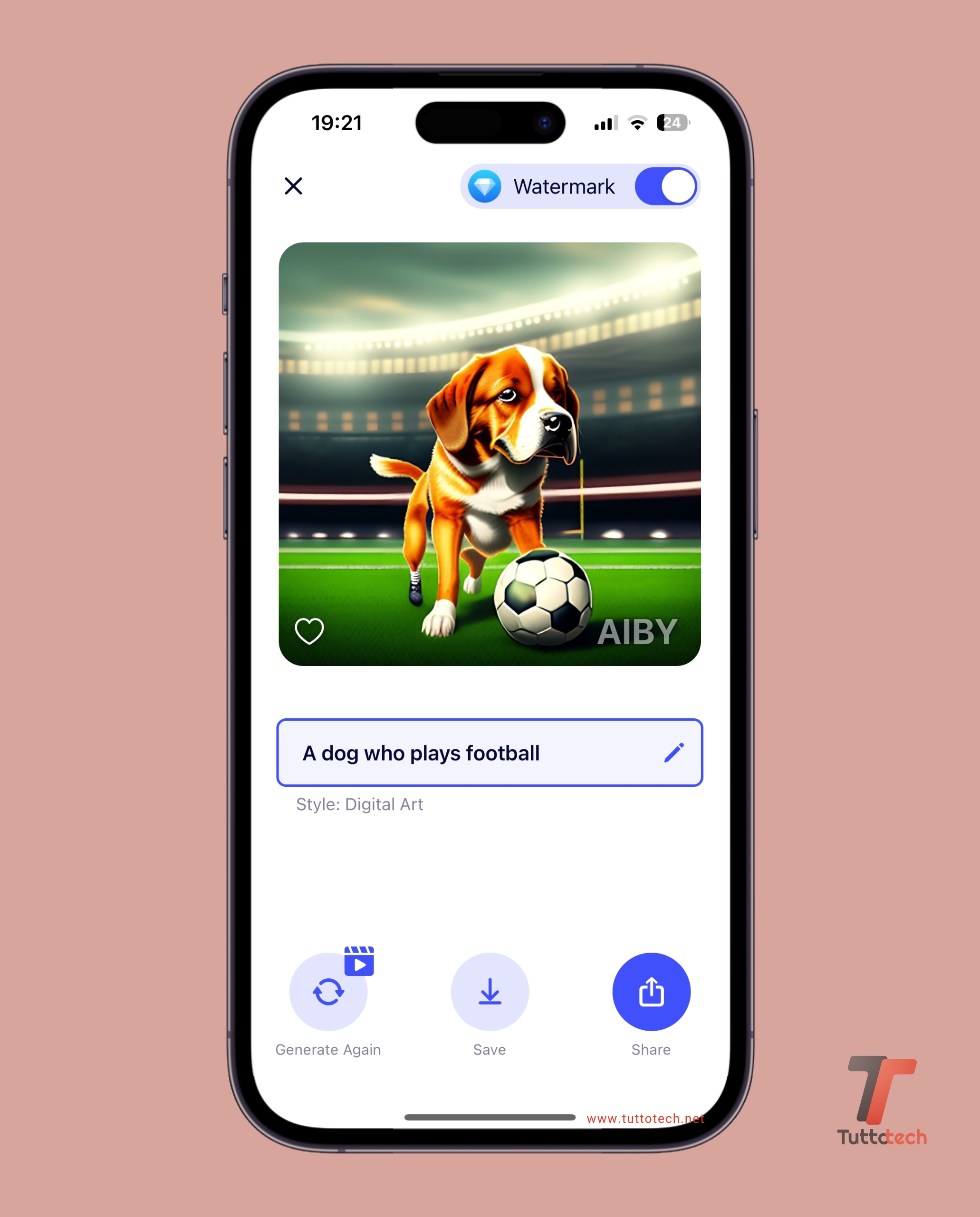 Rimanendo con la versione gratuita, che ogni tanto chiede all’utente di visionare un video per proseguire con l’utilizzo dell’app, le immagini generate hanno un watermark in sovrimpressione. Qua sotto potete vedere un esempio di immagine generata a partire da una stringa di testo con stile “Digital Art”.