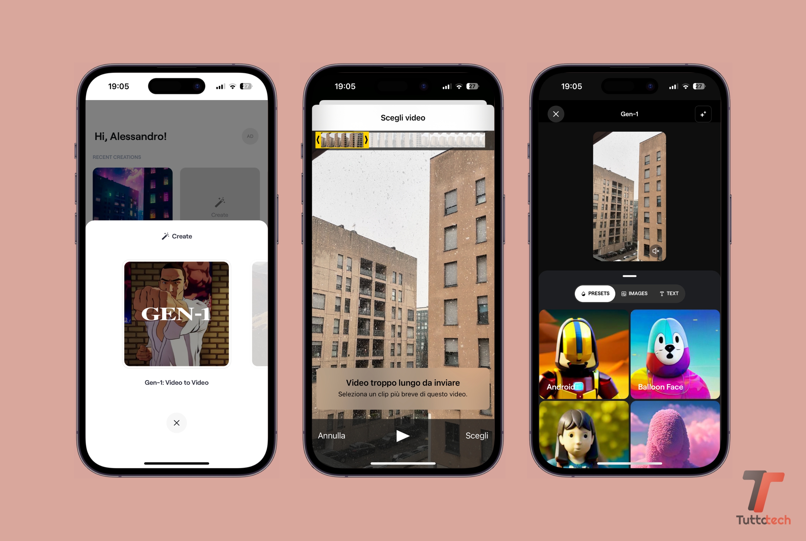 Presto verranno implementati sull’app per iOS altri due strumenti: Gen-2 consentirà di creare video a partire da una stringa di testo; Image-to-Image consentirà di modificare, su indicazione dell’utente (stili predefiniti o indicazioni testuali), un’immagine esistente, o di crearne una completamente nuova.