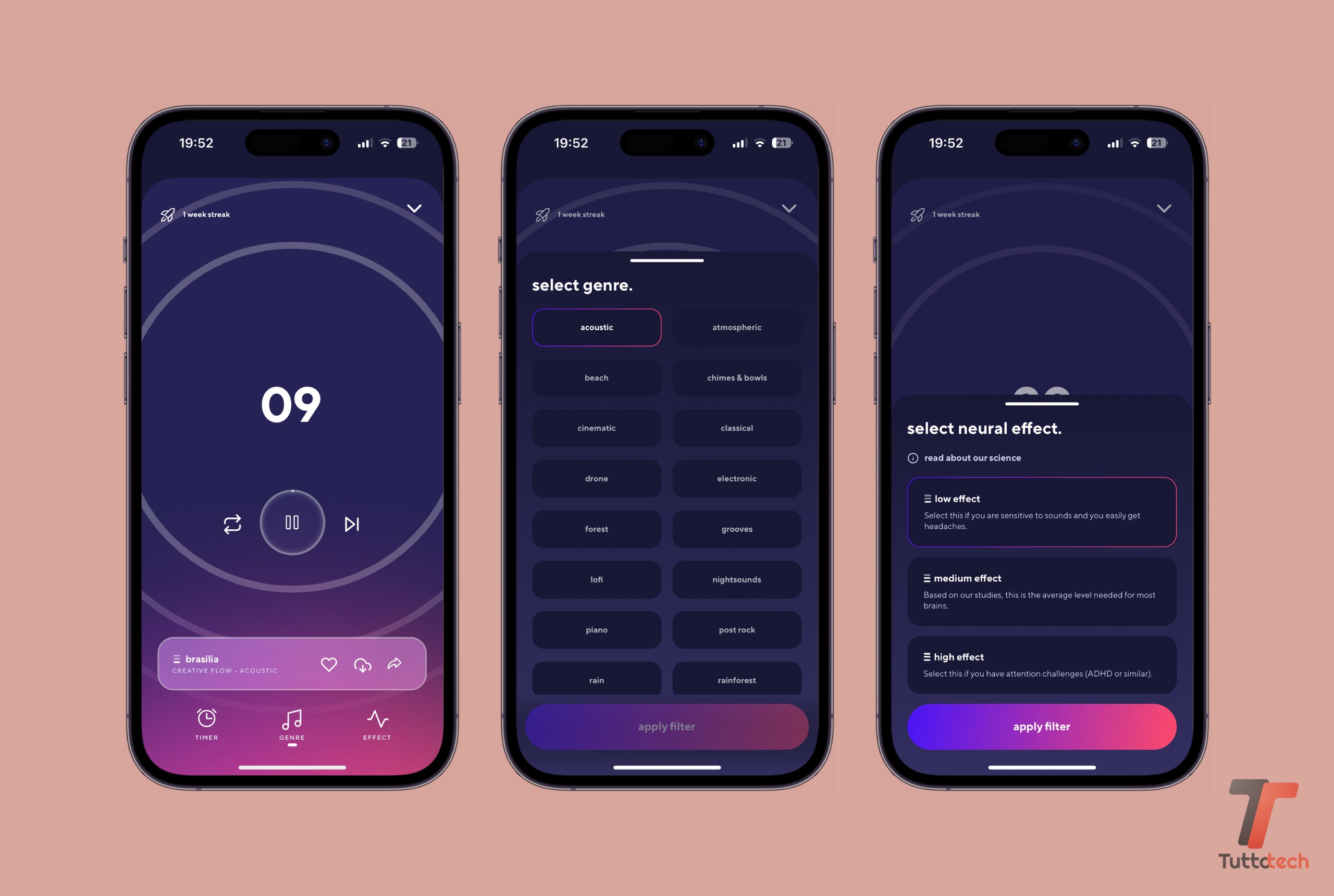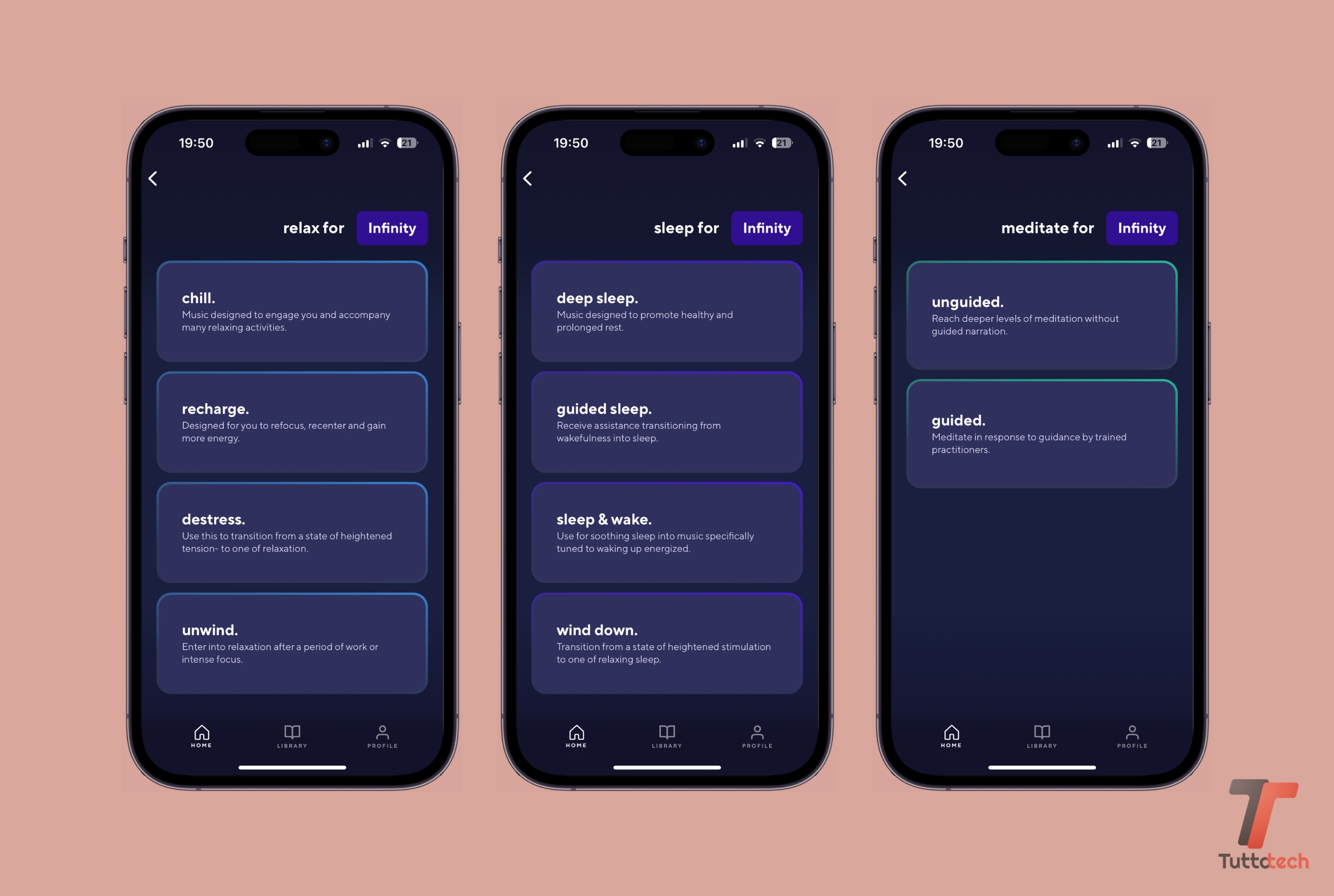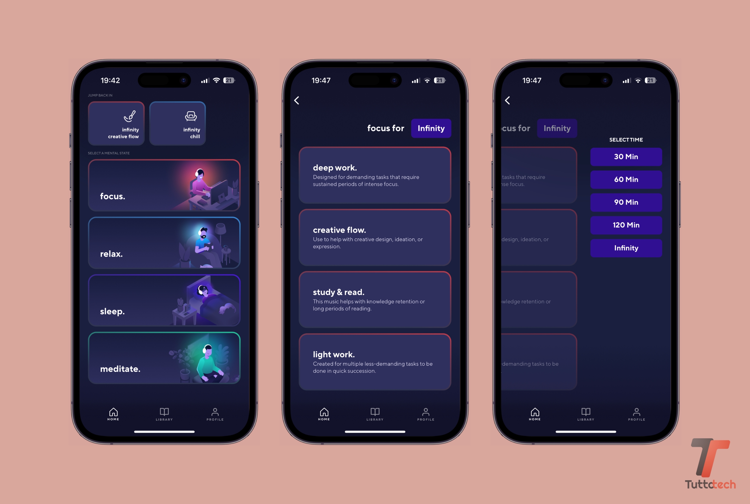 La schermata iniziale dell’app, oltre a mostrare le sessioni di ascolto iniziate in precedenza, farà scegliere la tipologia di obiettivo prefissato tra concentrazione, relax, sonno e meditazione. Una volta scelta la tipologia di obiettivo, l’app chiederà di scegliere un timer (tra 30, 60, 90, 120 minuti o infinito) e a cosa serva questa sessione (ad esempio, nel caso della concentrazione, chiede se serve per lavoro pesante, per flusso creativo, per studio e lettura o lavoro leggero).