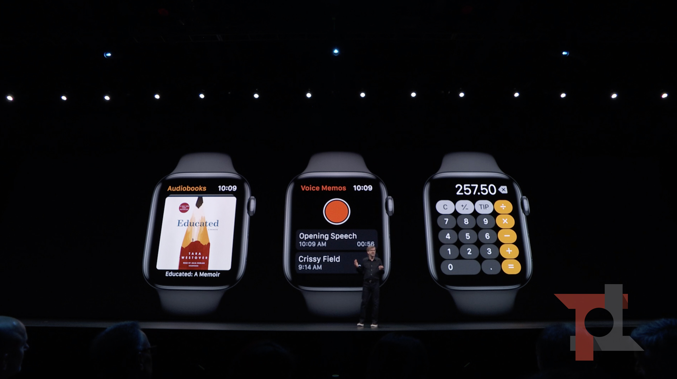 watchOS 6 segna l’arrivo su Apple Watch di nuove applicazioni che potremmo definire standalone, ovvero capaci di funzionare senza una corrispettiva applicazione installata su iPhone. Fra le più interessanti troviamo un’app per il meteo, una calcolatrice, un’app per ascoltare audio-libri e un’app per registrare memo vocali. La novità più interessante però riguarda gli sviluppatori che ora potranno sfruttare nuove API per riprodurre tramite Apple Watch file audio più lunghi di quanto è possibile finora e leggere più dati, che in parte potrebbe voler dire dare a Spotify e similari la possibilità di riprodurre musica tramite rete dati.