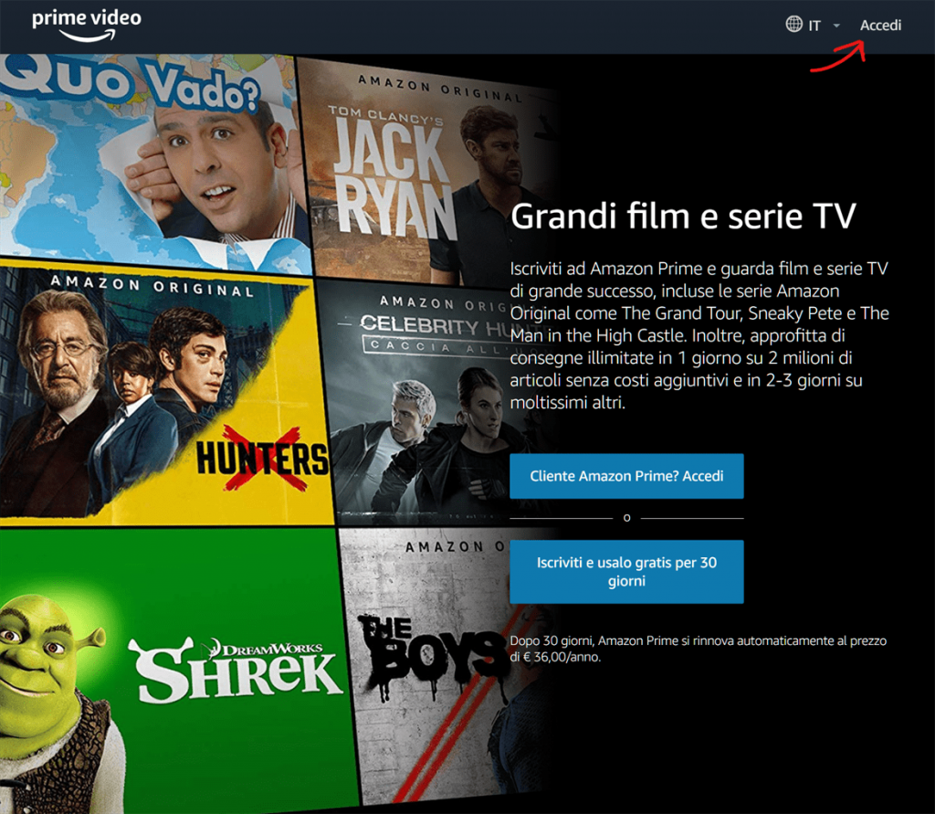 - Accedere al sito di Amazon Prime Video tramite browser, consigliamo di farlo da Mac o PC;