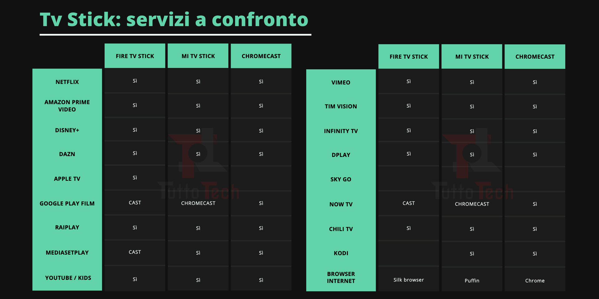 Abbiamo realizzato questa infografica per sintetizzare al meglio quali sono i servizi supportati da ciascuna stick: