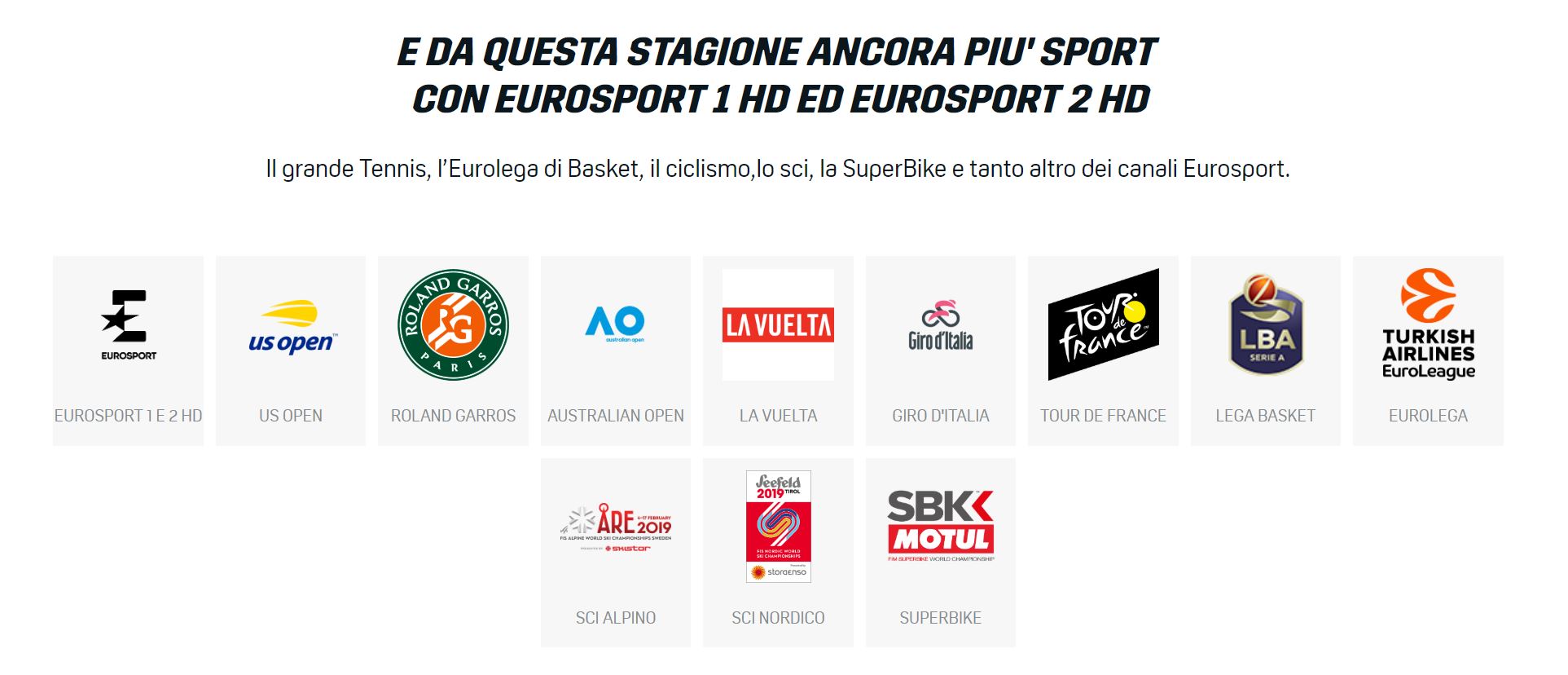 Ma la vera novità sono i canali live di Eurosport 1 HD ed Eurosport 2 HD, grazie ai quali poter accedere alla visione di eventi legati al Tennis, all’Eurolega di Basket, al ciclismo, allo sci, alla SuperBike, al Giro D’Italia, al Tour De Francem La Vuelta, agli Open Roland Garros, agli Australian Open. In questo caso precisiamo che lo streaming dei due canali Eurosport è lo stesso di quello della piattaforma di Sky, con Discovery che mantiene i canali extra esclusivi della piattaforma Eurosport Player.