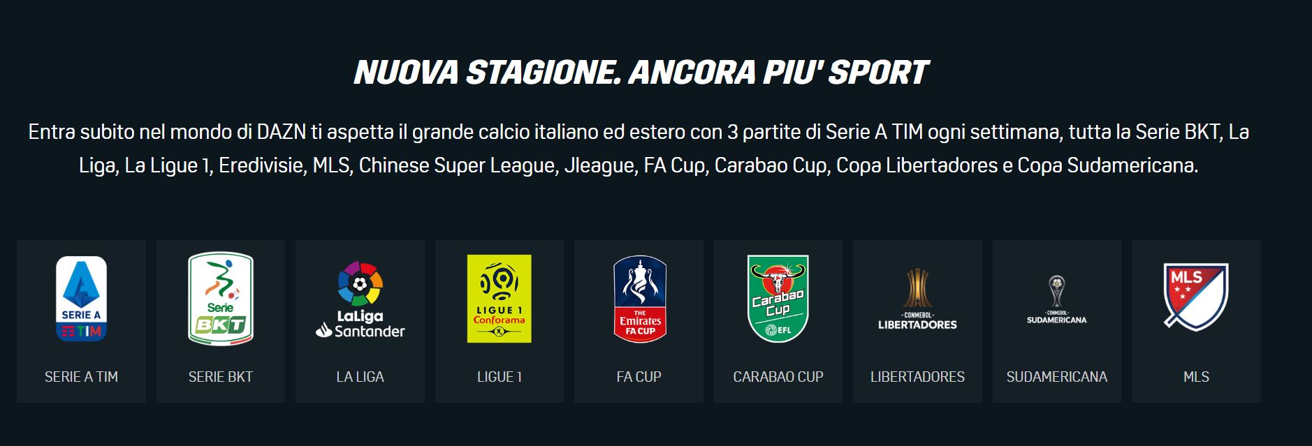 La nuova stagione di DAZN, oltre a proporre il calcio italiano ed estero con 3 partite di Serie A TIM ogni settimana (4 big match su 20), offre all’utente tutta la Serie BKT, La Liga, La Ligue 1, Eredivisie, Championship (Serie B inglese), MLS, Chinese Super League, Jleague, FA Cup, Carabao Cup, Copa Libertadores e Copa Sudamericana.
