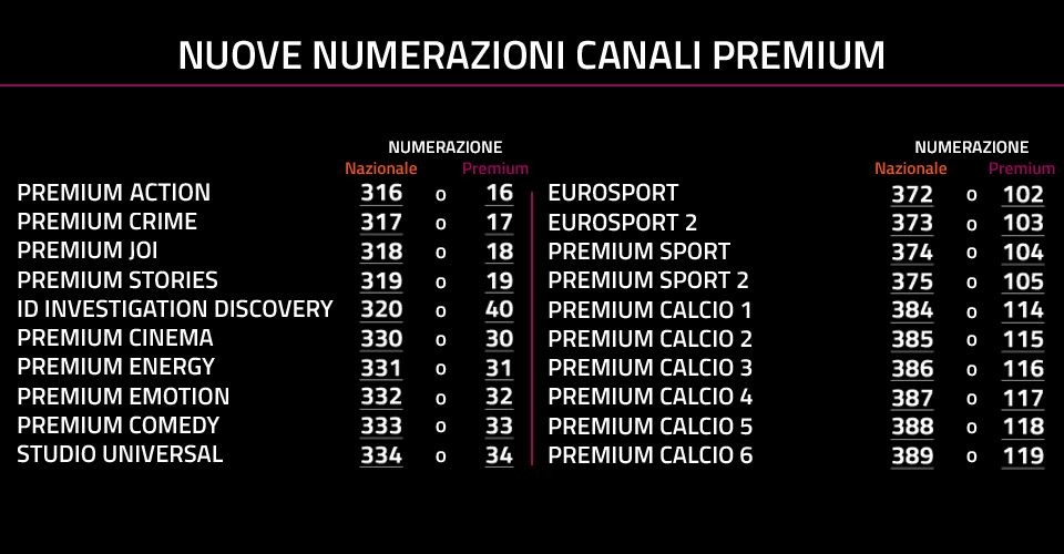 Attraverso una comunicazione ufficiale, Mediaset Premium ha comunicato che da oggi 1° Giugno è stata apportata una modifica alle frequenze dei canali e quindi alla loro numerazione per far spazio alle nuove aggiunte della proposta Sky (frutto del super accordo raggiunto nelle settimane precedenti).