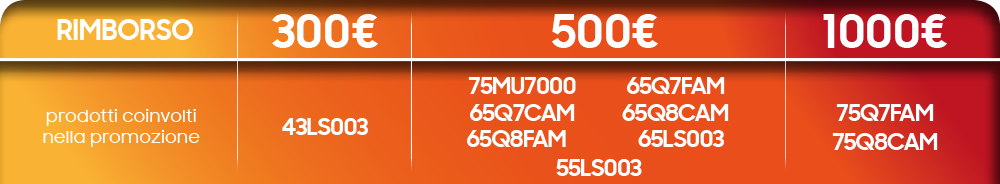 Stando ai dati forniti da Samsung, l’iniziativa prevede un rimborso di 300, 500 e 1000 euro in base ai modelli di Smart TV che si acquistano. In particolare: