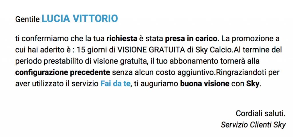 I clienti Sky interessati stanno ricevendo una email che li avvisa come usufruire della promozione.