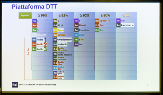 L’attuale offerta RAI comprende 13 programmi TV e 12 programmi Radio, spalmati su 5 Multiplex. Solo il primo, quello più importante, raggiunge una copertura quasi totale con più del 99% della popolazione coperta. L’ultimo MUX contenente Rai 4HD e Rai Premium HD copre meno della metà della popolazione italiana.