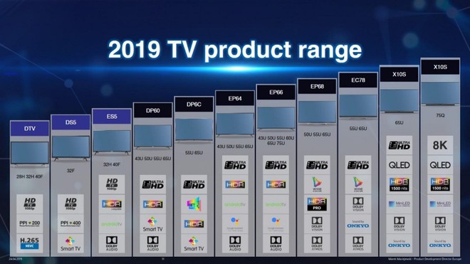 Per quanto riguarda la serie EP68, verrà proposta in tre tagli da 50″, 55″ e 65″. In tutti i tagli troviamo la presenza di un pannello con risoluzione Ultra HD, il supporto agli spazi colore ampliati (DCI-P3 e BT.2020) e la possibilità di riprodurre tracce audio in Dolby Atmos. Disponibile anche la retroilluminazione Direct LED senza local dimming (niente zone di illuminazione separate), con un picco di luminosità si attesta a circa 400 cd/m2 – nits.
