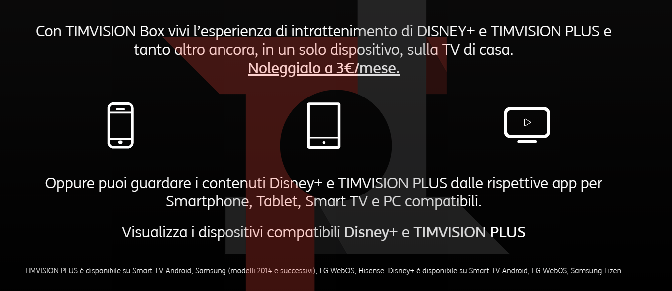 L’offerta è dedicata ai già clienti TIM per la linea fissa, e il pagamento del canone mensile avverrà direttamente in bolletta; è possibile attivarla online, nei negozi TIM, chiamando il 187 oppure direttamente dal TIMVISION Box.
