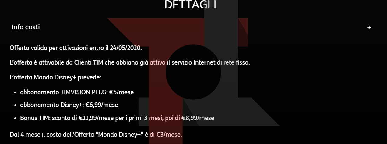 La promozione, attivabile dal 24 marzo e fino 24 maggio 2020, permetterà di godere di uno sconto sostanziale nell’abbonamento ai due servizi; infatti invece di pagare 11,99 Euro al mese (5 Euro per TIMVISION PLUS e 6,99 Euro per Disney+), si avrà diritto ad uno sconto dell’intera cifra per i primi 3 mesi, e di 8,99 Euro al mese per i mesi successivi.