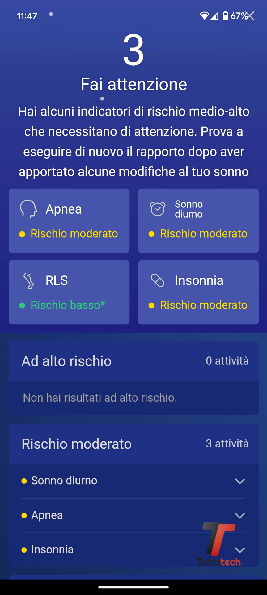 Se l’applicazione rileverà dei valori anomali li raggrupperà per livello di rischio, con una serie di indicazioni utili a risolvere la situazione o a ridurre il livello di rischio, concentrandosi in particolare su apnee notturne, sonnolenza diurna, insonnia e sindrome della gamba senza riposo, tutte problematiche che vanno a influire in maniera molto significativa sulla qualità del sonno e sulla capacità di recuperare le energie fisiche e mentali.