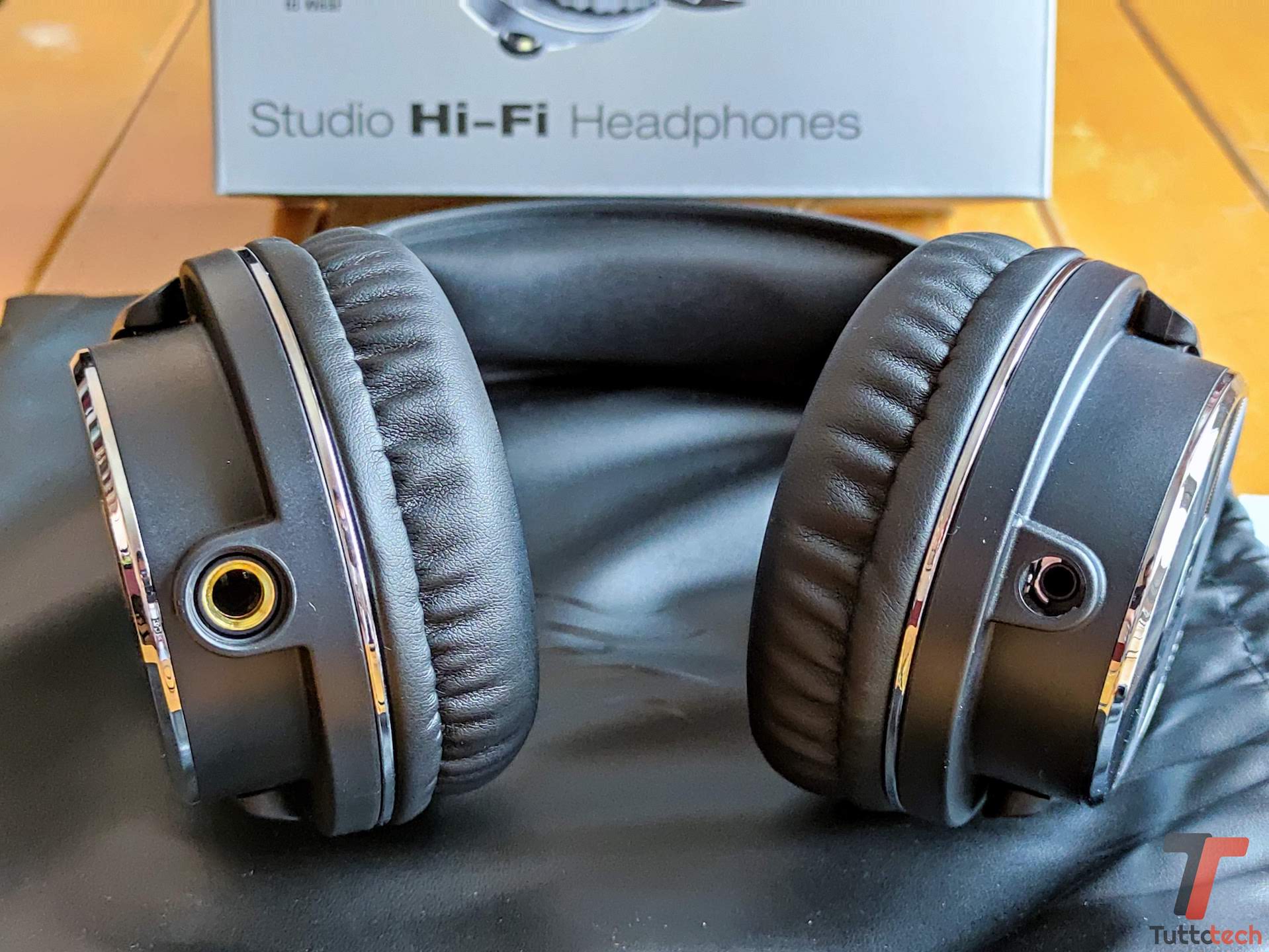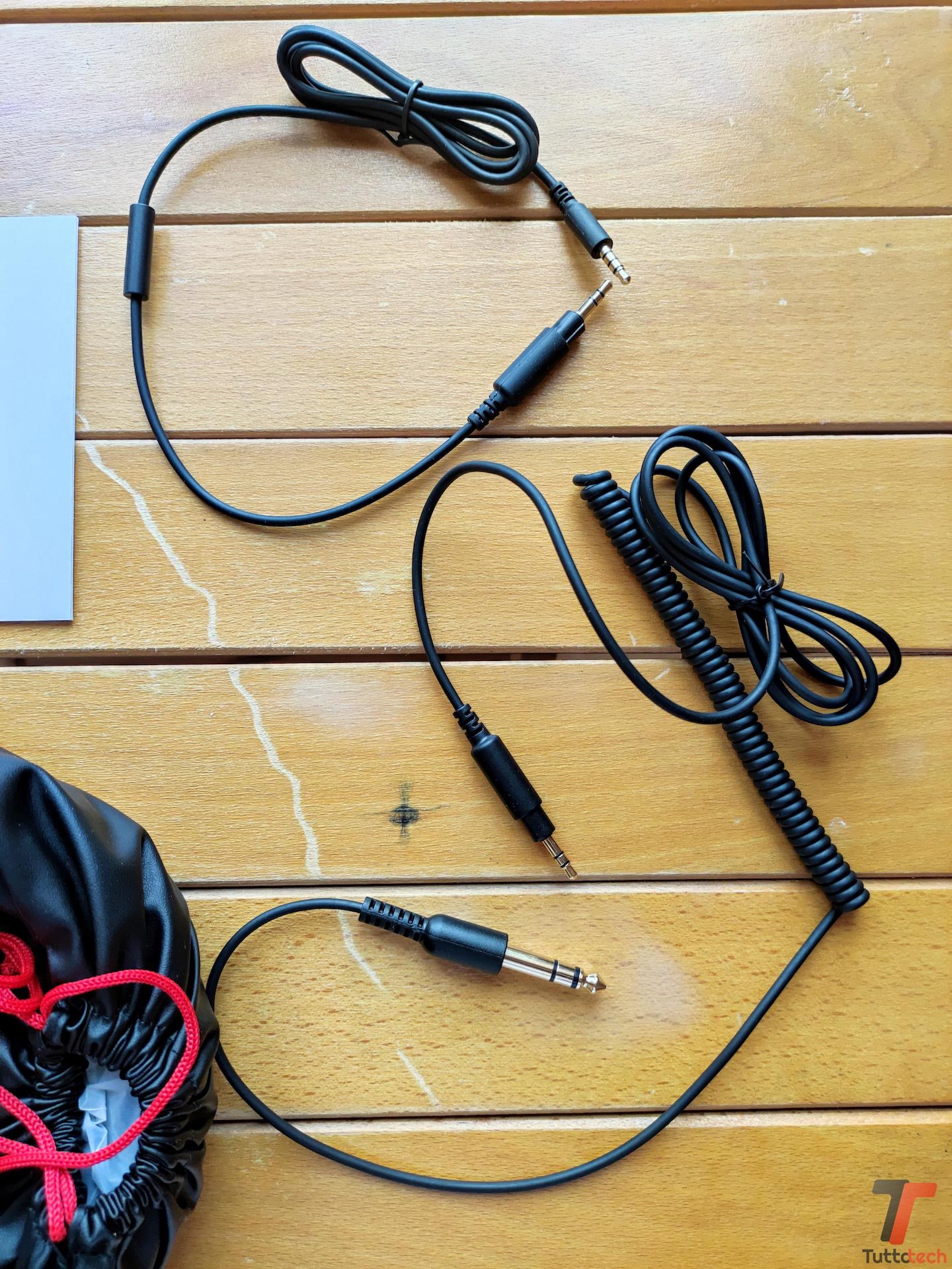 OneOdio Studio HiFi e OneOdio Monitor 60 arrivano in scatole di cartone che da sole sono sufficienti a riconoscere la diversa fascia di prezzo di appartenenza: quella delle seconde presenta una cura minuziosa di ogni dettaglio sconosciuta all’altra. La dotazione, comunque, è degna di nota per entrambi i modelli: le più economiche OneOdio Studio HiFi offrono una borsa per il trasporto, un cavo da 1,5 m con jack da 3,5 mm a 3,5 mm con microfono e un cavo a spirale da 2-3 m con jack da 6,35 mm a 3,5 mm; le Monitor 60 aggiungono anche un terzo cavo lungo 3 m con jack da 3,5 mm a 3,5 mm. L’inclusione di tutti questi cavi si spiega con una peculiarità che accomuna i due modelli: la presenza di due ingressi jack, di cui uno da 3,5 mm e uno da 6,35 mm.