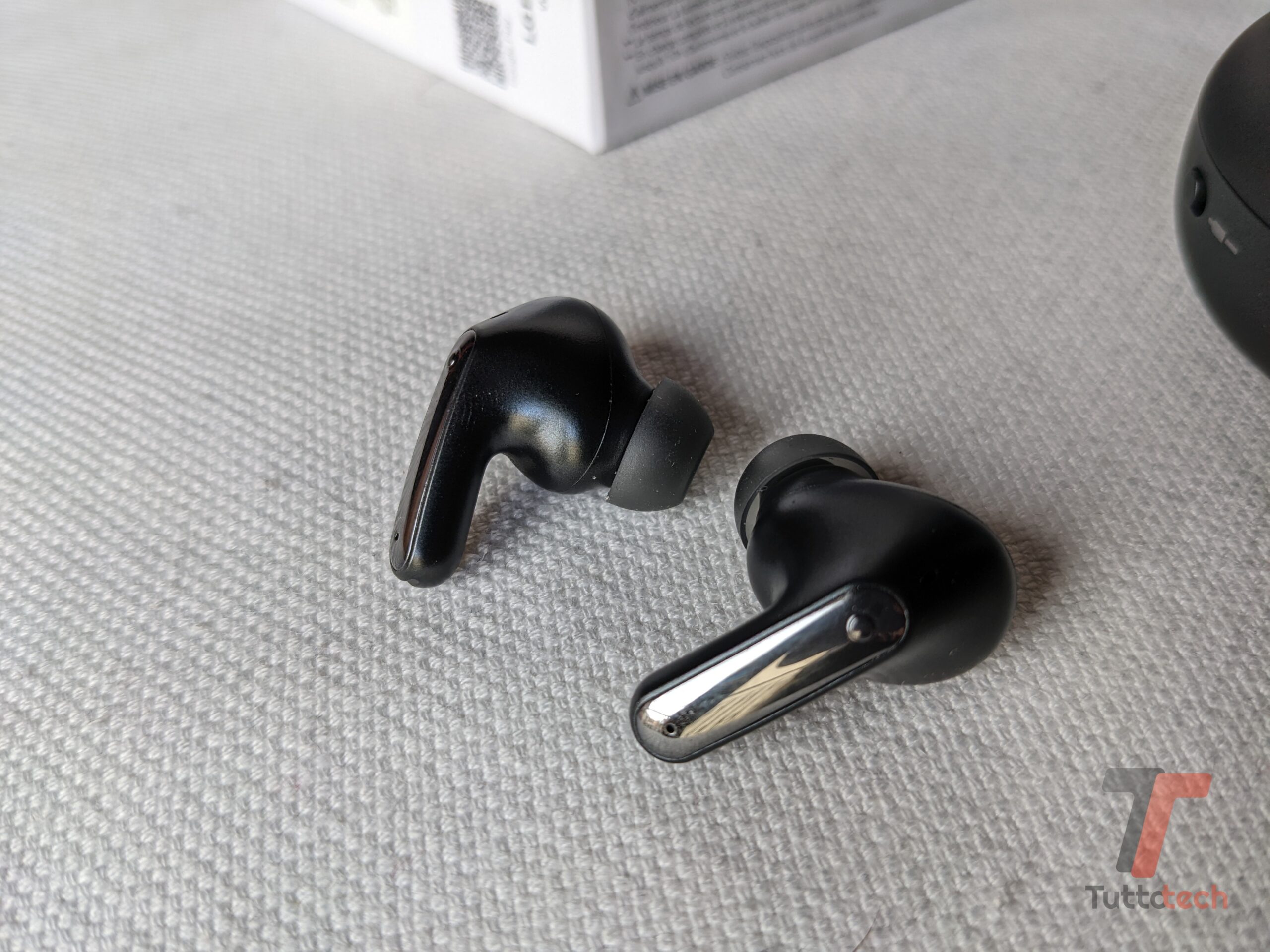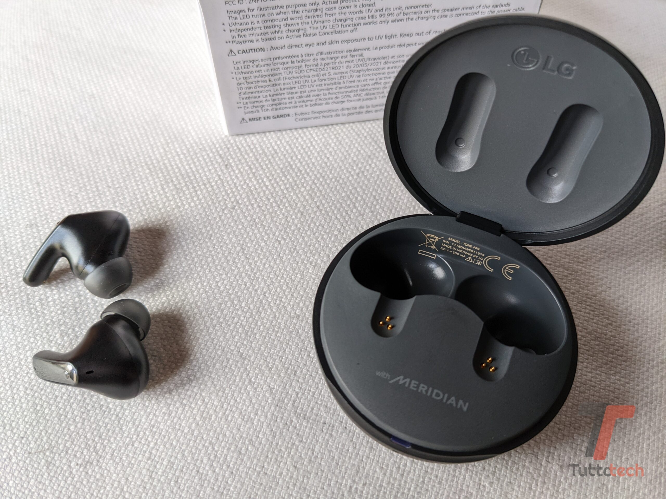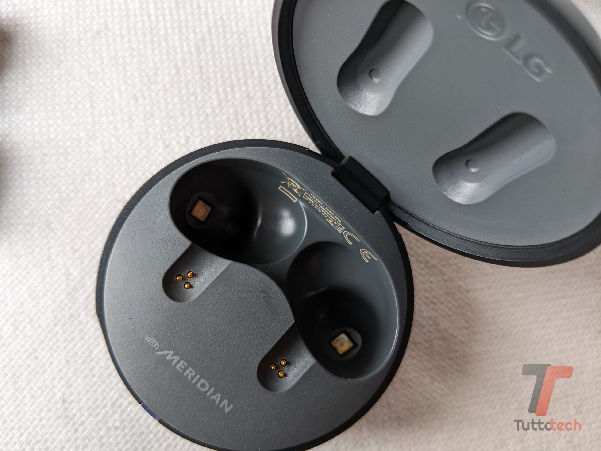 Sono ricaricabili tramite la porta USB-C utilizzando un qualsiasi caricabatterie e una ricarica completa richiede all’incirca 2 ore, anche se questo dato è assai variabile a seconda della carica residua dei due auricolari e del case. Sfortunatamente non c’è la ricarica wireless e quindi non sono ricaricabili su una basetta a induzione, per esempio. In compenso c’è la ricarica rapida capace di garantire un’ora di riproduzione musicale con appena 5 minuti di ricarica. L’autonomia è assai variabile, soprattutto in relazione all’uso della cancellazione attiva del rumore, ma in linea generale fa registrare i valori dichiarati da LG: circa 10 ore con solo i due auricolari e circa 24 ore con l’ausilio del case.
