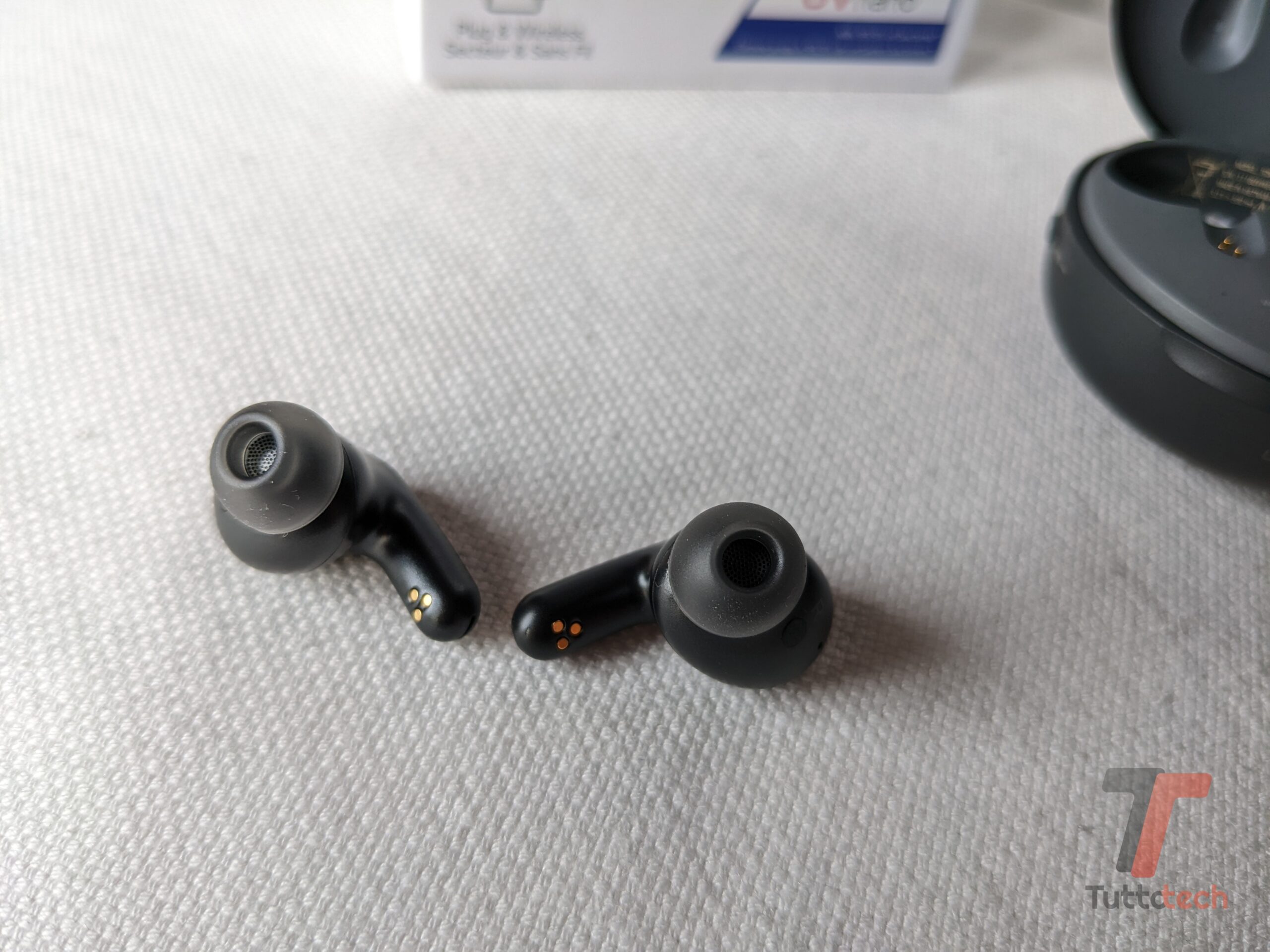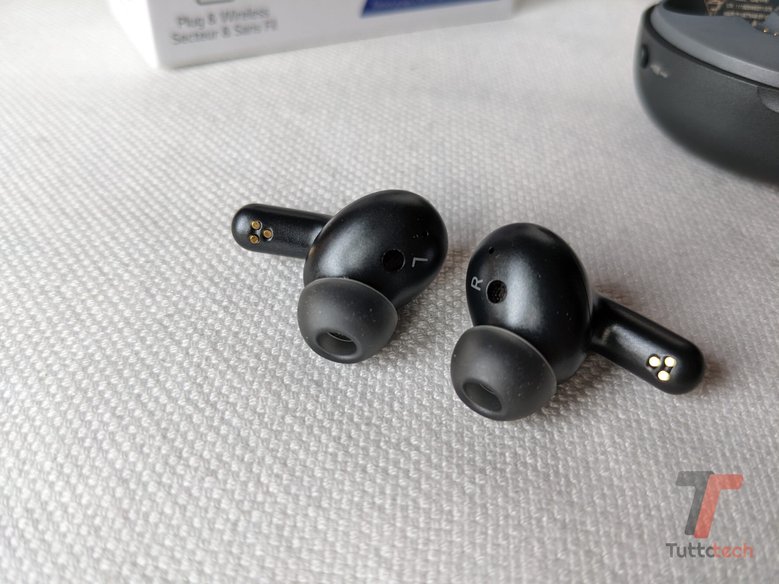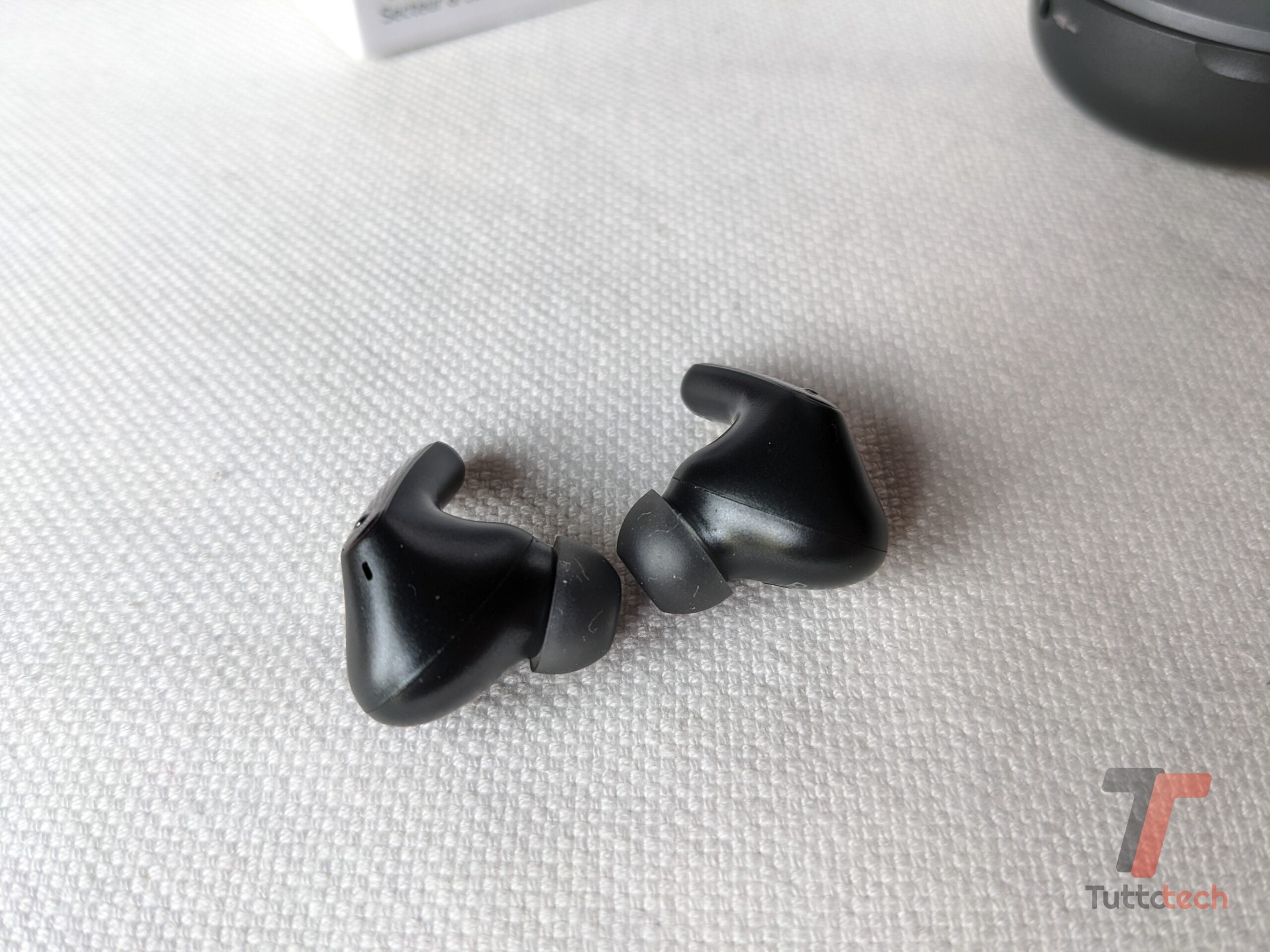 L’unico appunto da fare qui è legato all’estrazione: vuoi per il poco spazio nel case o vuoi per i magneti che le tengono troppo salde, sono difficili da afferrare ed estrarre e l’unico modo per tirarle fuori è effettuare una leggera rotazione per allontanarle dal magnete, altrimenti scivolano sistematicamente; non è possibile estrarle in modo perpendicolare e questo è un po’ una scocciatura perché complica e rallenta un po’ l’estrazione dal case. Una volta estratte, è un attimo indossarle e renderle stabili all’interno del padiglione auricolare per via della loro forma, delle loro dimensioni e, soprattutto, dei speciali gommini in gel medicale che si adattano alla perfezione, isolano dall’esterno, le tengono salde e fanno sì che siano comode da indossare. E dopo indossate non cadono più neanche correndo velocemente, facendo acrobazie a sbarre in palestra, stando in verticale a testa in giù e facendo qualsiasi altra attività quotidiana che si possa immaginare. Sono assolutamente promosse per quanto riguarda questi aspetti.