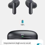 Per quanto riguarda l’igienizzazione, questa avviene solo durante la fase di ricarica con cavo e case chiuso e richiede una ricarica di appena 5 minuti, durante la quale il case elimina il 99,9% dei batteri presenti sulla parte estrema prossima al canale uditivo degli auricolari. Ci sono dei LED sul case che segnalano l’autonomia e l’igienizzazione. Molto bene quindi l’autonomia e tutto il processo che elimina i batteri.