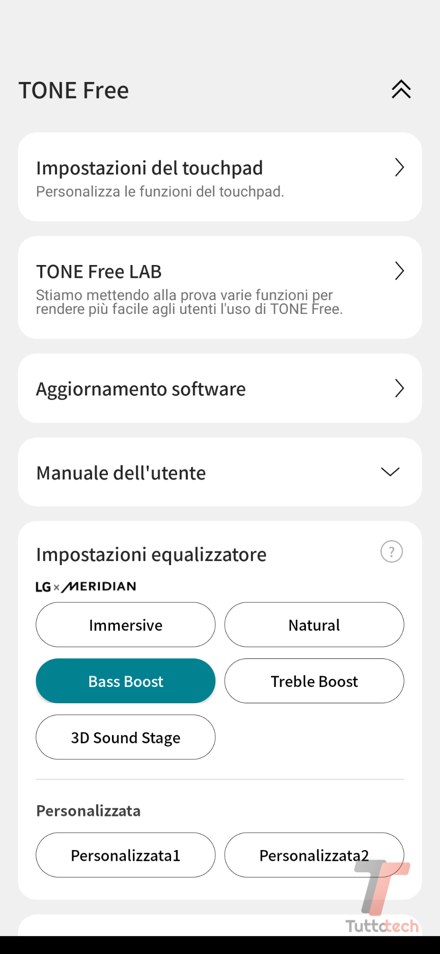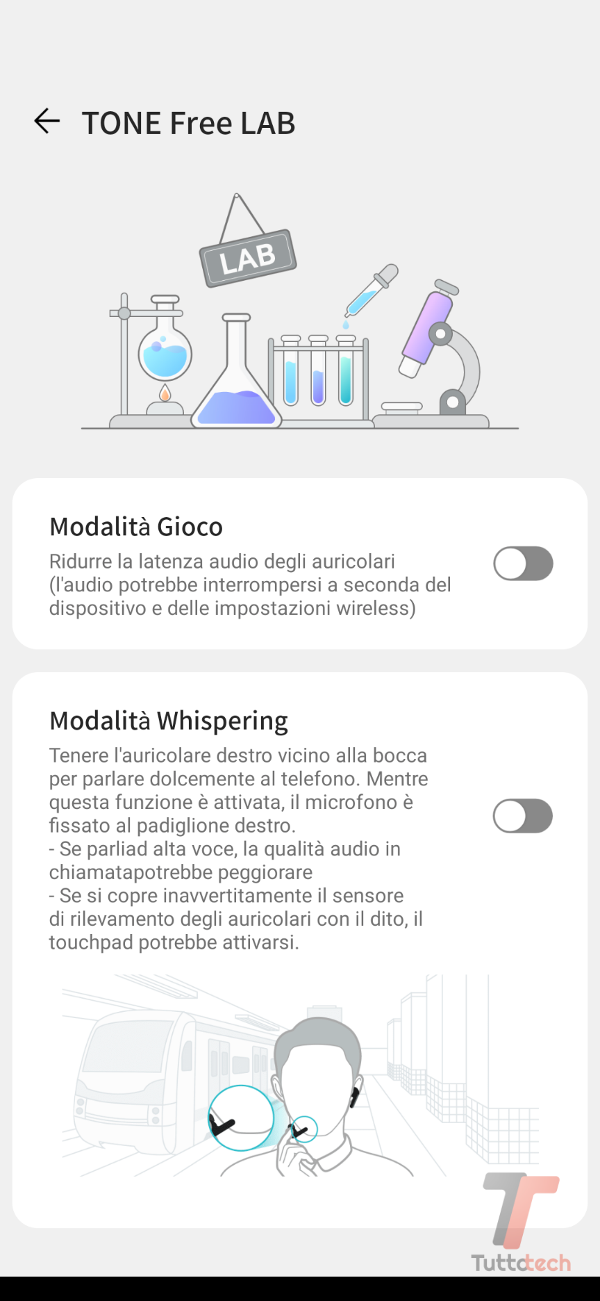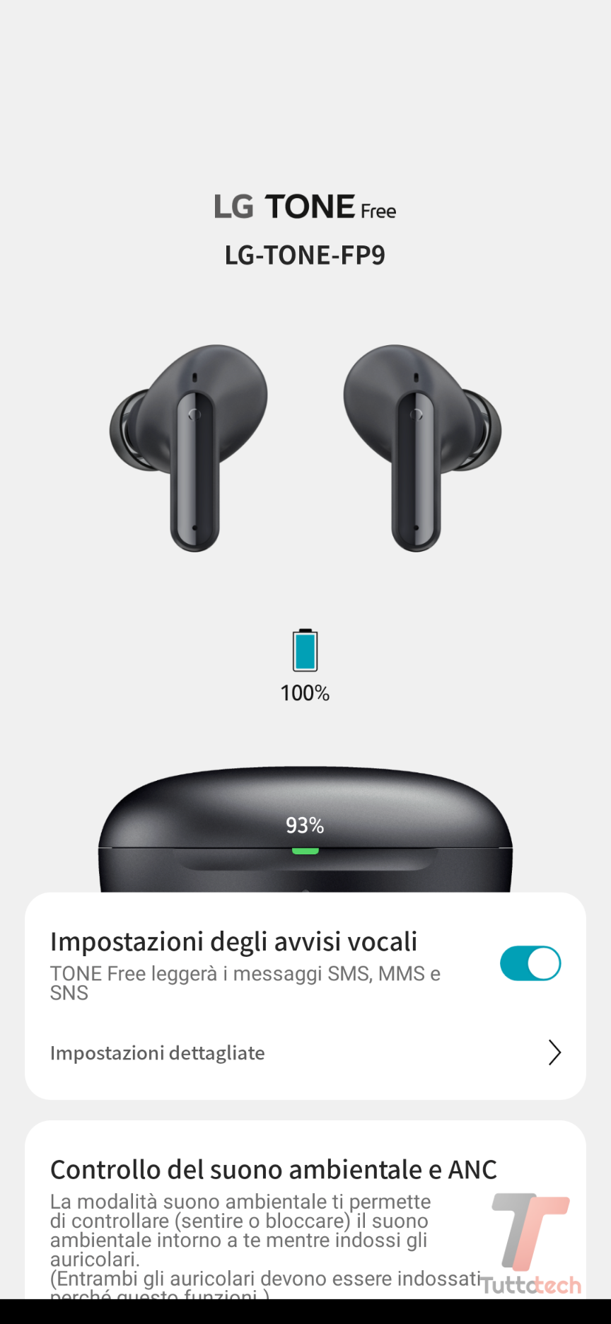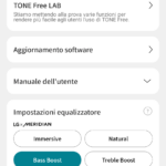 Delle cuffie di fascia alta che si rispettino però devono necessariamente essere accompagnate da un buon software e da una buona applicazione e così è per le LG TONE Free FP9. Le stiamo usando da un mesetto e non c’è stato un problema, non c’è stato un bug e non c’è stato mai un intoppo di alcun genere finora: sono sempre pronte, reattive, stabili e affidabili, in ogni condizione. Il loro punto di forza sotto questo profilo però è la quantità di funzioni smart di cui sono dotate e che possono essere impostate dall’applicazione: è possibile visualizzare la carica residua dei due auricolari e del case, attivare, disattivare e impostare la lettura dei messaggi e delle notifiche, gestire l’ANC e il suono ambientale, attivare il blocco del touchpad quando non è in uso, gestire l’equalizzazione, attivare e disattivare le funzioni sperimentali in fase di test, attivare, disattivare e impostare le azioni sui touchpad, aggiornare il firmware, attivare e disattivare il play-stop quando le si indossano o si rimuovono sfruttando i due sensori di prossimità, far squillare i due auricolari e leggere il manuale utente; insomma, c’è tutto ciò che serve all’interno di un’applicazione semplice, veloce, bella graficamente e sempre al passo coi tempi, seppur non sia perfetta perché contiene qualche traduzione in italiano poco precisa e che andrebbe rivista.