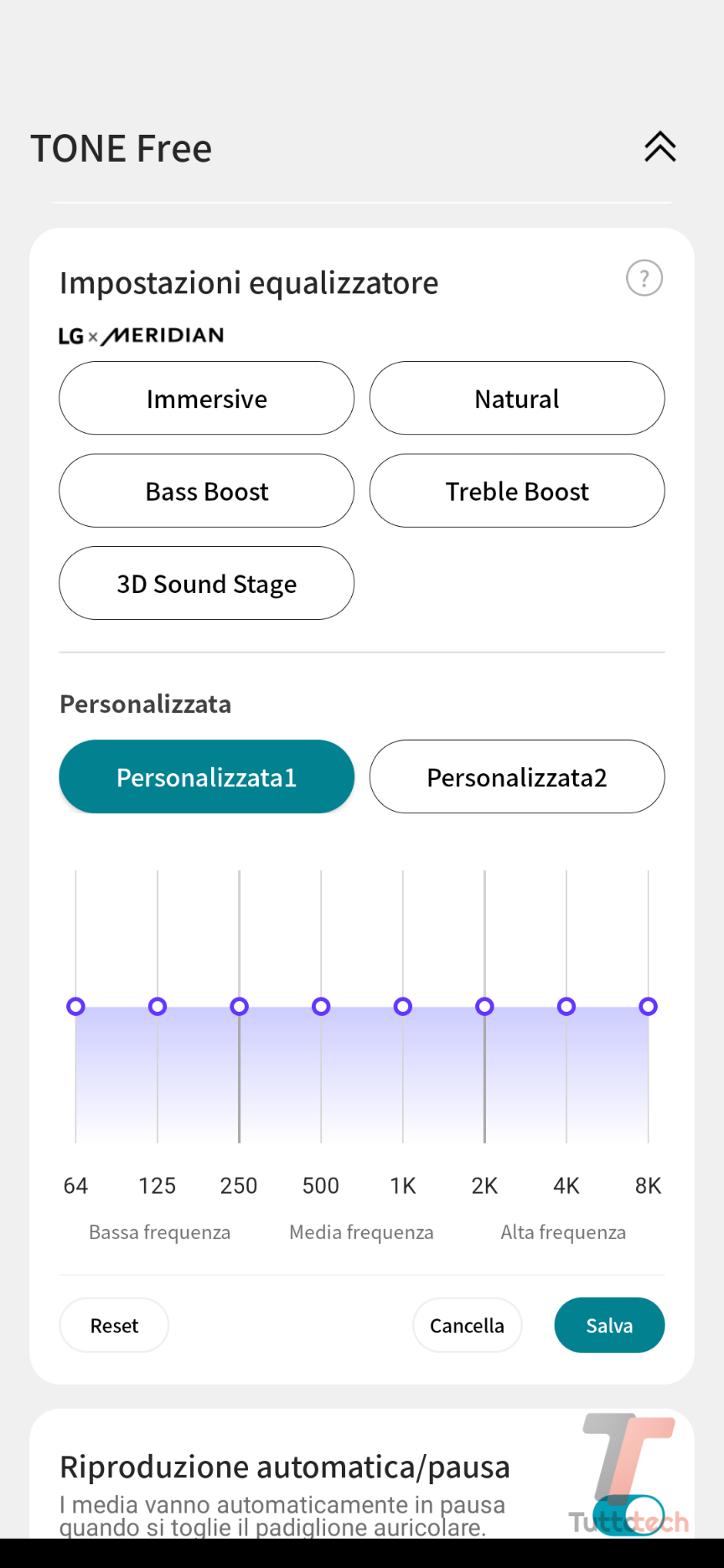 Però sappiamo che nelle cuffie ciò che conta veramente è l’audio di qualità e che, se manca questo, costruzione e design lasciano il tempo che trovano. E fortunatamente le LG TONE Free FP9 sono di prim’ordine anche sotto questo profilo ed è chiaro da subito in quanto sono realizzate in collaborazione con MERIDIAN. Suonano veramente bene perché sono capaci di riprodurre un audio sempre nitido, alto e corposo, in qualsiasi condizione ambientale e con qualsiasi traccia: non c’è differenza fra audio, bassi e tipo di riproduzione perché loro sono affidabili e stabili e forniscono una qualità audio sempre di alto livello. Poi c’è un equalizzatore molto completo che dà la possibilità di modificare le caratteristiche audio rendendo più marcati i bassi, enfatizzando la profondità, aumentando la spazialità e via dicendo con dei preset inseriti da LG, ma c’è anche la possibilità di crearne di personalizzati in modo da soddisfare pienamente le proprie esigenze.