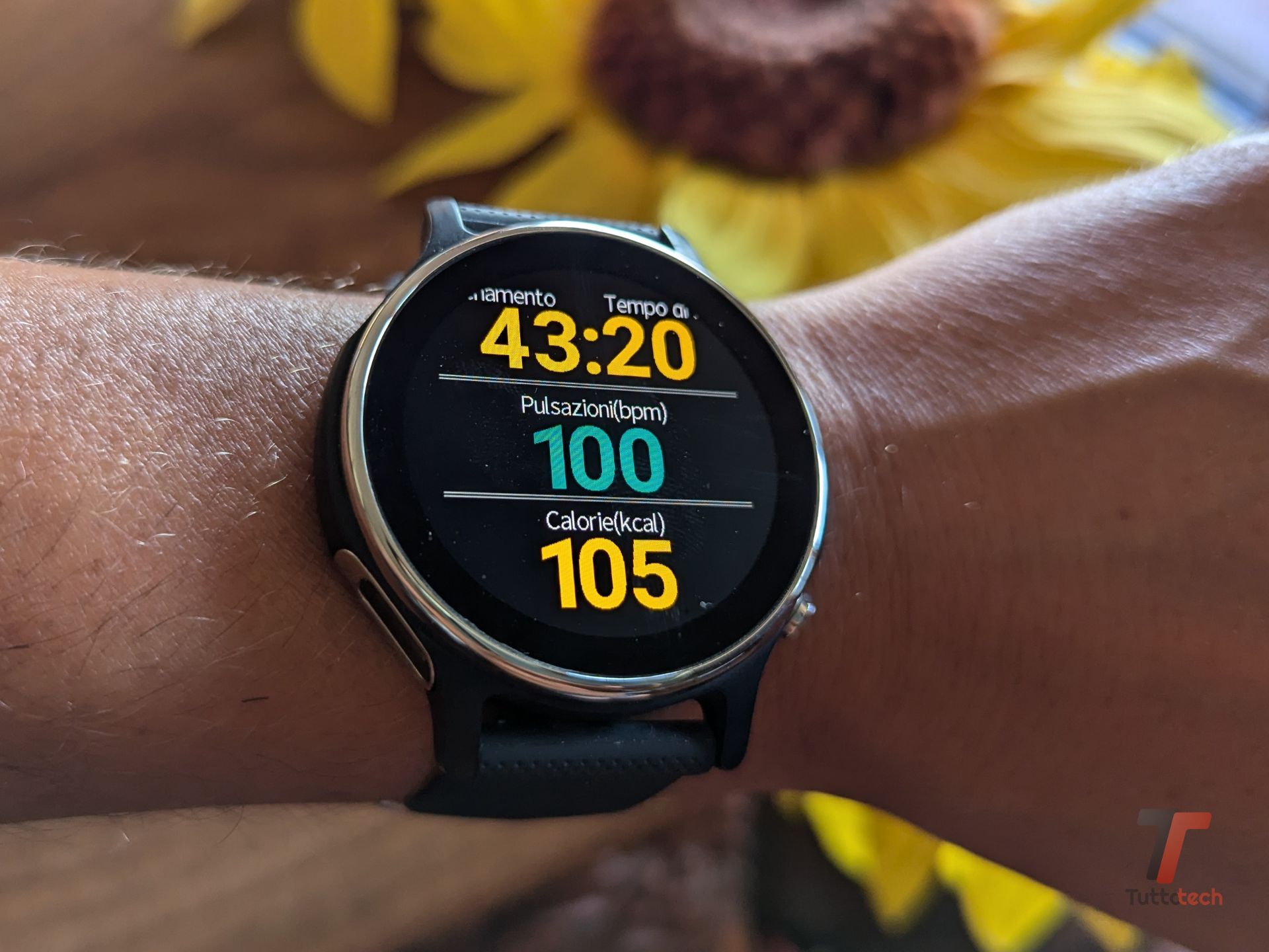 In compenso, c’è spazio per un bel display AMOLED da 1,39″ con risoluzione di 454 x 454 pixel e luminosità massima di 350 nit, che sotto la luce diretta del sole tuttavia non bastano per vedere bene le informazioni visualizzate. Peccato, perché per il resto è un bel pannello, superiore per resa rispetto allo schermo del modello precedente per ovvi motivi legati alla diversa tecnologia adottata: AMOLED invece che LCD (benché quest’ultimo sia più visibile sotto il sole).
