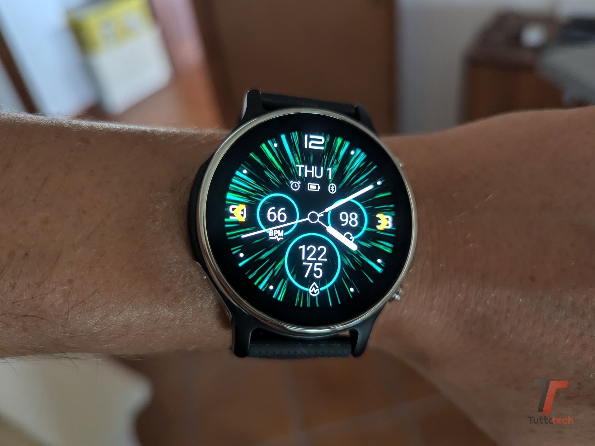 - schermo touchscreen AMOLED da 1,39″ con risoluzione di 454 x 454 pixel, 350 nit di luminosità massima e vetro Gorilla Glass 3;