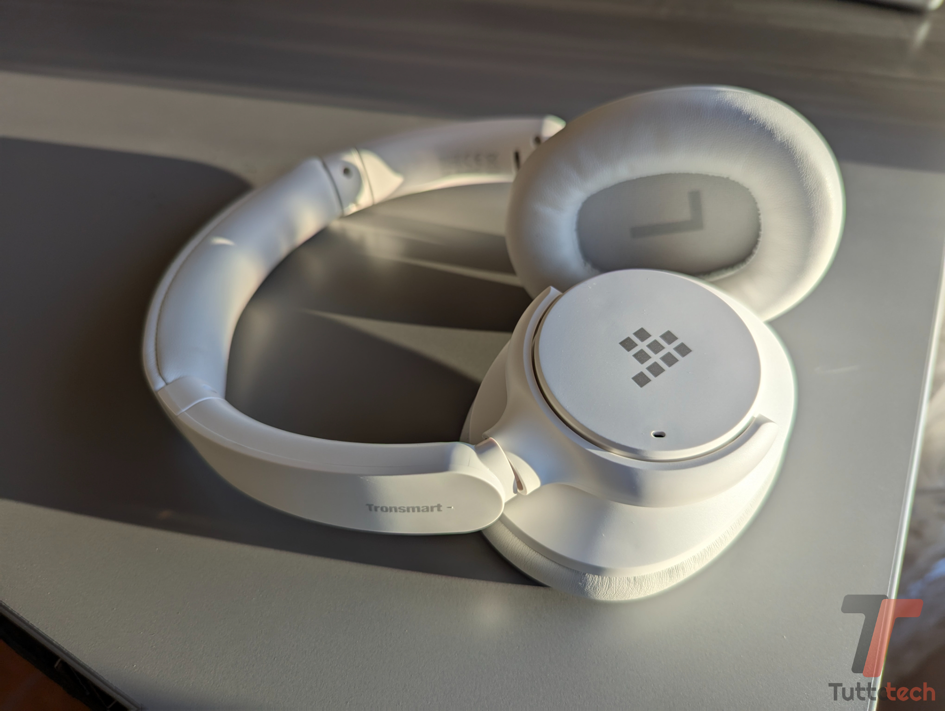 Le cuffie di Tronsmart sono più leggere e compatte rispetto alle Baseus, a nostro avviso più comode da indossare e adatte alla maggior parte delle persone. Sono in plastica anche loro, con i padiglioni auricolari grandi e una comoda imbottitura che, proprio perché più compatte, aderisce meglio all’area intorno alle orecchie isolando meglio l’audio dai rumori esterni. I padiglioni ruotano su se stessi di 90° e, come le suddette, si possono ripiegare verso l’archetto per occupare meno spazio, archetto che è imbottito al centro e si può estendere a piacimento.