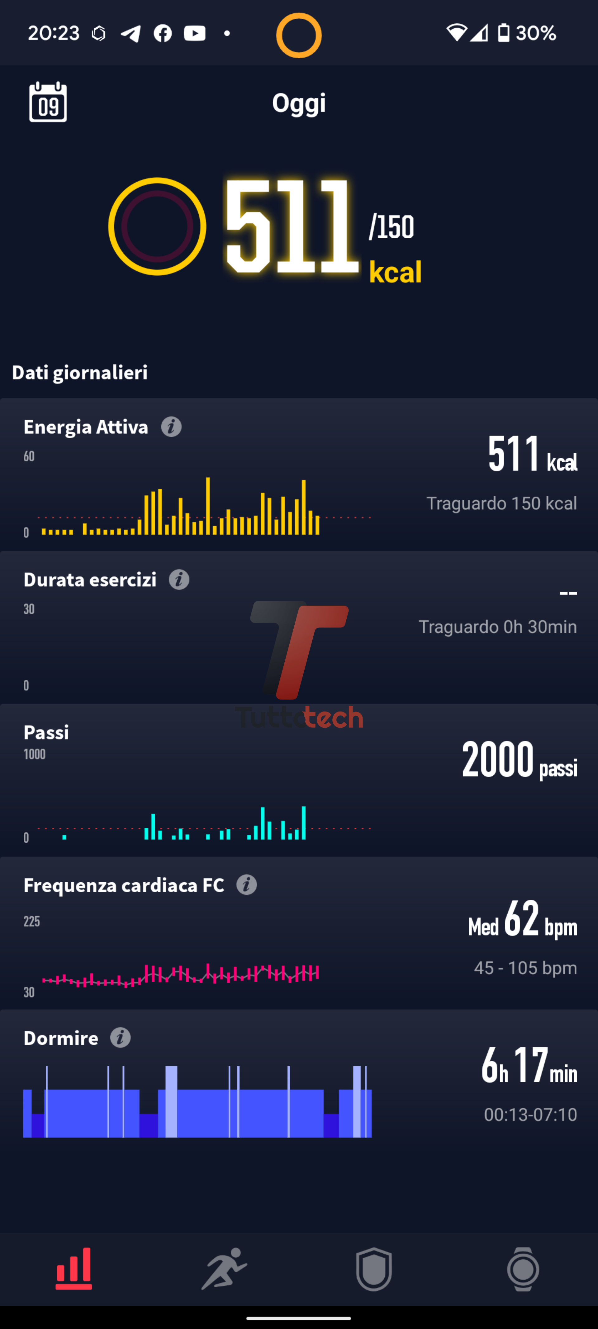 La ricarica, che avviene con un connettore a tre poli, richiede poco meno di due ore per essere completata, assicurando parecchie settimane di utilizzo continuo. Se poi disattivate le notifiche, utilizzandolo solo per l’attività sportiva e per tracciare il sonno e le attività di fitness quotidiano, superare un mese sarà tutt’altro che un’utopia.