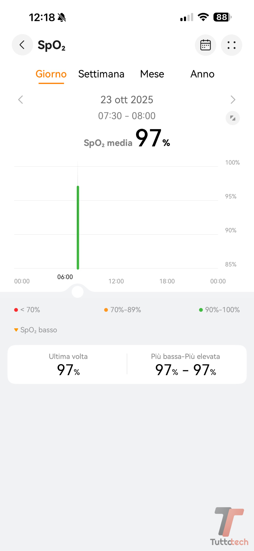 Secondo i test nell’uso intenso, si raggiungono senza problemi i 4 giorni completi con utilizzo misto (GPS, notifiche, monitoraggio continuo salute, AOD attivo). Disabilitando qualche funzione avanzata e l’always-on, si può arrivare fino a 6 giorni. Il dato critico emerge per chi viaggia spesso o fa sport ad alta intensità: con il GPS sempre attivo si arriva a circa 40 ore, un valore che non impressiona ma che resta tra i migliori nel settore “smartwatch integrato” e molto superiore ai modelli Apple Ultra o Samsung Galaxy Watch.