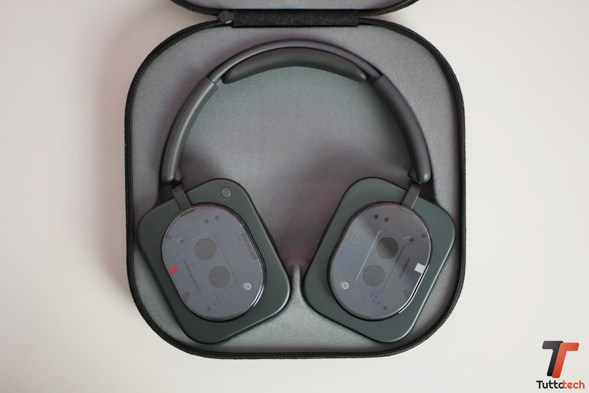 Il peso complessivo è di 329 grammi, un valore superiore alla media della categoria ma ben distribuito lungo l’archetto e i padiglioni. Una volta indossate non risultano affaticanti, nemmeno dopo sessioni d’ascolto prolungate. La combinazione tra cuscinetti in memory foam e un’ottima distribuzione della pressione permette un utilizzo continuativo senza alcun fastidio, anche durante spostamenti o lunghe ore di lavoro. Molto apprezzata la custodia flat, pensata per il trasporto in zaino o in borsa, compatta, ben rifinita e perfettamente integrata nel linguaggio stilistico Nothing. Anche la vestibilità al collo, spesso trascurata in altre soluzioni over-ear, è sorprendentemente comoda. Le cuffie si adagiano con naturalezza senza ingombrare.