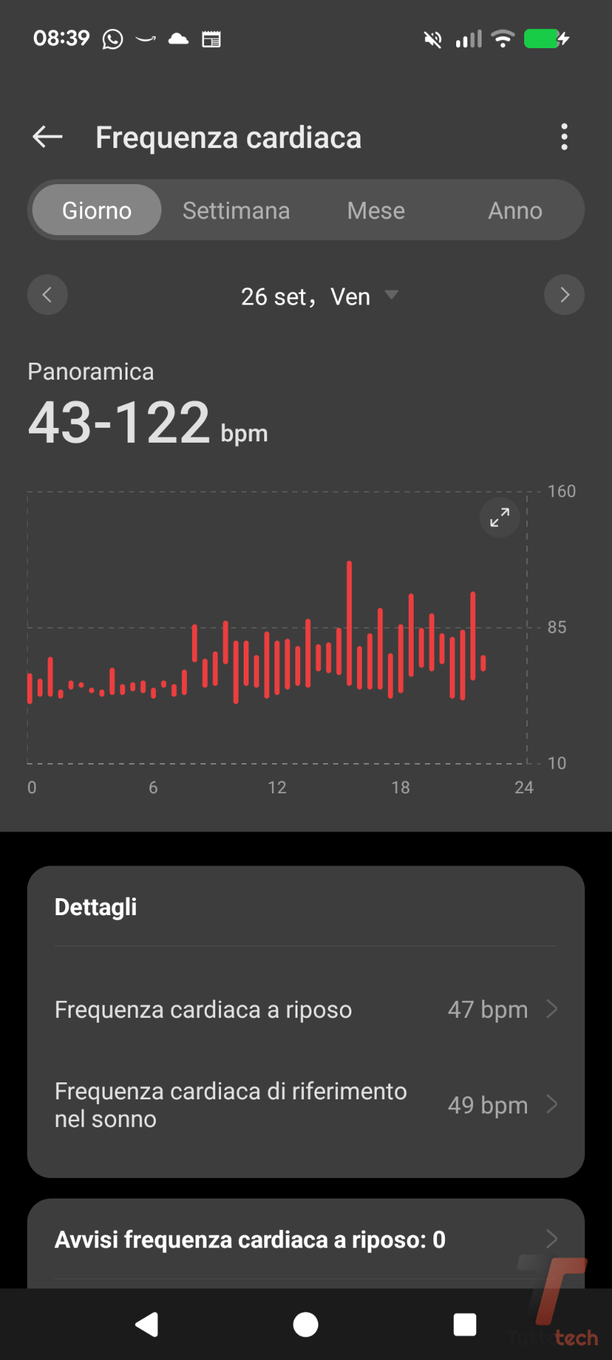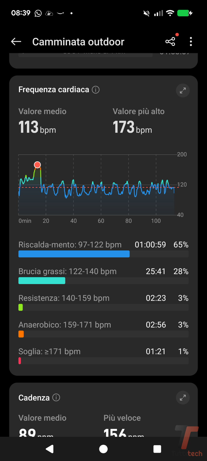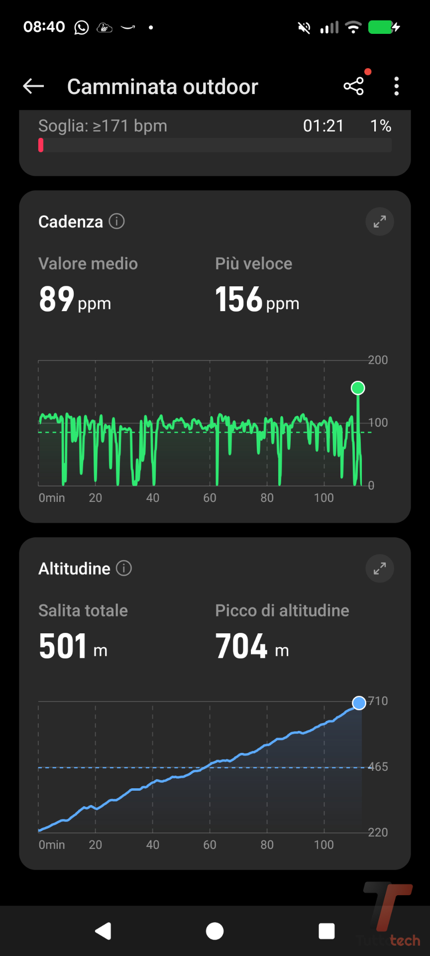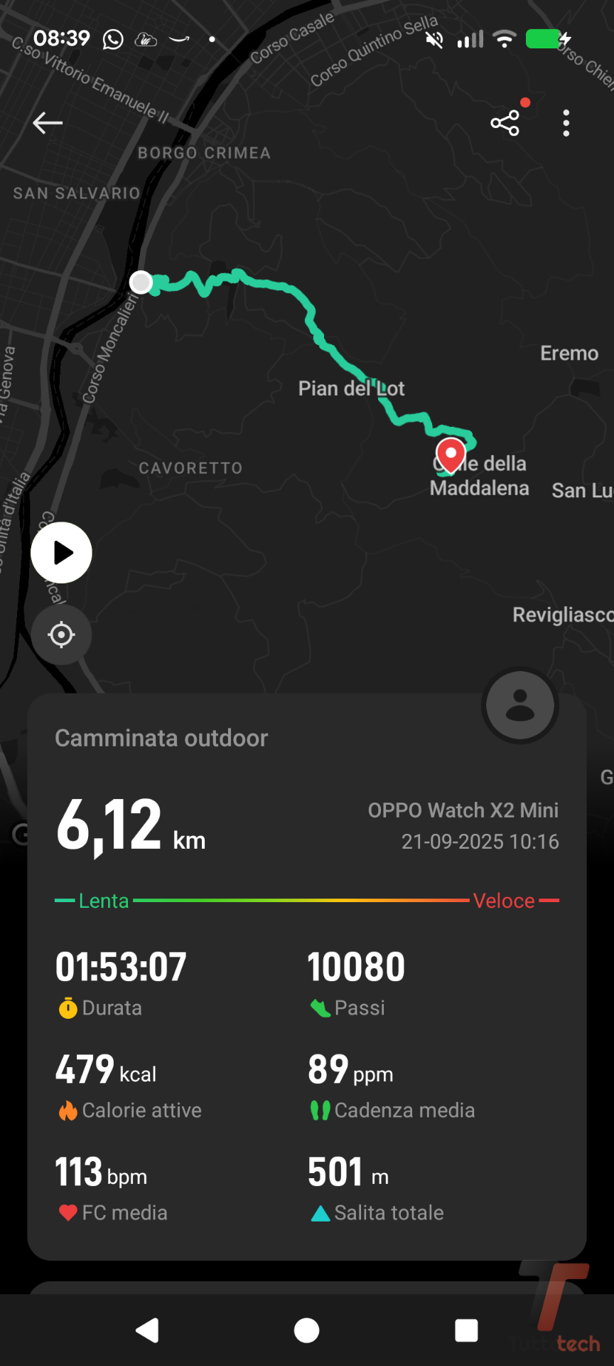 Il confronto con i principali concorrenti resta favorevole: un Galaxy Watch 8 da 40 mm fatica a coprire giorno + notte, mentre X2 Mini si usa senza patemi 24 ore su 24 e poi si ricarica al mattino per affrontare la nuova giornata. A proposito di ricarica: è piuttosto rapida, serve circa un’ora per il 100% ma il 50% arriva in appena 15 minuti.