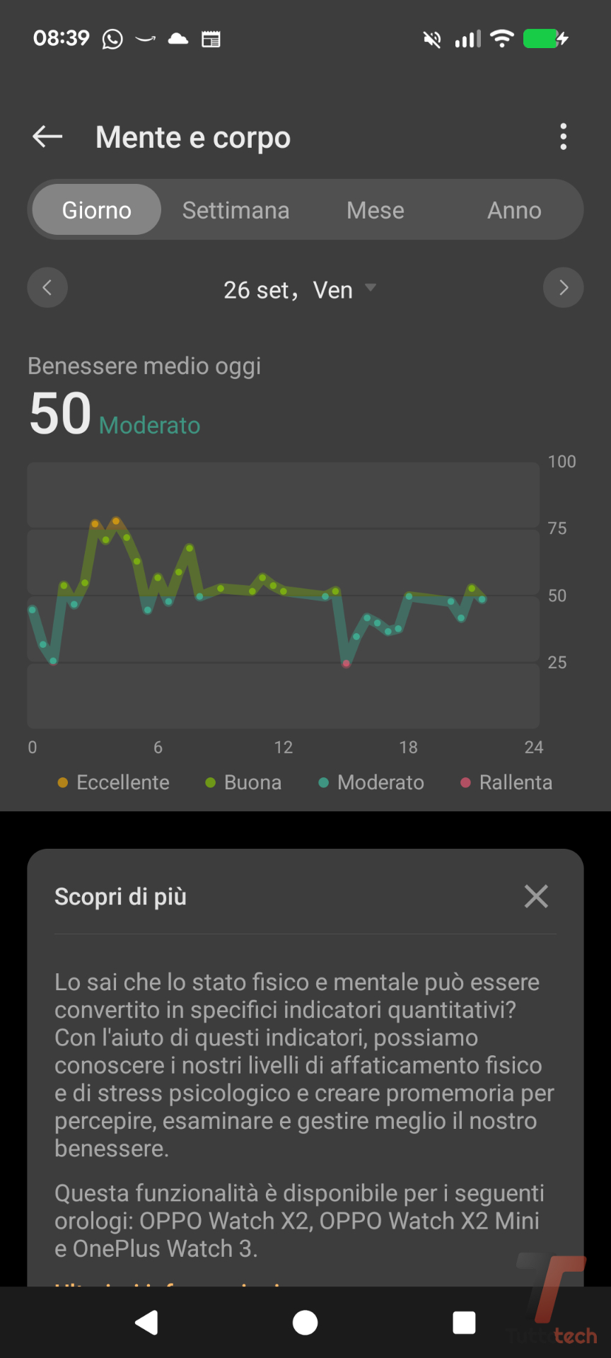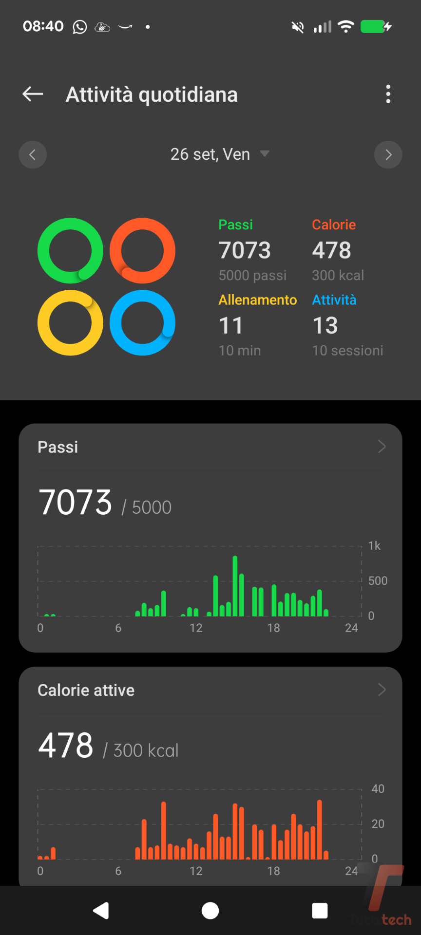 Nel quotidiano, però, X2 Mini si difende bene: in modalità Smart si porta a casa un giorno e mezzo (36 ore), spesso sfiora i due. E quando scende sotto una certa soglia si può sempre passare alla modalità a risparmio energetico con RTOS, che estende sensibilmente l’autonomia a costo di rinunciare a qualche funzione smart.