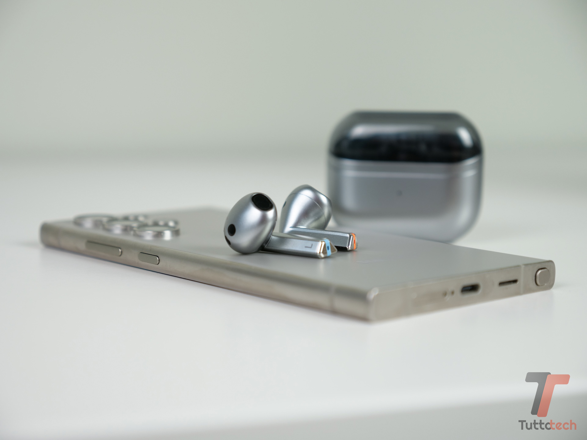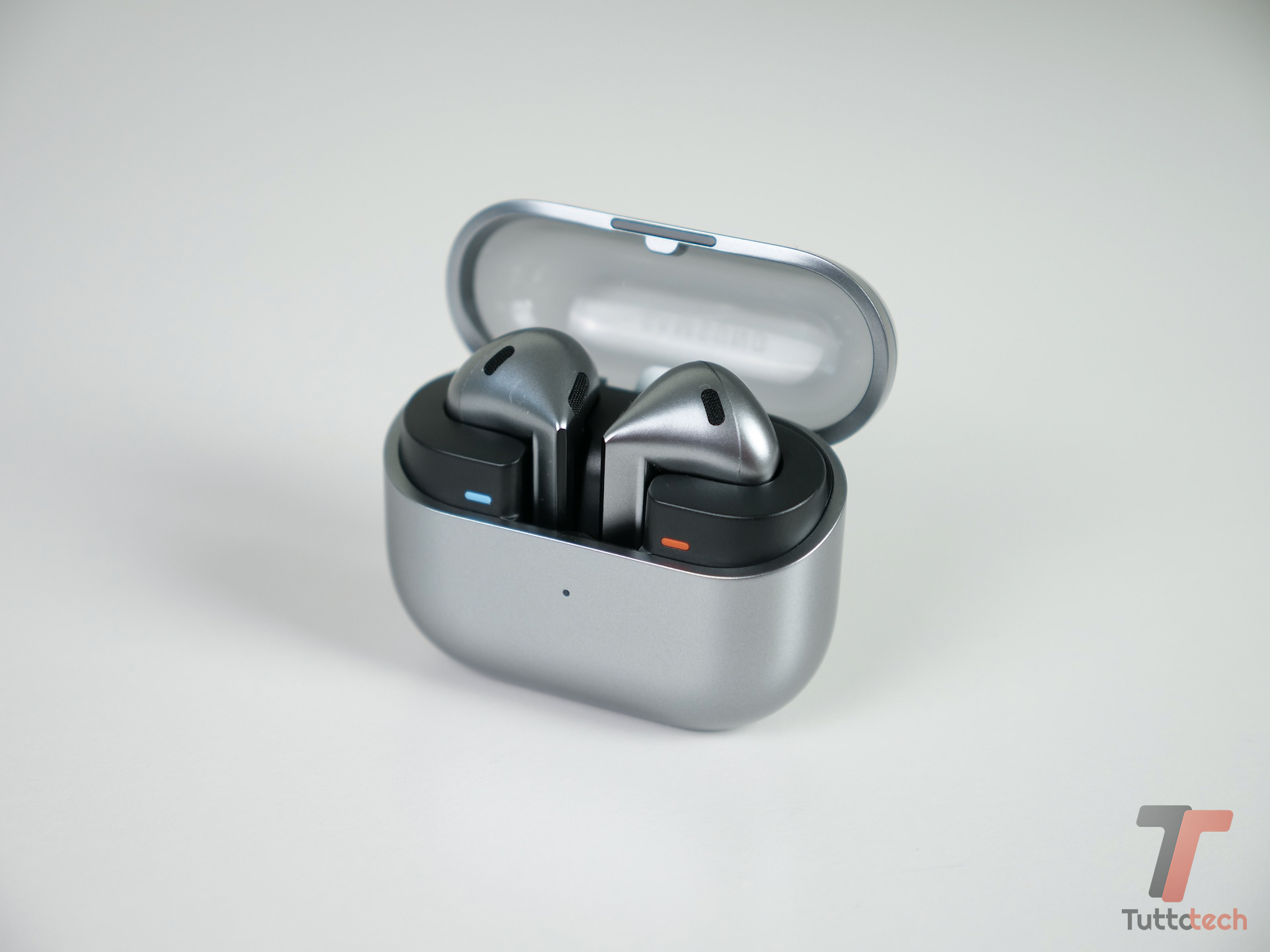 Tornando sul design, uno degli aspetti più critici in genere delle cuffie con questo formato è la stabilità quando indossate. Durante i nostri test le Galaxy Buds3 si sono dimostrate efficaci con solo una leggera tendenza a cadere da parte dell’auricolare sinistro durante l’attività fisica intensa, a sottolineare che la conformità dell’orecchio è molto importante e dunque soggettivo, vanno provate.