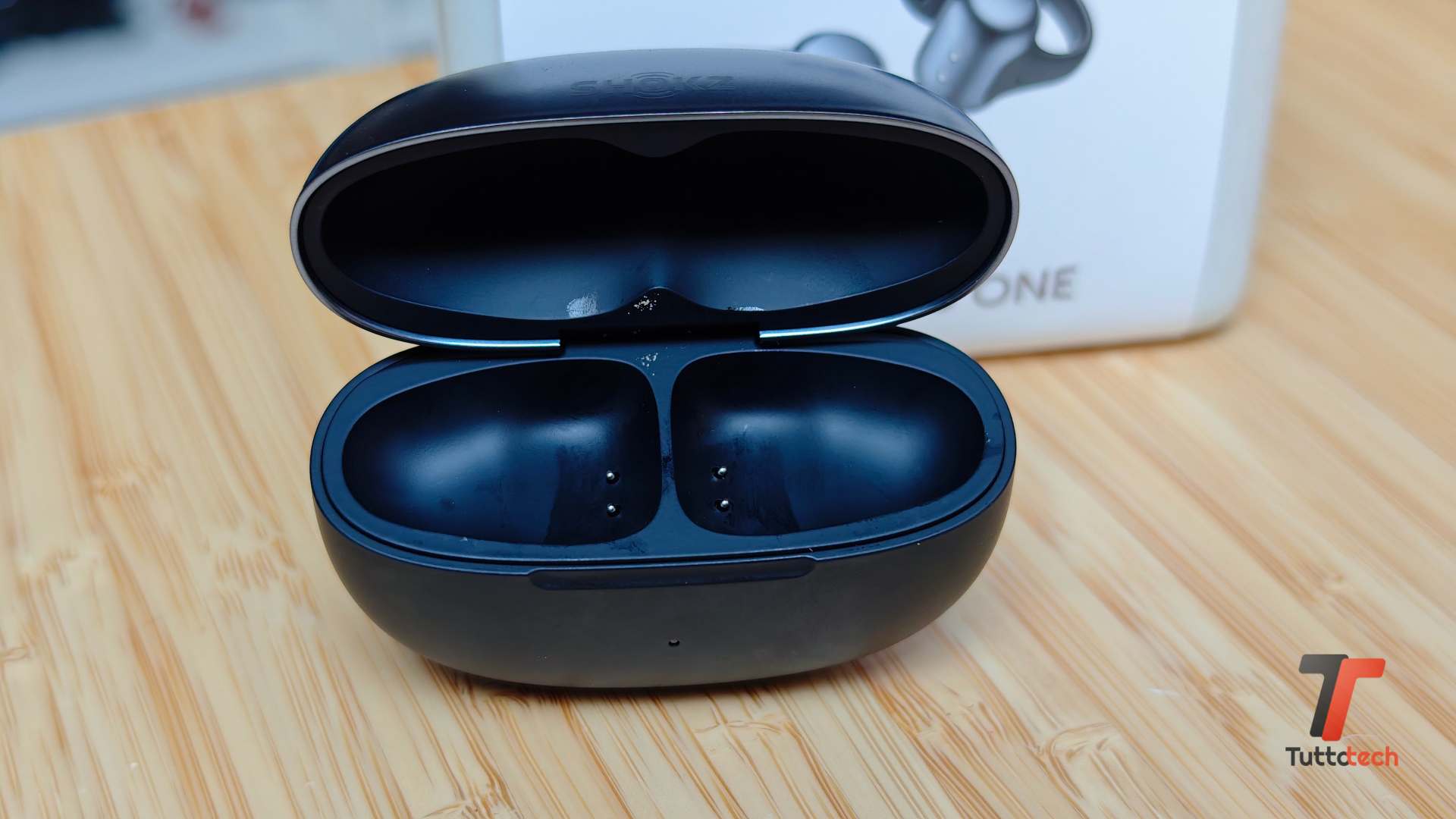 Le Shokz OpenDots ONE sono dotate di batteria agli ioni di litio, capaci di offrire fino a 10 ore di riproduzione musicale e 40 ore utilizzando la custodia di ricarica. Per quanto riguarda le chiamate invece l’autonomia supera di poco le 6 ore con una ricarica e 25 ore con la custodia. Nei nostri test siamo riusciti a raggiungere senza problemi i valori indicati, superandoli agevolmente (anche 12 re di utilizzo) mantenendo basso il volume di ascolto. Gli auricolari si ricaricano in circa 60 minuti mentre per fare il pieno alla batteria della custodia ci vogliono circa due ore col cavo e 4 ore con la ricarica wireless. E con una carica di appena 10 minuti potete utilizzare le cuffie per un paio d’ore, ottimo se avere dimenticato di caricarle e state per uscire per un allenamento.