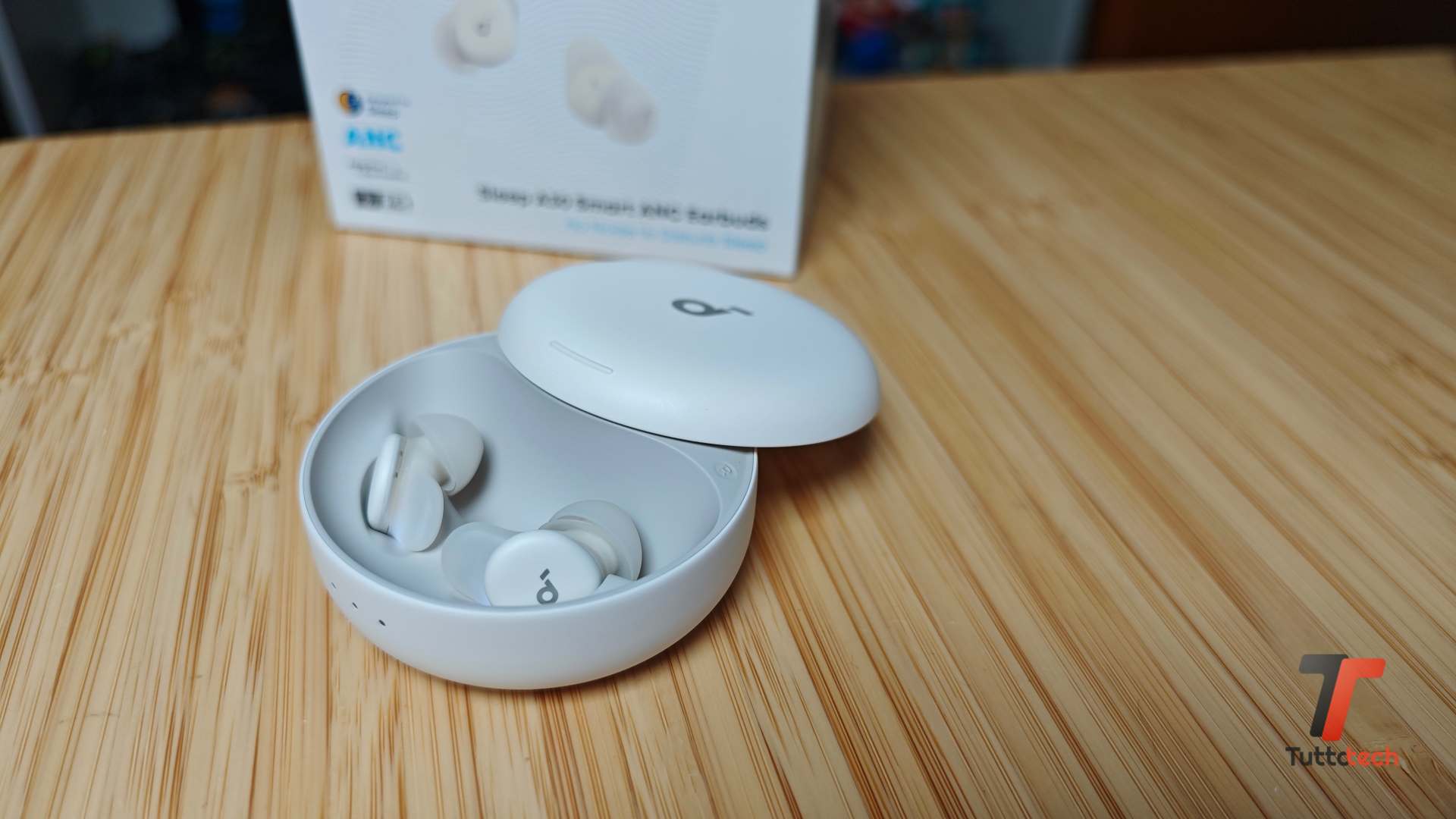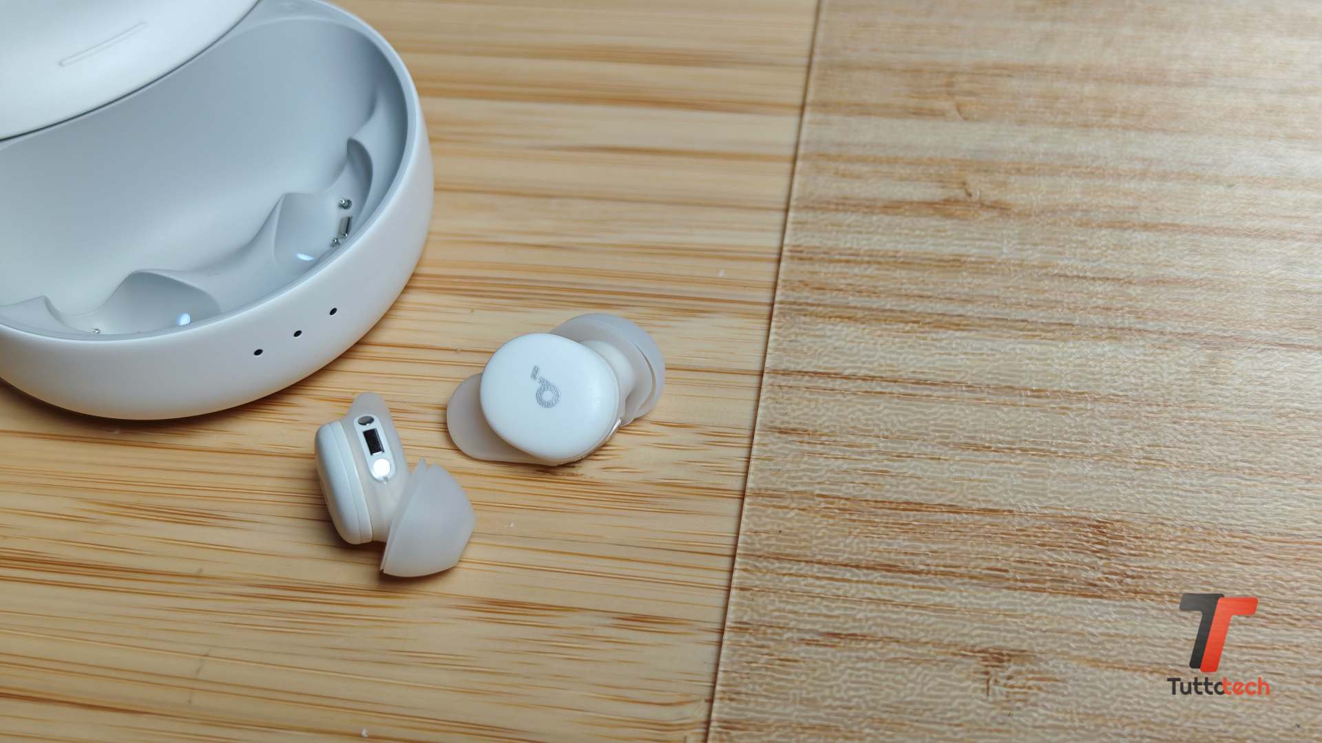 Molto semplice l’abbinamento con lo smartphone, che richiede la pressione di un tasto sulla custodia di ricarica e nulla più. Per sfruttare al meglio le funzioni offerte è ovviamente indispensabile la companion app, di cui vi parleremo meglio tra poco. La custodia, realizzata in plastica opaca, bianca nel modello da noi testato, offre una doppia possibilità di ricarica: wireless e tramite USB-C, con tre LED frontali che indicano la carica residua, visibile comunque anche tramite l’app.