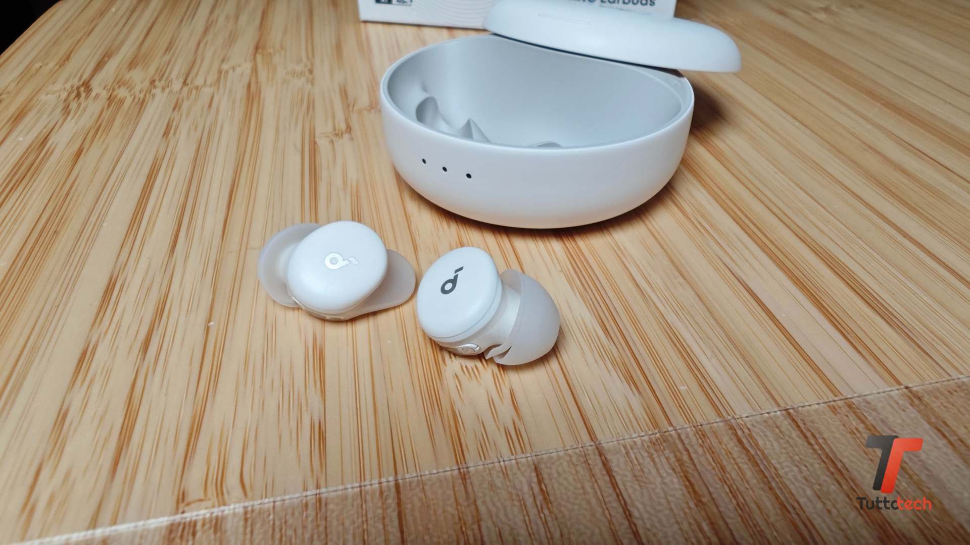 Nella confezione di vendita Soundcore ha inserito due alette interne supplementari, così da garantire il massimo comfort per chiunque, e ben 6 paia di gommini. Oltre a tre coppie in silicone, pensate per il massimo comfort, sono presenti tre coppie di gommini realizzati in memory foam, che garantiscono una maggiore stabilità e contribuiscono maggiormente a bloccare i suoni esterni, così da offrire un silenzio quasi totale. Tutto questo oltre alla coppia di gommini e alette già installate, entrambe di taglia media.