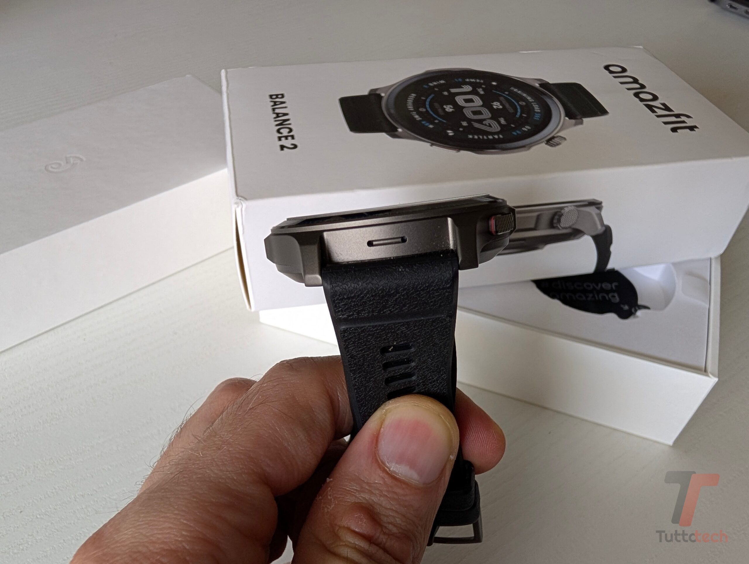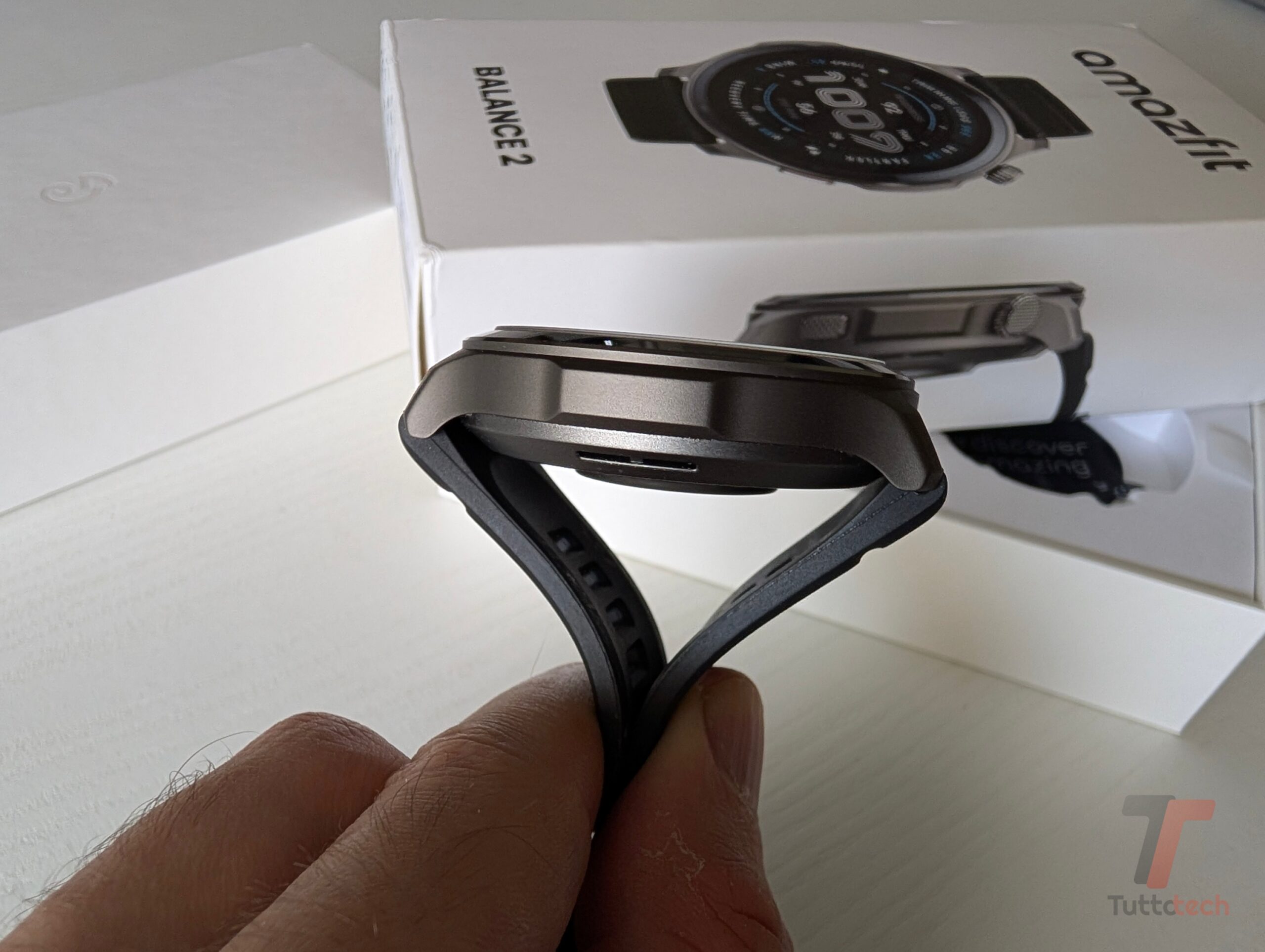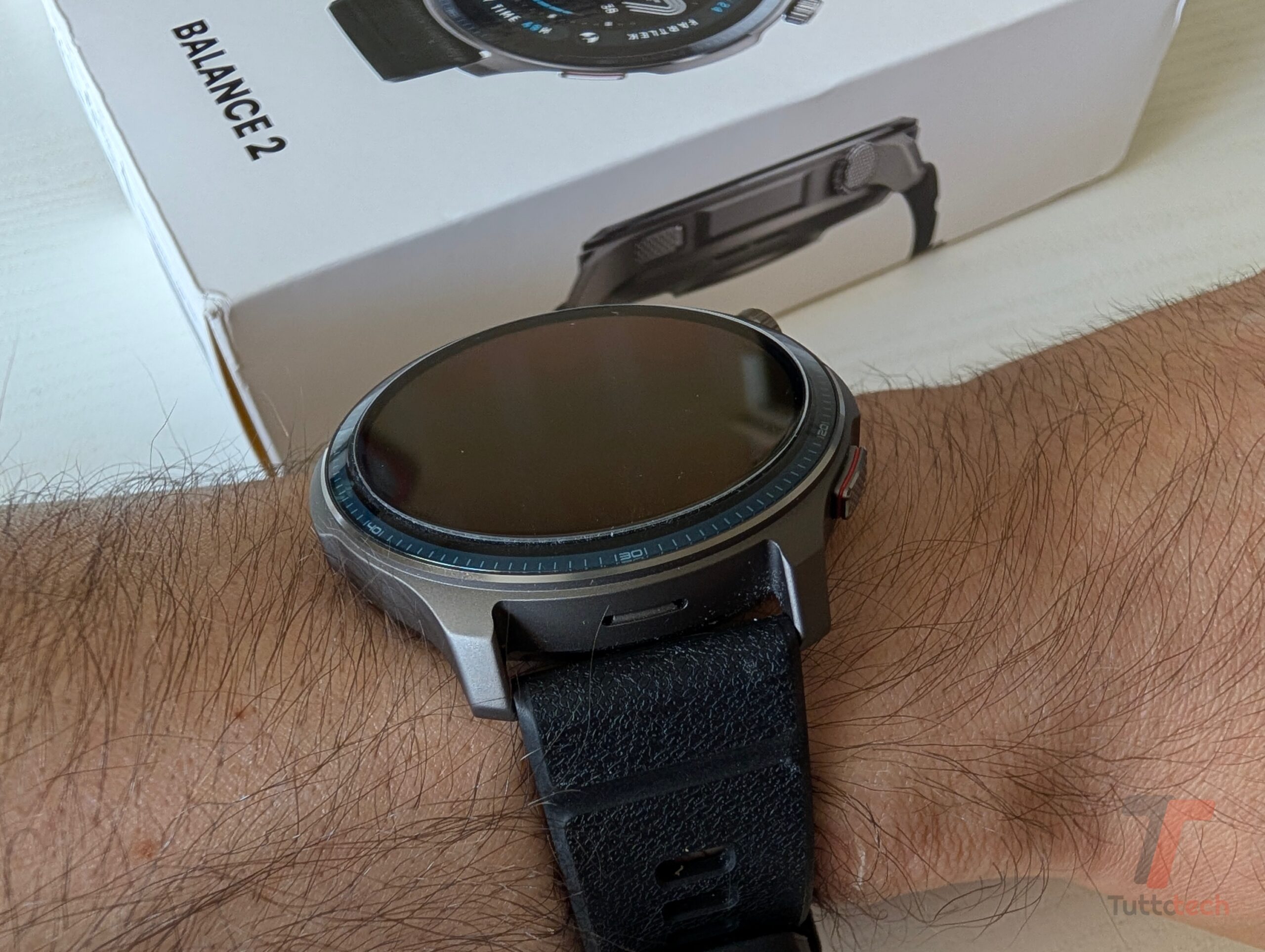 Amazfit Balance 2 riprende il design e la cassa del modello precedente e li aggiorna in chiave moderna, così da offrire un look capace di far contenti tutti, innovatori e nostalgici, e una maggiore robustezza a livello costruttivo, così da risultare alla vista e al tatto ancora più solido. E lui, infatti, è bello da vedere col suo aspetto da orologione elegante-sportivo ed è roccioso a livello fisico grazie a un assemblaggio impeccabile e a materiali di prima qualità, come alluminio, policarbonato e vetro zaffiro; in mano e al polso è veramente solido e lo è anche nell’uso di tutti i giorni, non mostrando segni di usura dopo settimane di utilizzo. Il rovescio della medaglia è che risulta bello massiccio e più grande e pesante del modello precedente, arrivando a misurare 47,4 x 47,4 x 12,3 mm e a pesare 43 g.