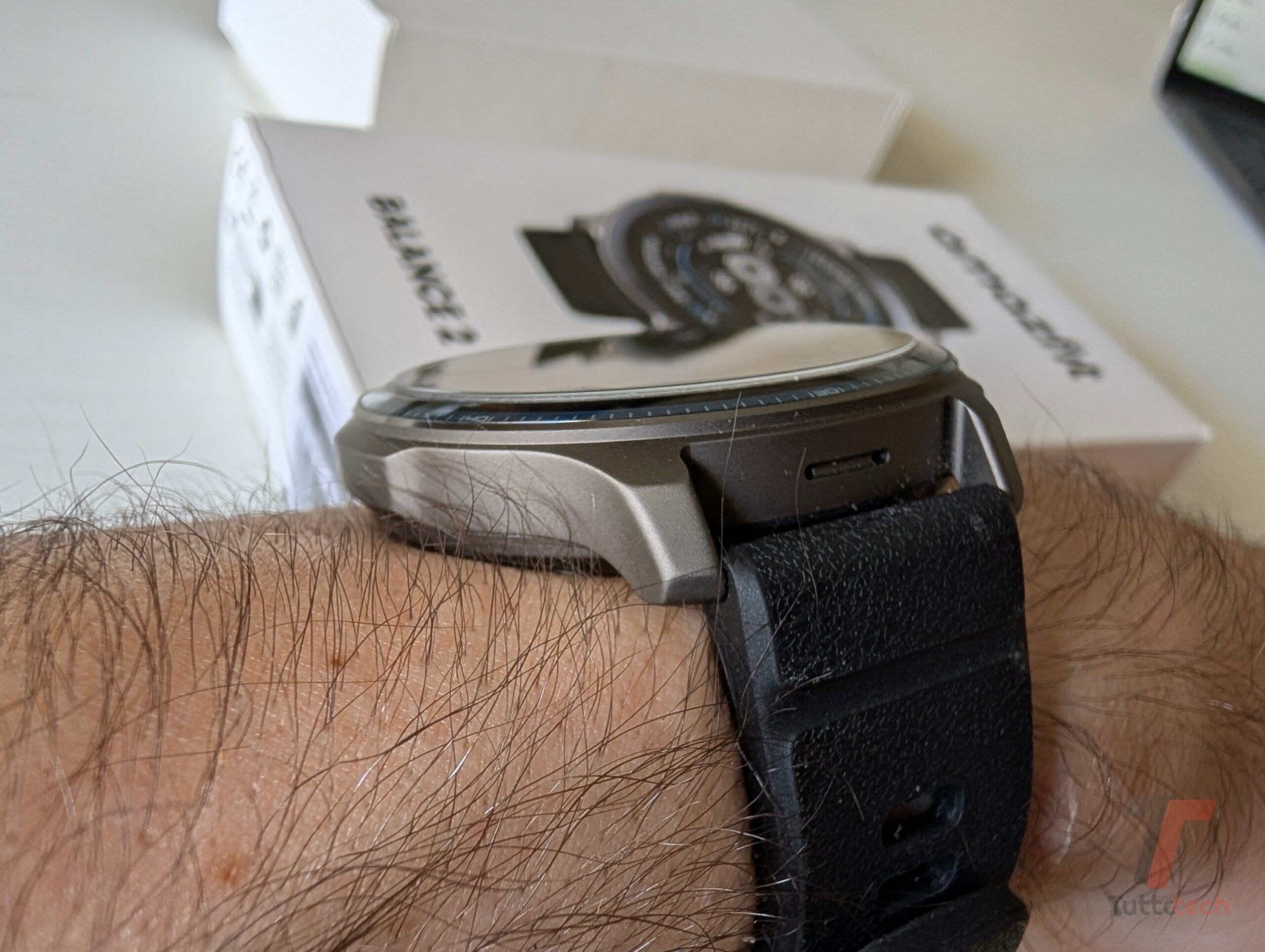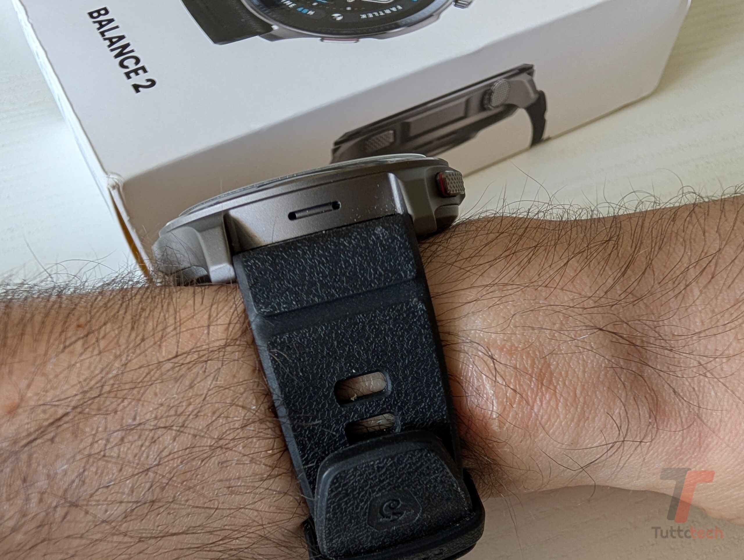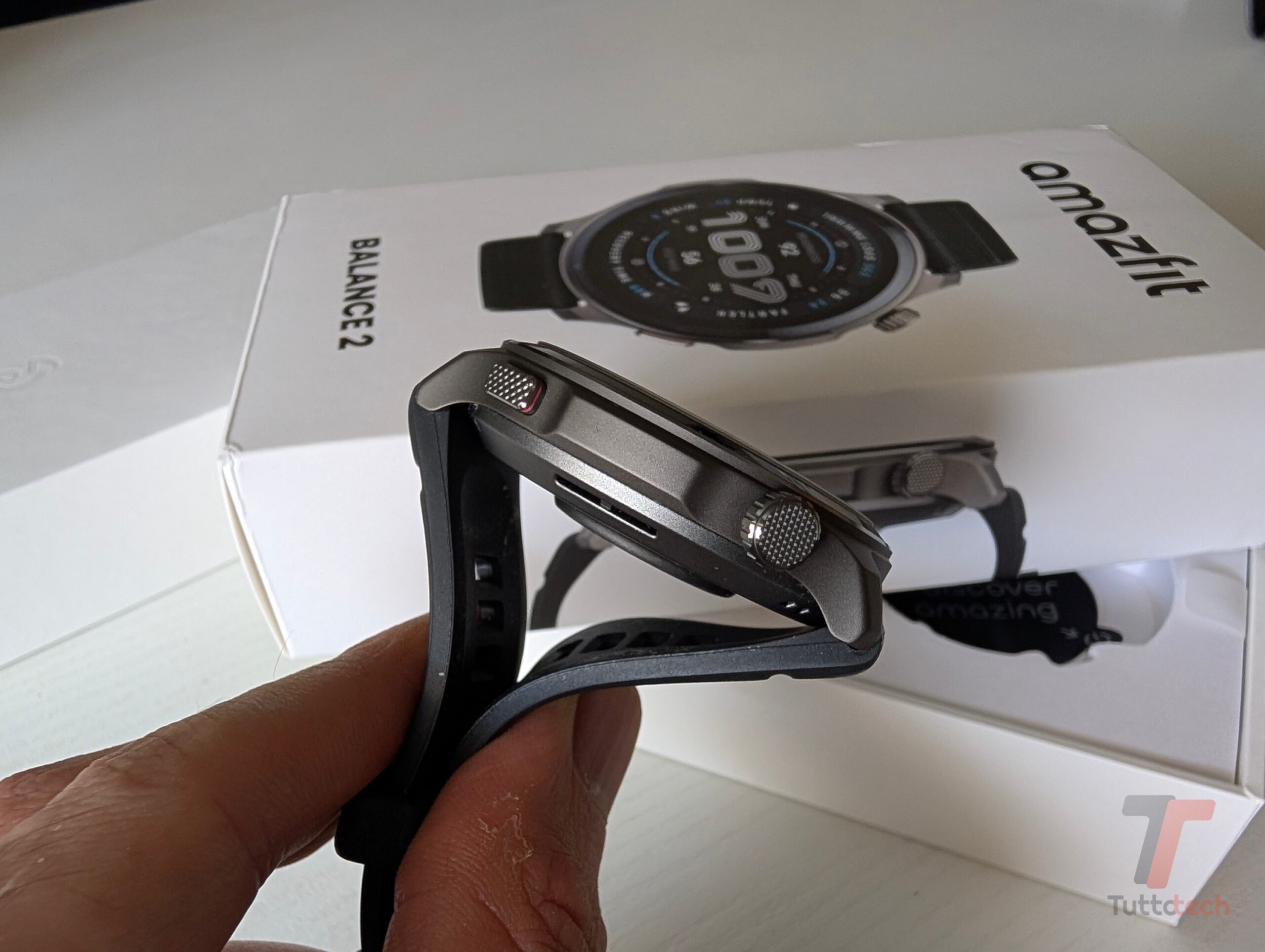 Amazfit Balance 2 riprende il design e la cassa del modello precedente e li aggiorna in chiave moderna, così da offrire un look capace di far contenti tutti, innovatori e nostalgici, e una maggiore robustezza a livello costruttivo, così da risultare alla vista e al tatto ancora più solido. E lui, infatti, è bello da vedere col suo aspetto da orologione elegante-sportivo ed è roccioso a livello fisico grazie a un assemblaggio impeccabile e a materiali di prima qualità, come alluminio, policarbonato e vetro zaffiro; in mano e al polso è veramente solido e lo è anche nell’uso di tutti i giorni, non mostrando segni di usura dopo settimane di utilizzo. Il rovescio della medaglia è che risulta bello massiccio e più grande e pesante del modello precedente, arrivando a misurare 47,4 x 47,4 x 12,3 mm e a pesare 43 g.