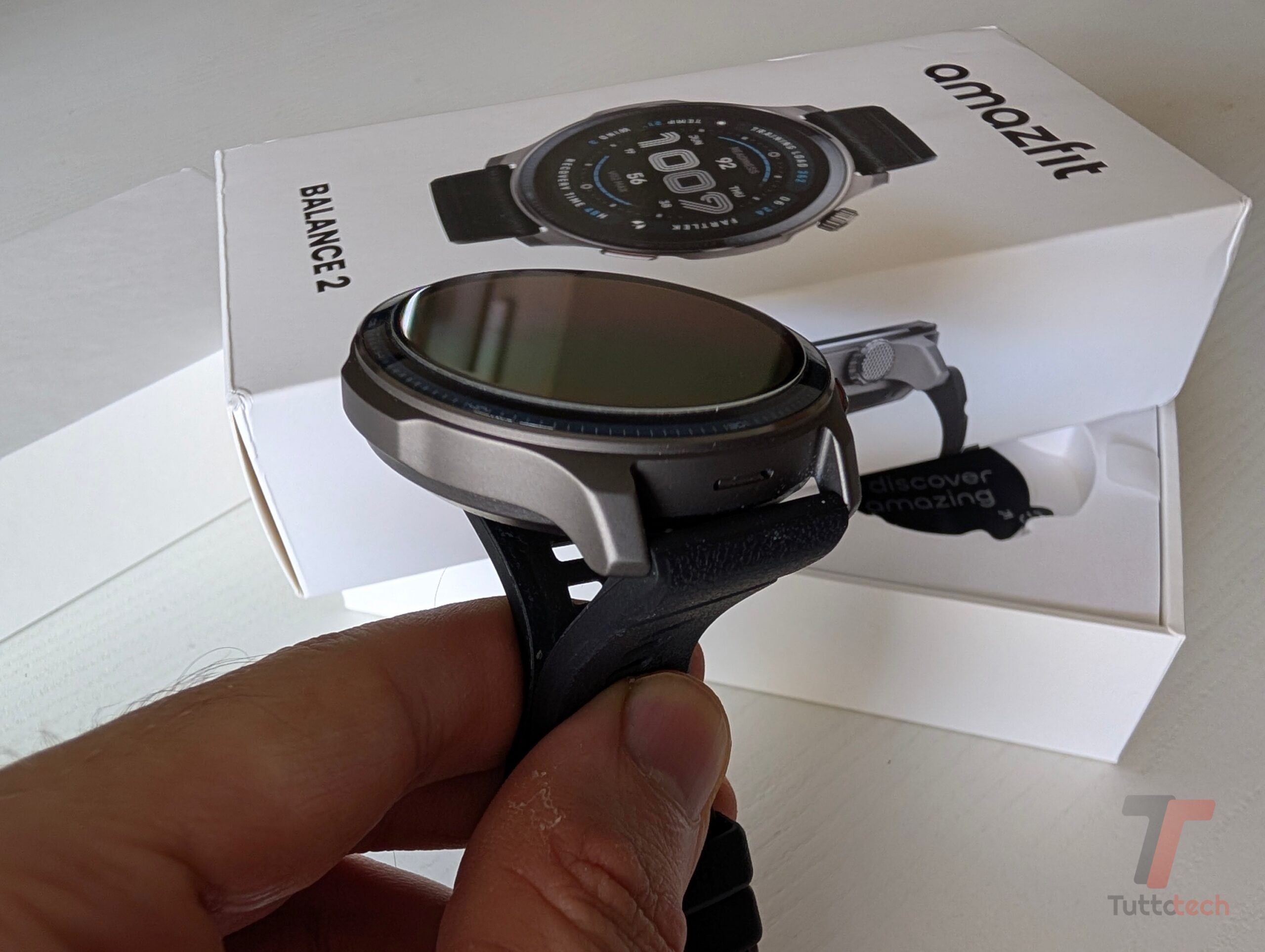 Partiamo dalla confezione perché è la prima cosa che salta all’occhio una volta che lui arriva a casa. È di forma rettangolare, giusto per anticipare che nasconde uno smartwatch, e al suo interno contiene non solo Amazfit Balance 2 con tanto di basetta di ricarica e manuali ma anche ben due cinturini in silicone, uno di colore nero e uno di colore arancione: perciò include ben due cinturini di colore diverso, da utilizzare come ricambio o per creare la propria combinazione preferita. All’arrivo non c’è alcun cinturino agganciato ad Amazfit Balance 2, perciò ne va scelto uno e poi con tanta buona pazienza va aggiunto al dispositivo nudo e crudo. Tutti e due i cinturini sono fatti dello stesso materiale, immaginiamo silicone, e alla vista non risultano granché perché sembrano di bassa qualità, però in realtà sono ottimi perché non irritano neppur minimamente la pelle, anche se ben stretti, e non mostrano alcun segno di usura anche a distanza di settimane.