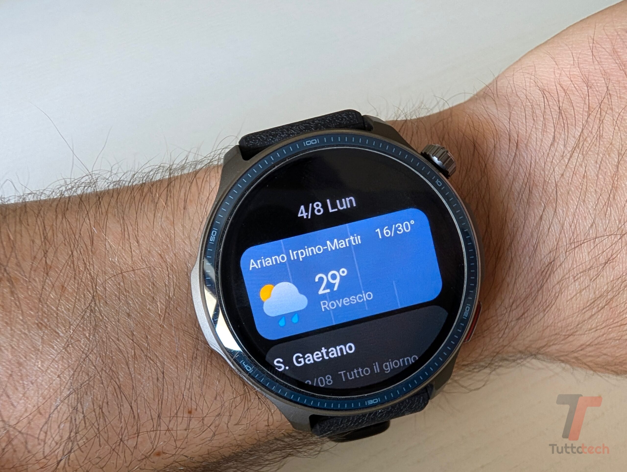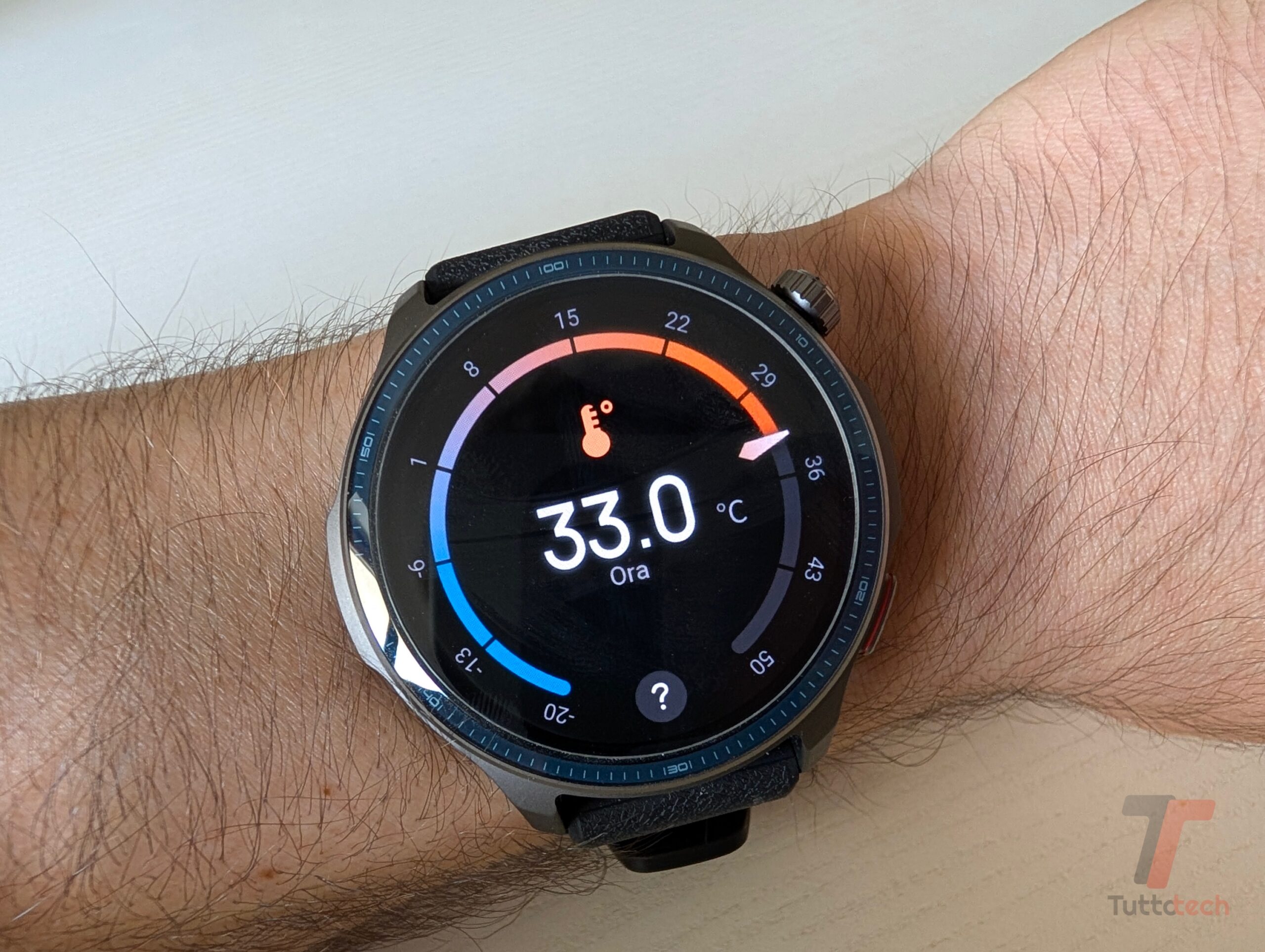 Fisicamente include i soliti elementi e cioè i fori per i due altoparlanti, il microfono e il barometro, due tasti fisici di cui uno zigrinato e uno a rotella, entrambi solidi e con un bel clic alla pressione, i pin per la ricarica tramite basetta, i sensori vari nella parte inferiore e un bel display AMOLED che risulta estremamente luminoso e molto ben definito e vivido. Nulla di spiacevole da dire qui perché lui è bello, al netto delle preferenze soggettive, è costruito molto bene, seppur questo significhi dimensioni e peso maggiori rispetto al predecessore, e possiede tutto ciò che serve per durare nel tempo ed essere facile da usare, soprattutto se si pensa al tasto a rotella per navigare nel sistema e all’eccellente display protetto da un vetro zaffiro. E, per finire, c’è una sua caratteristica che potrebbe sembrare banale ma che nella vita di tutti i giorni fa la differenza in positivo: grazie ai nuovi materiali di cui è composta la parte inferiore, la zona dei sensori resta sempre pulita e libera per far sì che le misurazioni siano sempre precise e questo anche sudando, sporcandosi, indossandolo in modo aderente e non pulendolo mai; questa cosa è ottima perché il modello precedente nel giro di qualche giorno accumulava sporcizia e pelle morta sui sensori, anche non sudando, e questa cosa talvolta impediva le misurazioni da parte dei sensori, tanto da richiederne una pulizia.