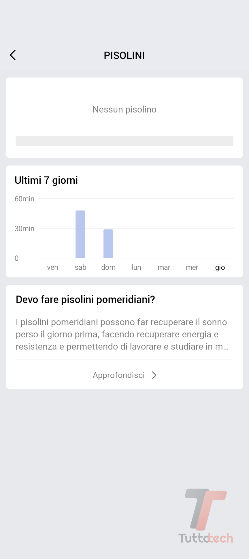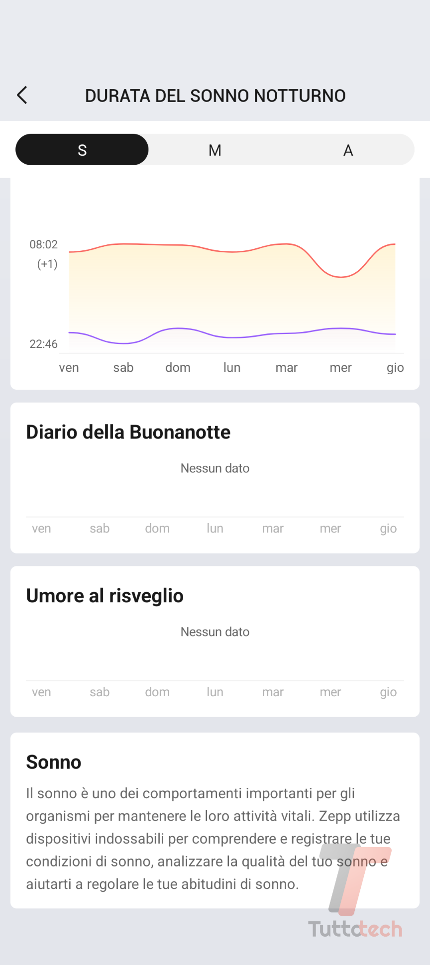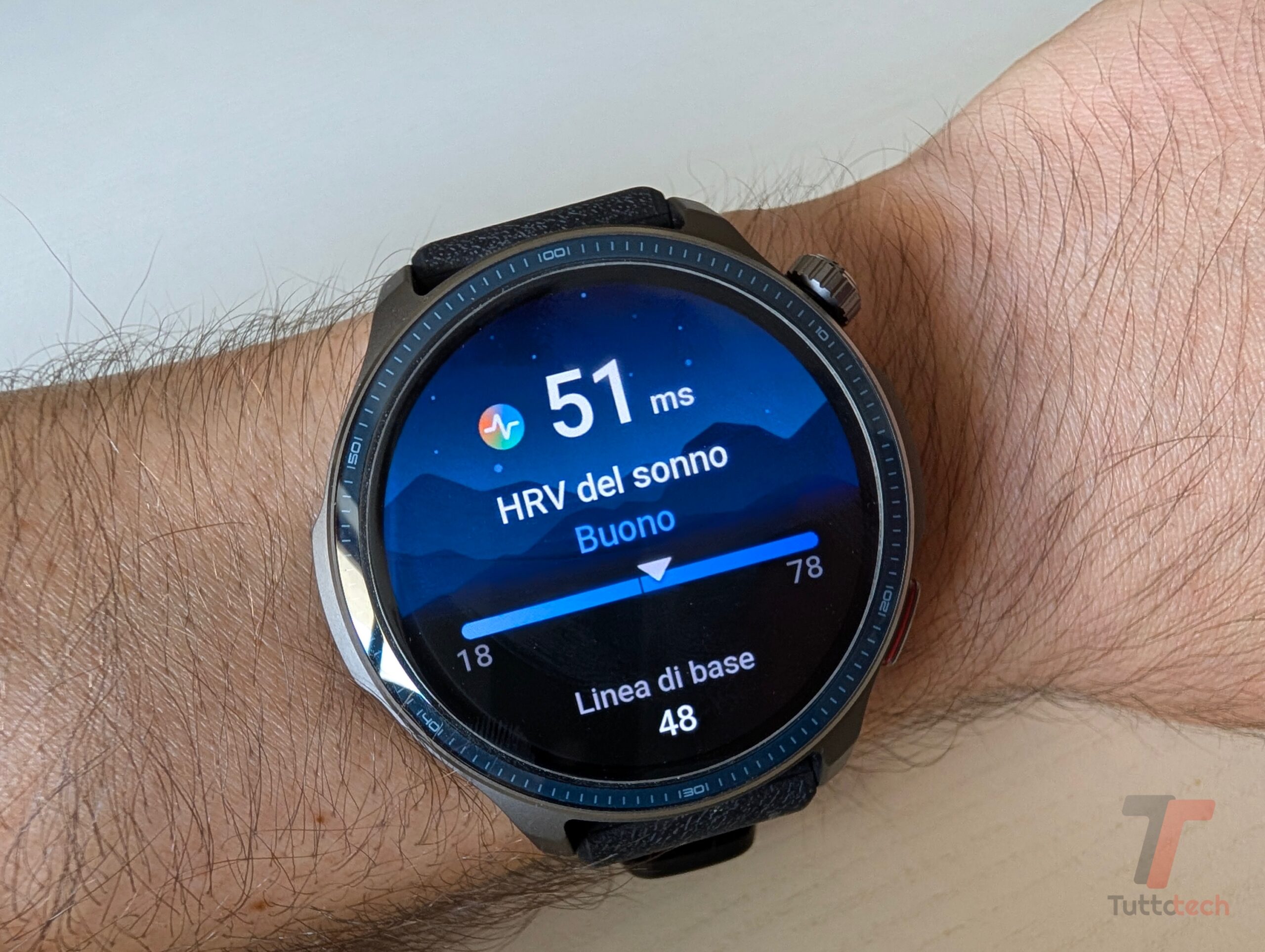 Amazfit Balance 2 è un vero e proprio coach per il sonno perché è in grado di raccogliere una enorme quantità di dati e di fornire report dettagliati su ogni elemento che lo caratterizza, con tanto di grafici, andamenti e suggerimenti utili per migliorarlo. Lui registra i pisolini, l’HRV, i periodi di veglia, il sonno leggero, il sonno profondo, le fasi REM, la temperatura cutanea, l’RHR, l’ossigeno nel sangue, la frequenza dei battiti cardiaci, la frequenza respiratoria, lo stress e le apnee, perciò tutto quello che serve per creare dei report approfonditi e attendibili sulla qualità, sulla regolarità e sulla durata del sonno. E così fa perché il tracciamento del sonno è fra i suoi punti forti e fra i migliori per quanto riguarda questo genere di prodotti: lui non sbaglia un colpo, nel senso che non capita mai che non abbia registrato qualche valore, e soprattutto è estremamente preciso nella raccolta dei dati e nel riconoscere quando ci addormentiamo e svegliamo, anche di giorno.