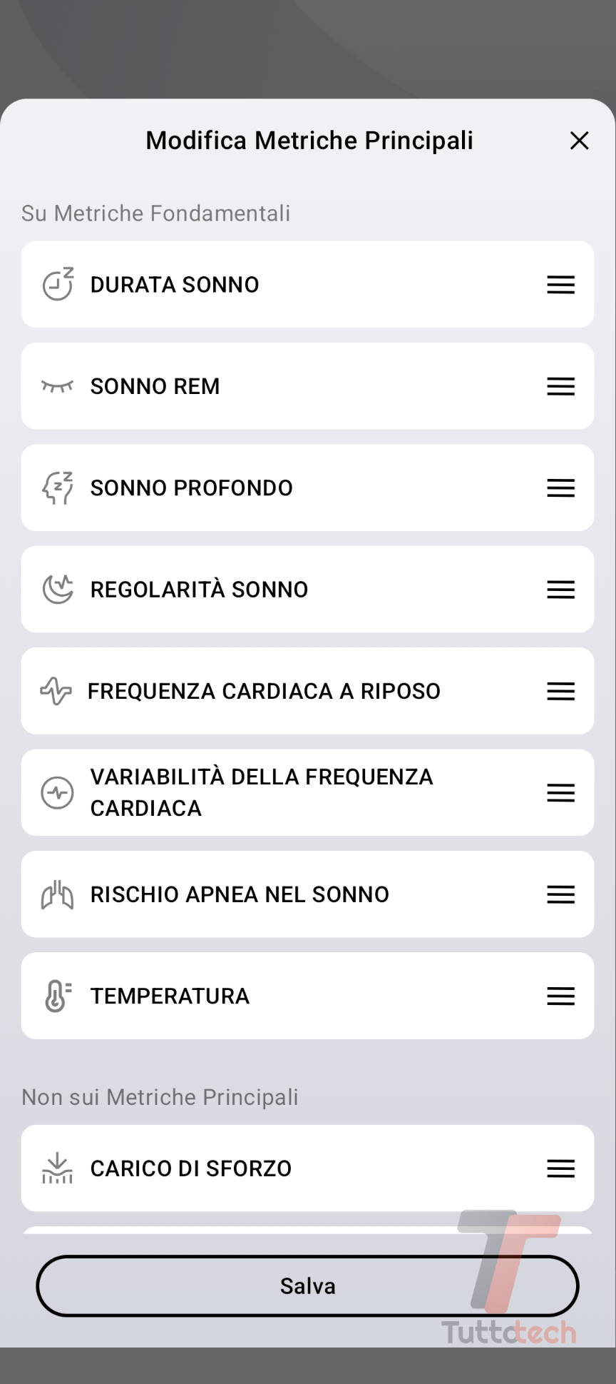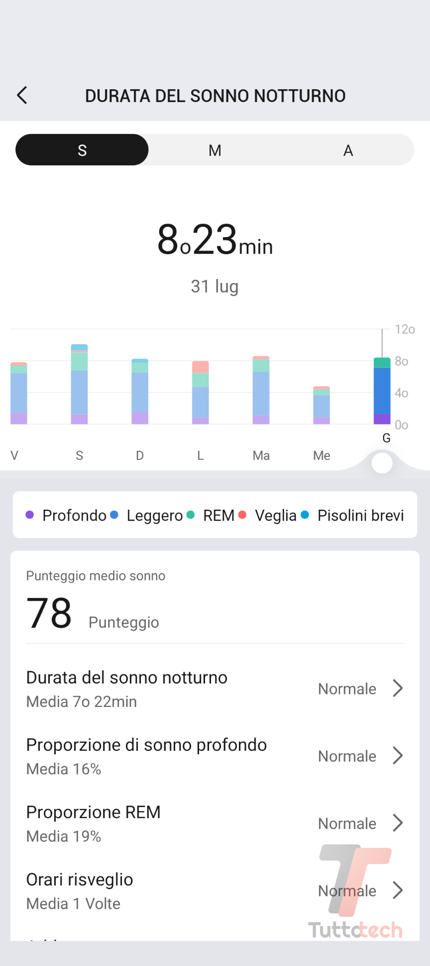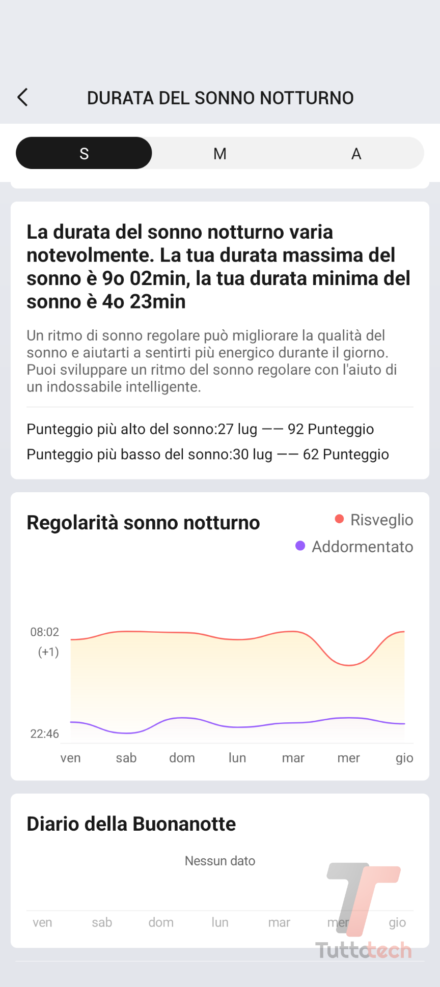 Amazfit Balance 2 è un vero e proprio coach per il sonno perché è in grado di raccogliere una enorme quantità di dati e di fornire report dettagliati su ogni elemento che lo caratterizza, con tanto di grafici, andamenti e suggerimenti utili per migliorarlo. Lui registra i pisolini, l’HRV, i periodi di veglia, il sonno leggero, il sonno profondo, le fasi REM, la temperatura cutanea, l’RHR, l’ossigeno nel sangue, la frequenza dei battiti cardiaci, la frequenza respiratoria, lo stress e le apnee, perciò tutto quello che serve per creare dei report approfonditi e attendibili sulla qualità, sulla regolarità e sulla durata del sonno. E così fa perché il tracciamento del sonno è fra i suoi punti forti e fra i migliori per quanto riguarda questo genere di prodotti: lui non sbaglia un colpo, nel senso che non capita mai che non abbia registrato qualche valore, e soprattutto è estremamente preciso nella raccolta dei dati e nel riconoscere quando ci addormentiamo e svegliamo, anche di giorno.