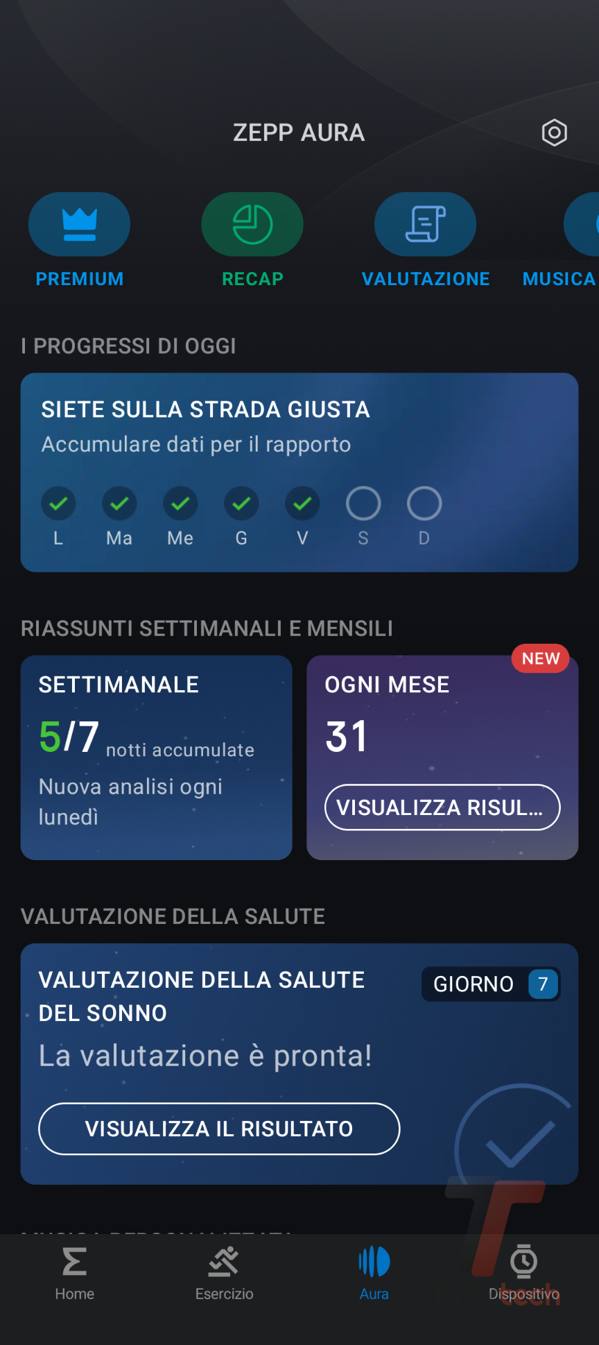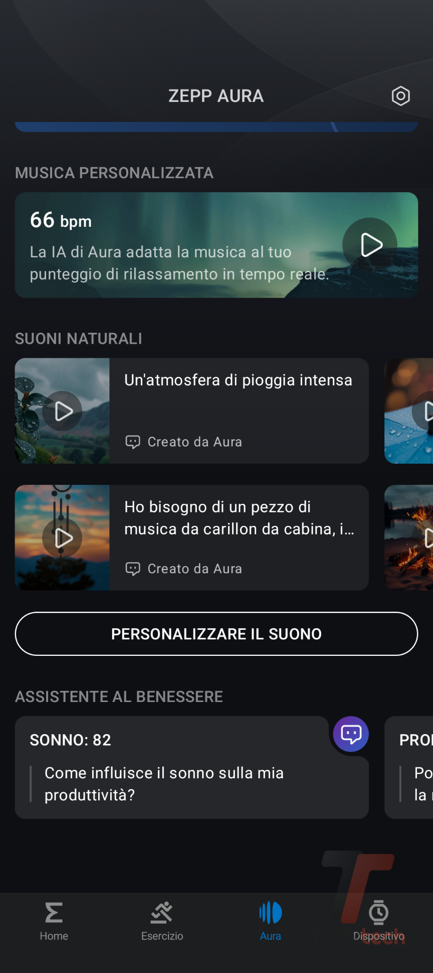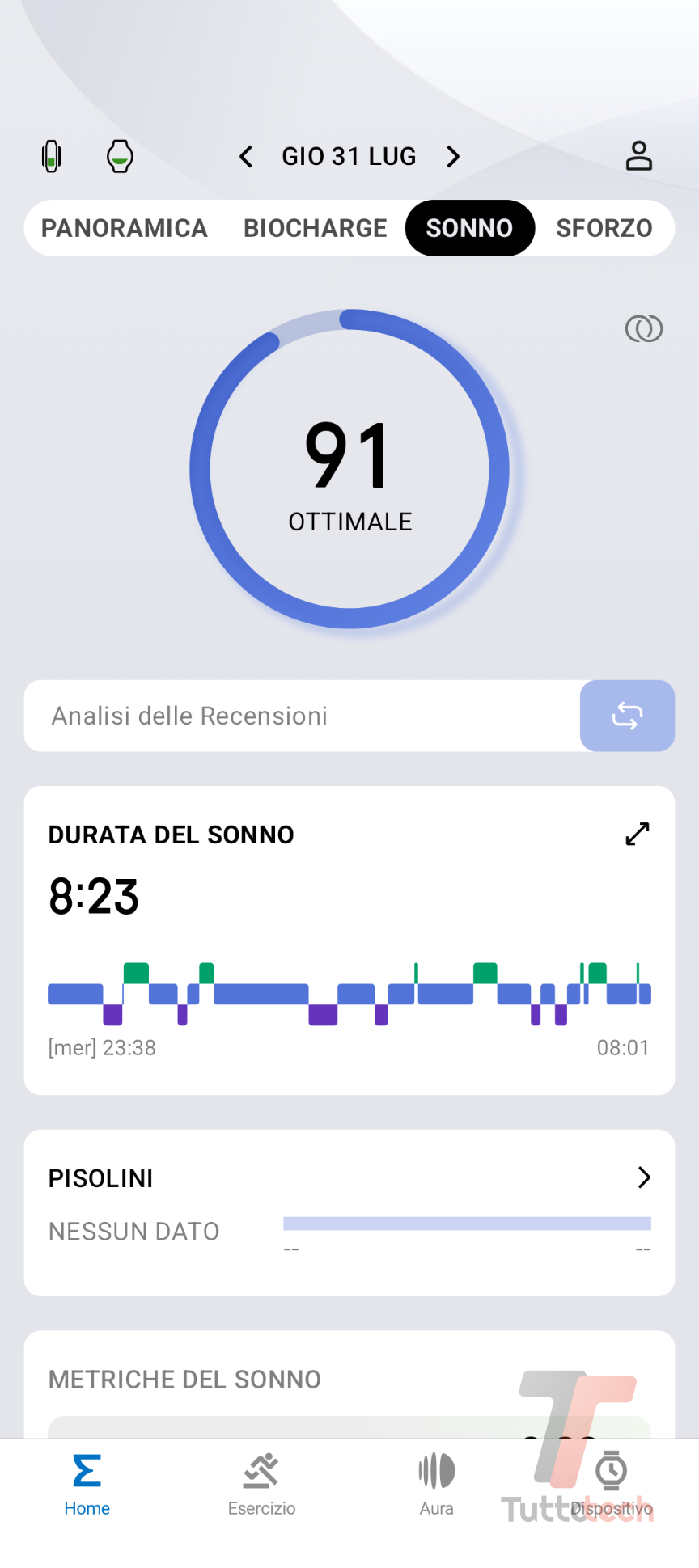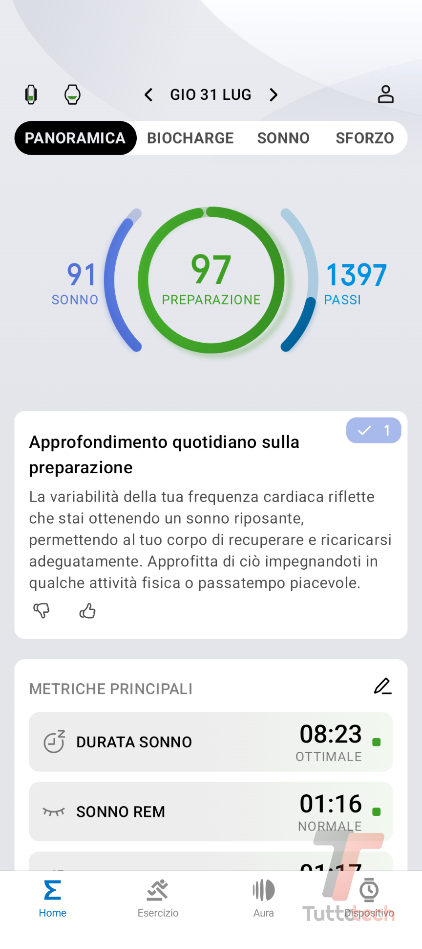 I valori che lui mostra non solo sono in linea con quelli di tutti gli altri dispositivi con cui abbiamo avuto a che fare, modello precedente compreso, ma sono veritieri e attendibili: cioè lui sa esattamente come abbiamo dormito ed effettivamente noi abbiamo dormito come dice lui, in termini di durata, qualità e regolarità. I dati che mostra trovano riscontro nelle abitudini e nelle attenzioni di tutti i giorni, dati vitali inclusi, e questo lo si nota ancor di più tenendo d’occhio e analizzando il valore Prontezza, che è una specie di riassunto del recupero notturno quotidiano basato su tutti i dati che lui raccoglie e di cui abbiamo parlato sopra. Prontezza è un indicatore di come è andato il recupero notturno di mente e corpo e come tale fornisce indicazioni di quanto e come si è pronti a livello fisico e mentale per affrontare la giornata dopo il risveglio: può sembrare banale e inaffidabile all’apparenza, ma possiamo assicurarvi che nell’uso di tutti i giorni è fondamentale perché fornisce un dato immediato sul benessere fisico e mentale, con tanto di grafici, storici e parametri singoli, e poi è super attendibile perché ci sentiamo e siamo pronti fisicamente e mentalmente esattamente come lui dice. Il tutto, come se non bastasse, è condito da Zepp Aura, che è il solito ottimo assistente digitale di Amazfit che mostra dati, grafici e suggerimenti sul sonno per dormire meglio, per recuperare di più durante le ore di sonno, per scaricare lo stress e per riposare rilassati.