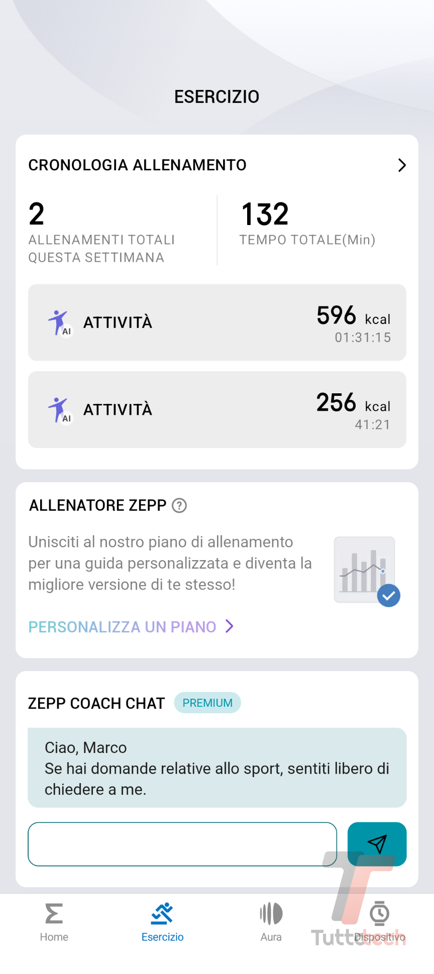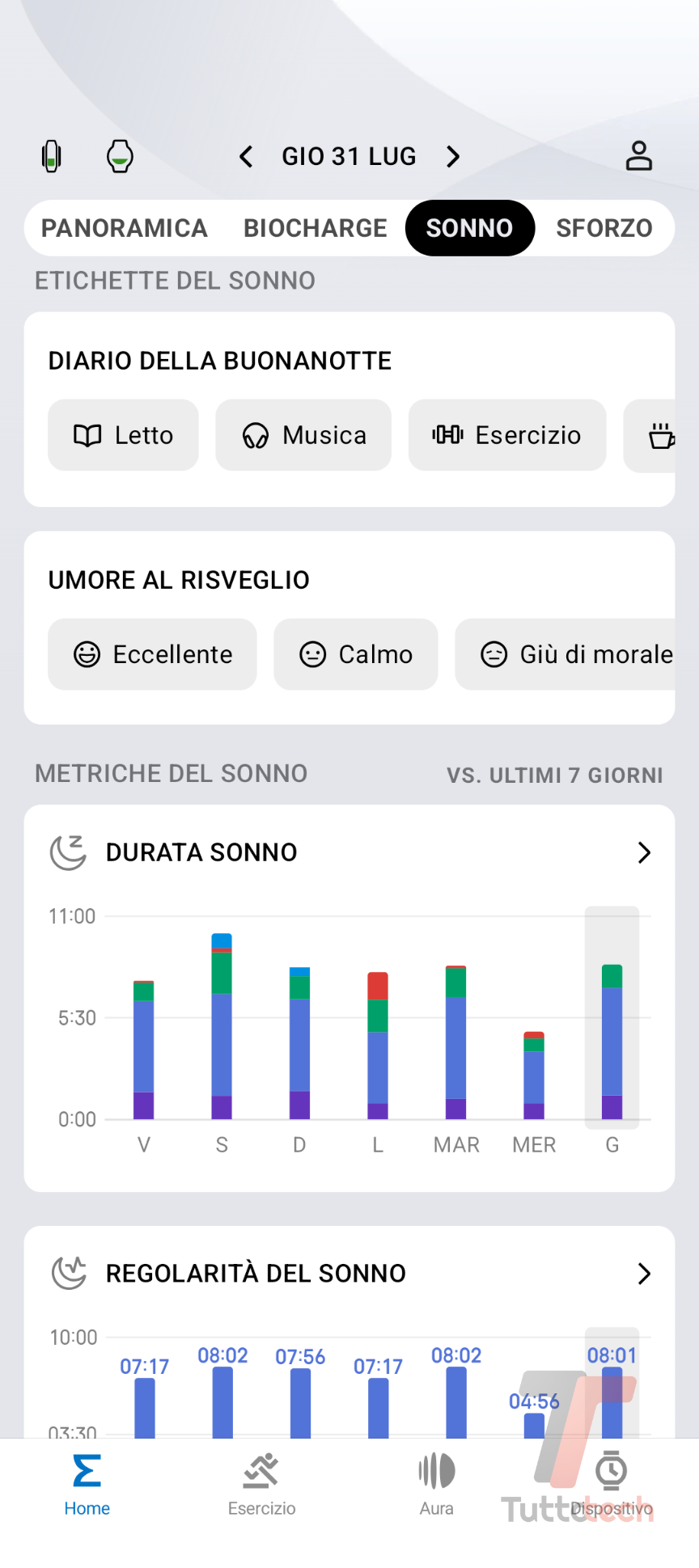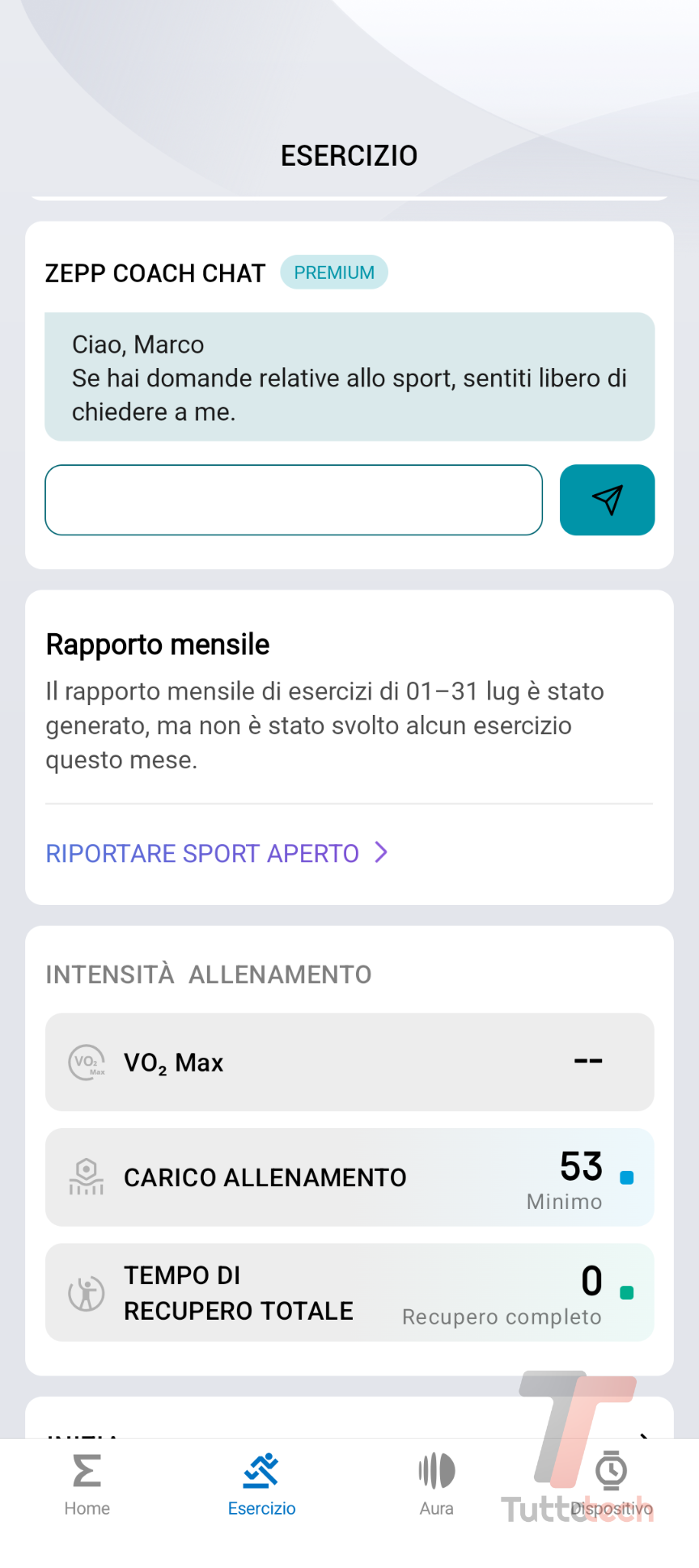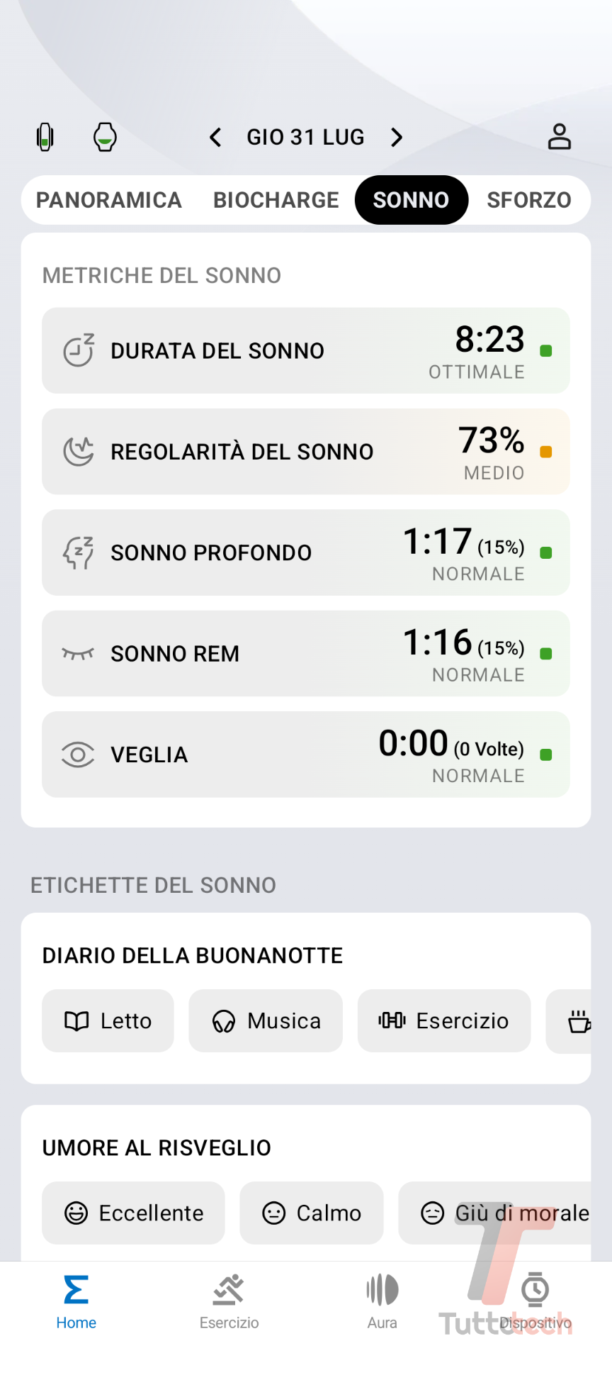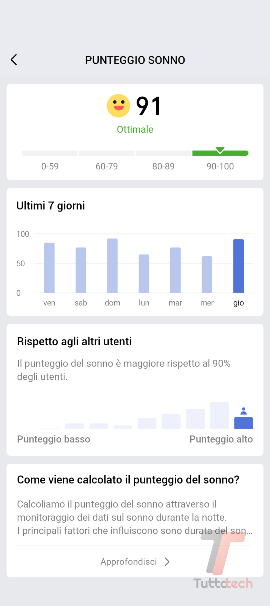 I valori che lui mostra non solo sono in linea con quelli di tutti gli altri dispositivi con cui abbiamo avuto a che fare, modello precedente compreso, ma sono veritieri e attendibili: cioè lui sa esattamente come abbiamo dormito ed effettivamente noi abbiamo dormito come dice lui, in termini di durata, qualità e regolarità. I dati che mostra trovano riscontro nelle abitudini e nelle attenzioni di tutti i giorni, dati vitali inclusi, e questo lo si nota ancor di più tenendo d’occhio e analizzando il valore Prontezza, che è una specie di riassunto del recupero notturno quotidiano basato su tutti i dati che lui raccoglie e di cui abbiamo parlato sopra. Prontezza è un indicatore di come è andato il recupero notturno di mente e corpo e come tale fornisce indicazioni di quanto e come si è pronti a livello fisico e mentale per affrontare la giornata dopo il risveglio: può sembrare banale e inaffidabile all’apparenza, ma possiamo assicurarvi che nell’uso di tutti i giorni è fondamentale perché fornisce un dato immediato sul benessere fisico e mentale, con tanto di grafici, storici e parametri singoli, e poi è super attendibile perché ci sentiamo e siamo pronti fisicamente e mentalmente esattamente come lui dice. Il tutto, come se non bastasse, è condito da Zepp Aura, che è il solito ottimo assistente digitale di Amazfit che mostra dati, grafici e suggerimenti sul sonno per dormire meglio, per recuperare di più durante le ore di sonno, per scaricare lo stress e per riposare rilassati.