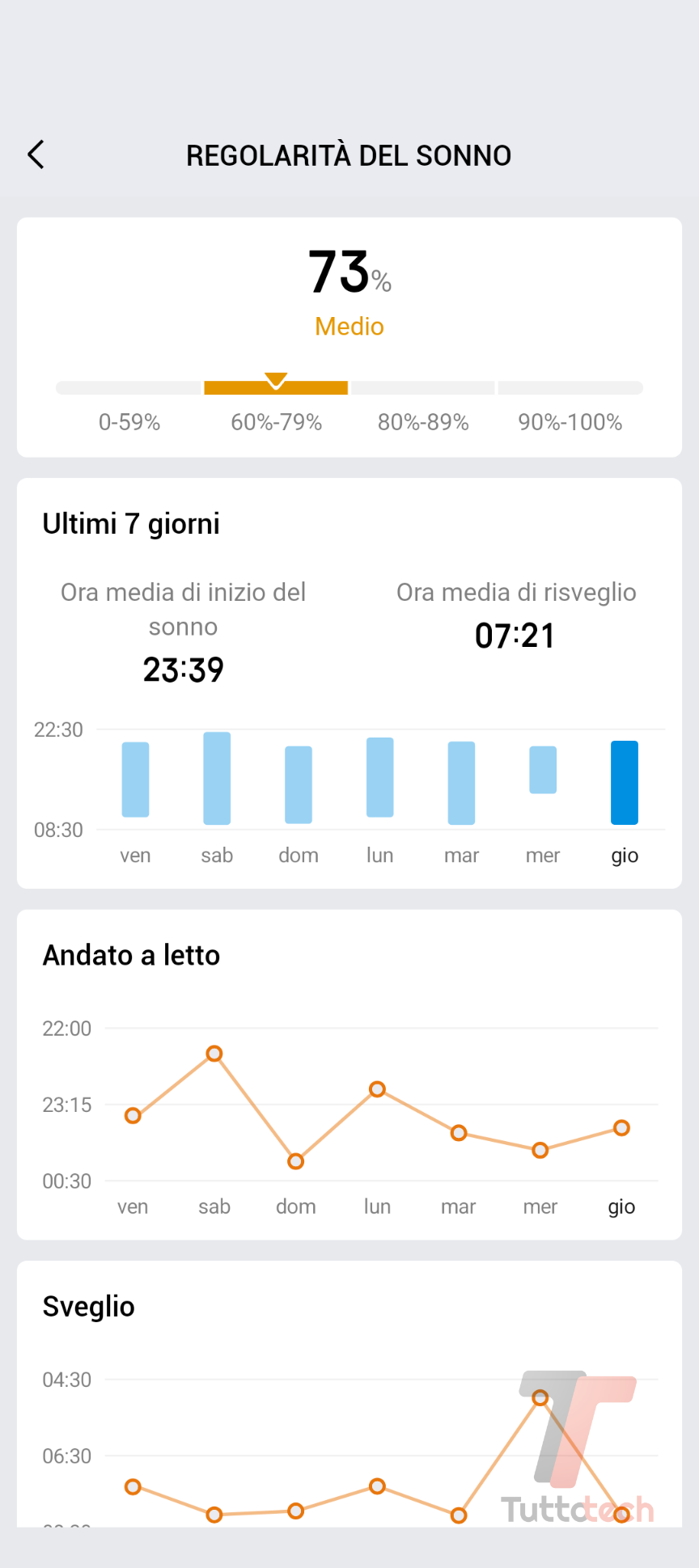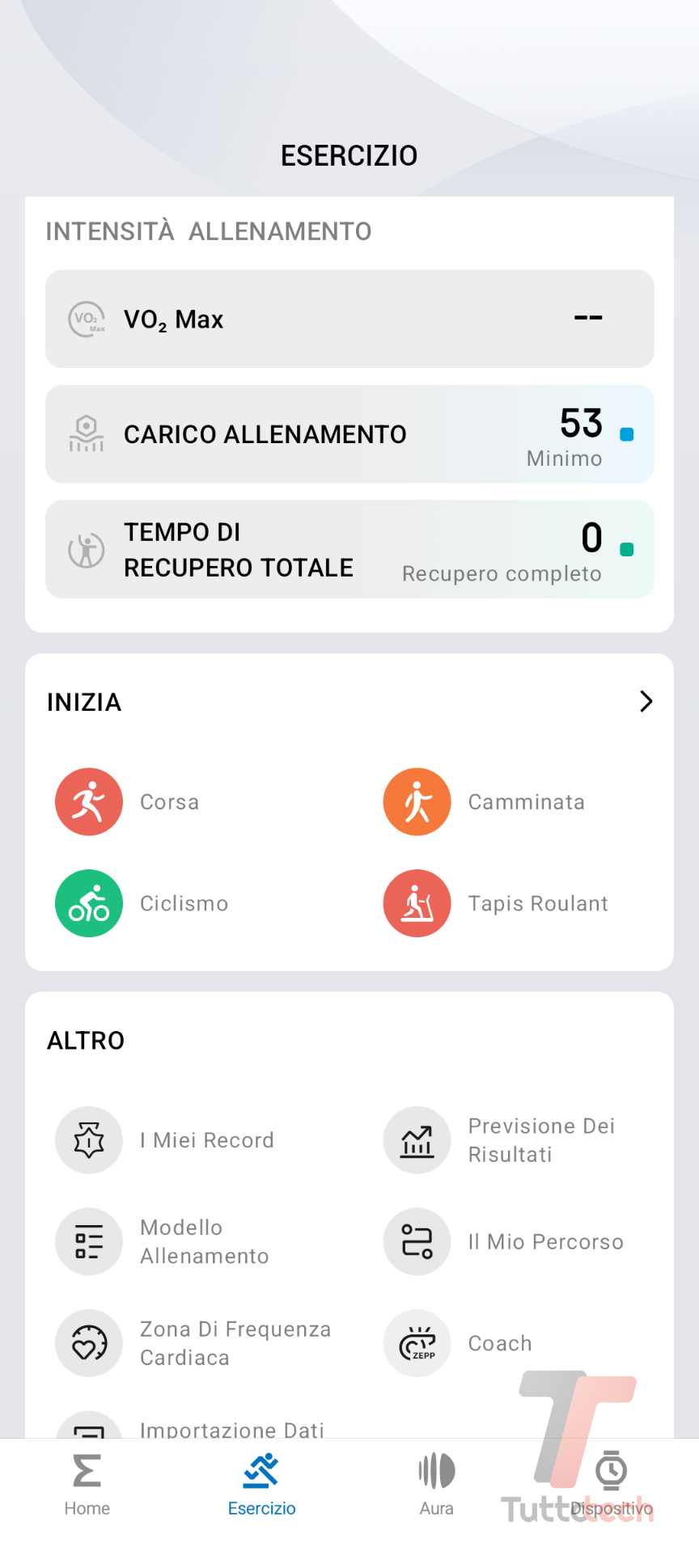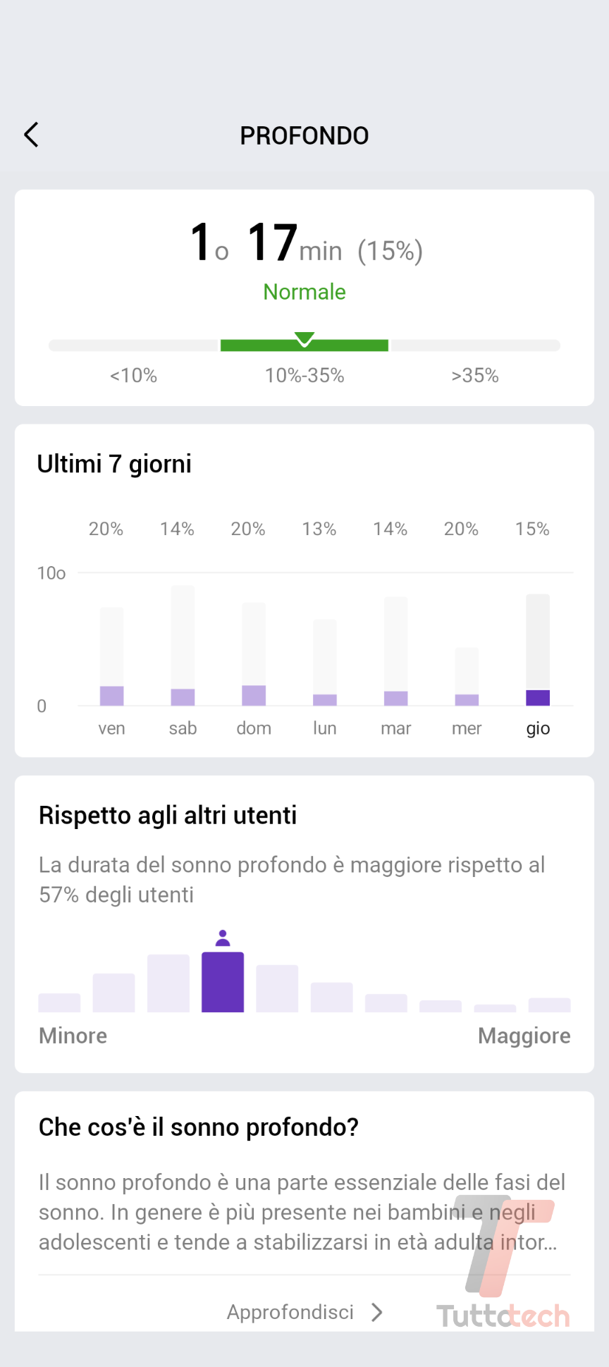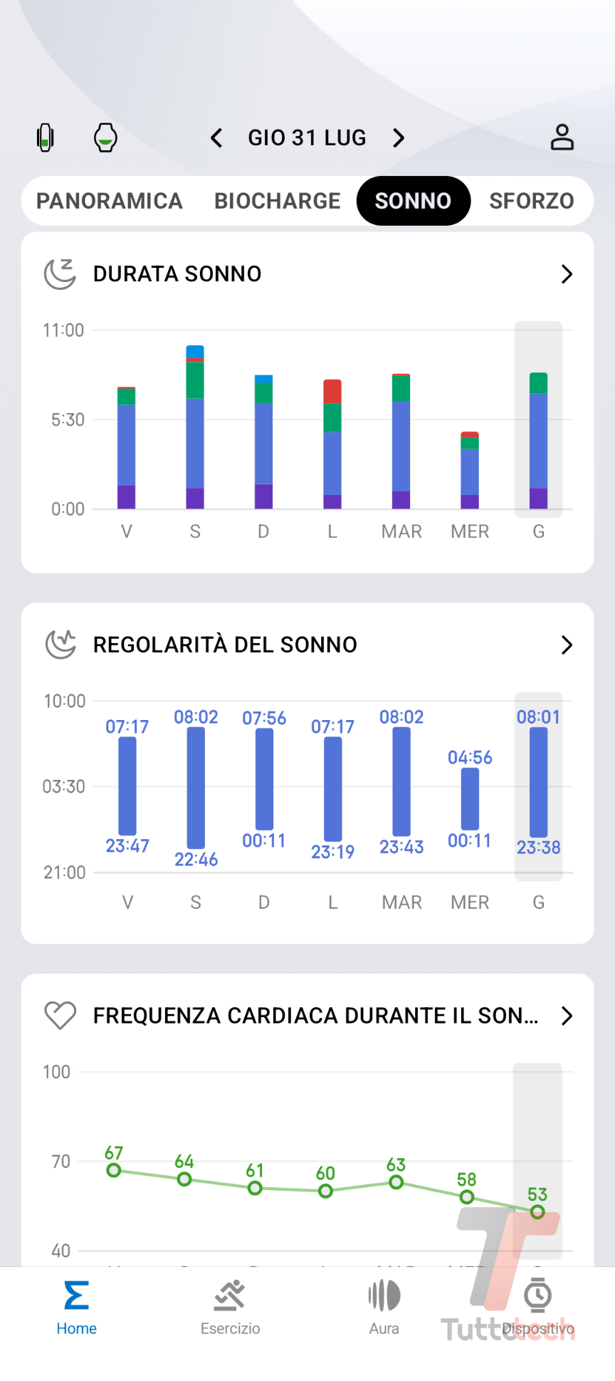 I valori che lui mostra non solo sono in linea con quelli di tutti gli altri dispositivi con cui abbiamo avuto a che fare, modello precedente compreso, ma sono veritieri e attendibili: cioè lui sa esattamente come abbiamo dormito ed effettivamente noi abbiamo dormito come dice lui, in termini di durata, qualità e regolarità. I dati che mostra trovano riscontro nelle abitudini e nelle attenzioni di tutti i giorni, dati vitali inclusi, e questo lo si nota ancor di più tenendo d’occhio e analizzando il valore Prontezza, che è una specie di riassunto del recupero notturno quotidiano basato su tutti i dati che lui raccoglie e di cui abbiamo parlato sopra. Prontezza è un indicatore di come è andato il recupero notturno di mente e corpo e come tale fornisce indicazioni di quanto e come si è pronti a livello fisico e mentale per affrontare la giornata dopo il risveglio: può sembrare banale e inaffidabile all’apparenza, ma possiamo assicurarvi che nell’uso di tutti i giorni è fondamentale perché fornisce un dato immediato sul benessere fisico e mentale, con tanto di grafici, storici e parametri singoli, e poi è super attendibile perché ci sentiamo e siamo pronti fisicamente e mentalmente esattamente come lui dice. Il tutto, come se non bastasse, è condito da Zepp Aura, che è il solito ottimo assistente digitale di Amazfit che mostra dati, grafici e suggerimenti sul sonno per dormire meglio, per recuperare di più durante le ore di sonno, per scaricare lo stress e per riposare rilassati.