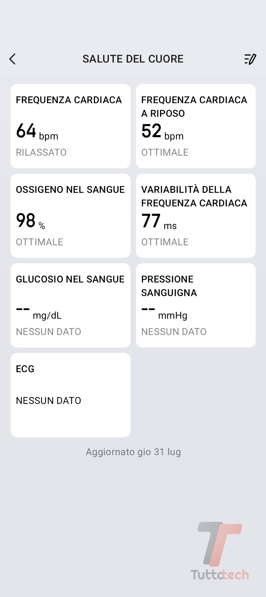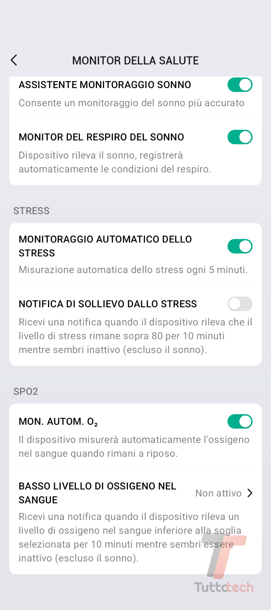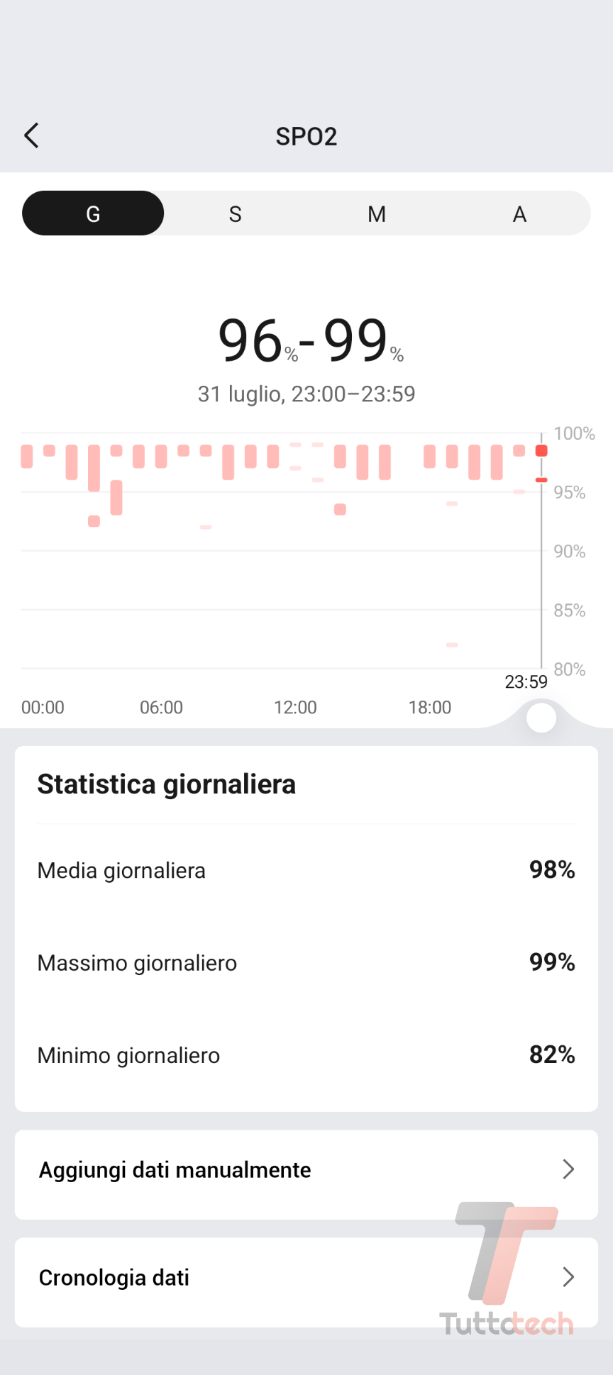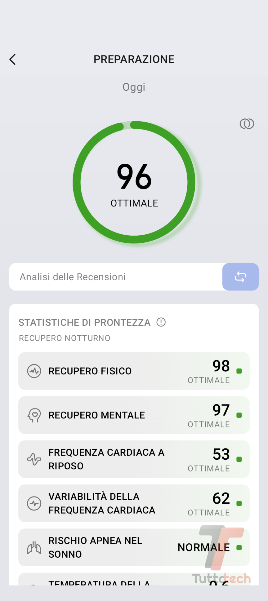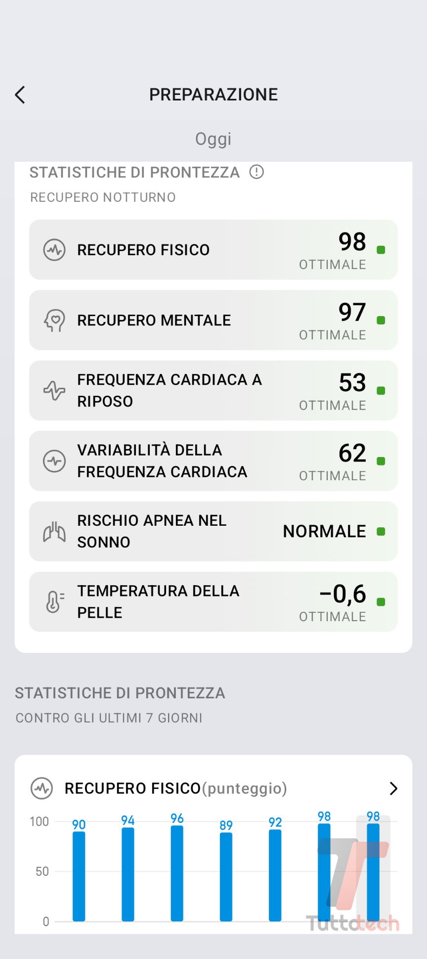 Da quello che abbiamo potuto vedere è sempre stato così e non ha mai perso un colpo nelle misurazioni risultando sempre sul pezzo e affidabile, soprattutto per quanto riguarda la frequenza cardiaca dato che è il parametro vitale che misura più soggetto a variazioni. Lui poi non si limita a mostrare i dati raccolti in modo misero, cosa comunque possibile, ma, così come per il sonno, li mixa fra loro per fornire delle funzioni sulla salute un po’ più articolate, fatte di andamenti, bei grafici ricchi di dettagli e consigli, sia tramite l’applicazione per smartphone che tramite il suo display. Può misurare i valori in tempo reale, in base agli intervalli selezionati nelle impostazioni oppure manualmente su richiesta, perciò offre un’ampia scelta per quanto riguarda il monitoraggio. Le uniche sua mancanze da questo punto di vista riguardano l’assenza di funzioni avanzate e attuali per il monitoraggio della salute, come ECG, rigidità arteriosa, pressione sanguigna, BIA e indice antiossidanti, che invece bene o male ritroviamo nei suoi diretti concorrenti e che gli avrebbero permesso di essere uno strumento ancora più completo sotto questo aspetto.
