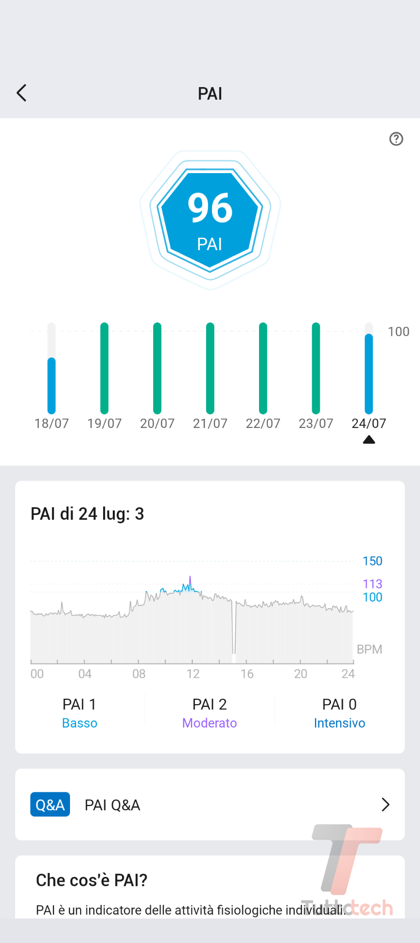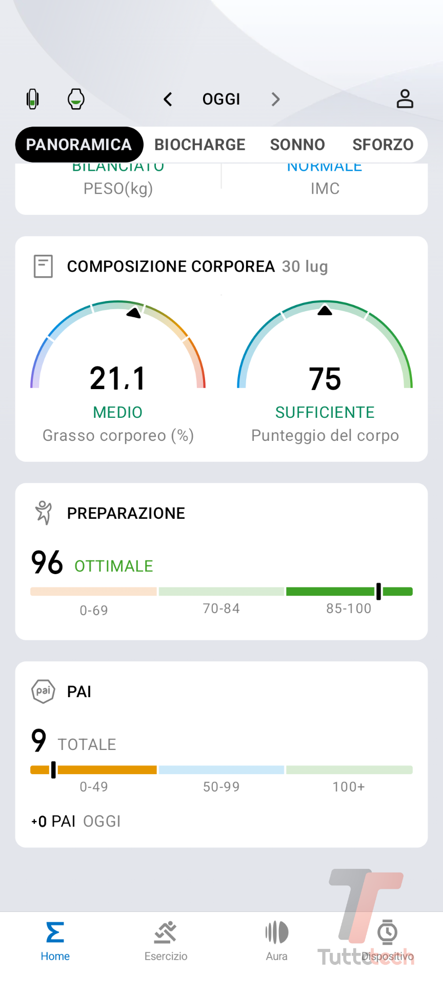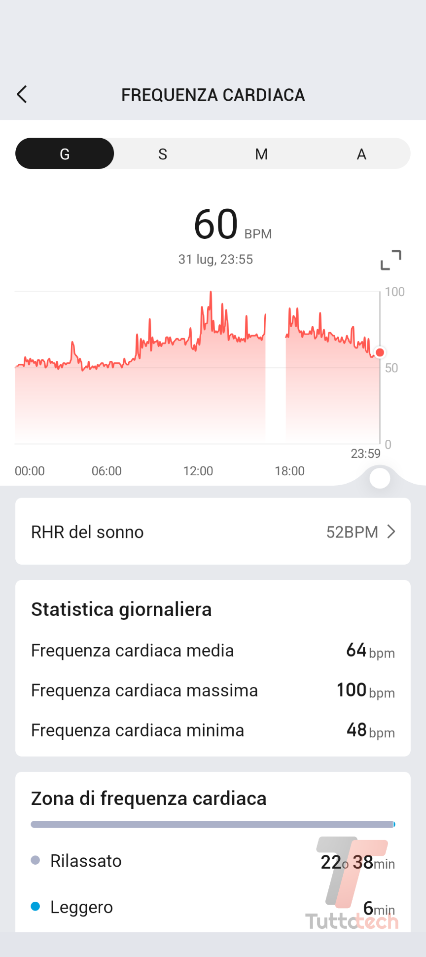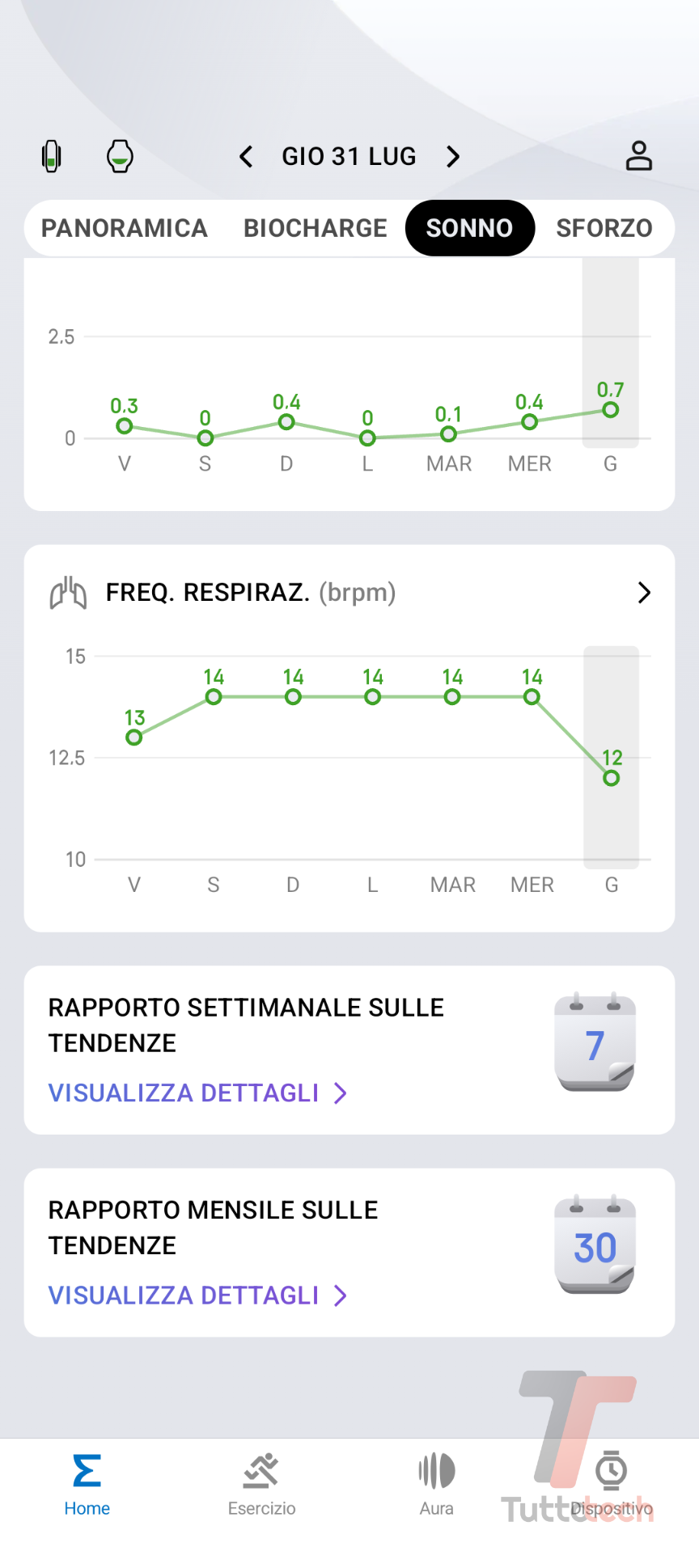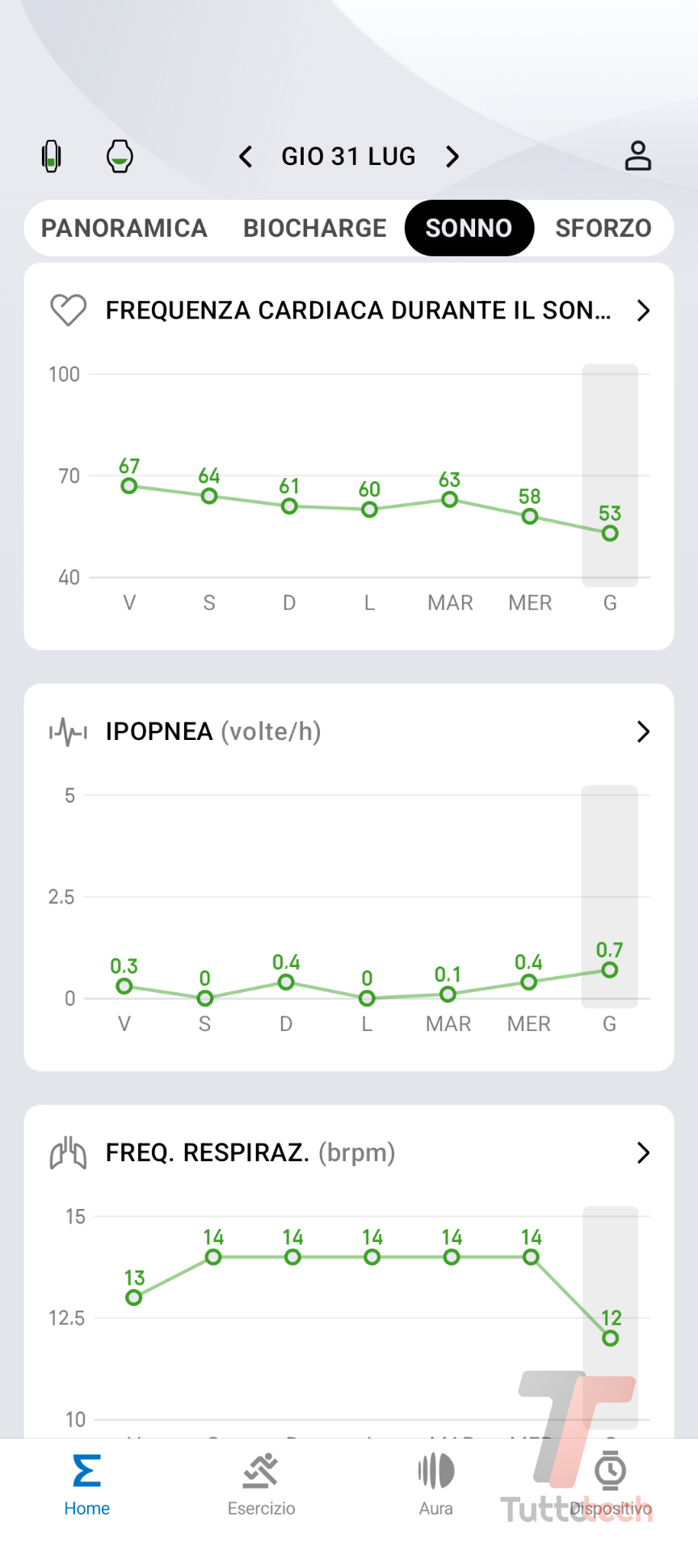 Da quello che abbiamo potuto vedere è sempre stato così e non ha mai perso un colpo nelle misurazioni risultando sempre sul pezzo e affidabile, soprattutto per quanto riguarda la frequenza cardiaca dato che è il parametro vitale che misura più soggetto a variazioni. Lui poi non si limita a mostrare i dati raccolti in modo misero, cosa comunque possibile, ma, così come per il sonno, li mixa fra loro per fornire delle funzioni sulla salute un po’ più articolate, fatte di andamenti, bei grafici ricchi di dettagli e consigli, sia tramite l’applicazione per smartphone che tramite il suo display. Può misurare i valori in tempo reale, in base agli intervalli selezionati nelle impostazioni oppure manualmente su richiesta, perciò offre un’ampia scelta per quanto riguarda il monitoraggio. Le uniche sua mancanze da questo punto di vista riguardano l’assenza di funzioni avanzate e attuali per il monitoraggio della salute, come ECG, rigidità arteriosa, pressione sanguigna, BIA e indice antiossidanti, che invece bene o male ritroviamo nei suoi diretti concorrenti e che gli avrebbero permesso di essere uno strumento ancora più completo sotto questo aspetto.