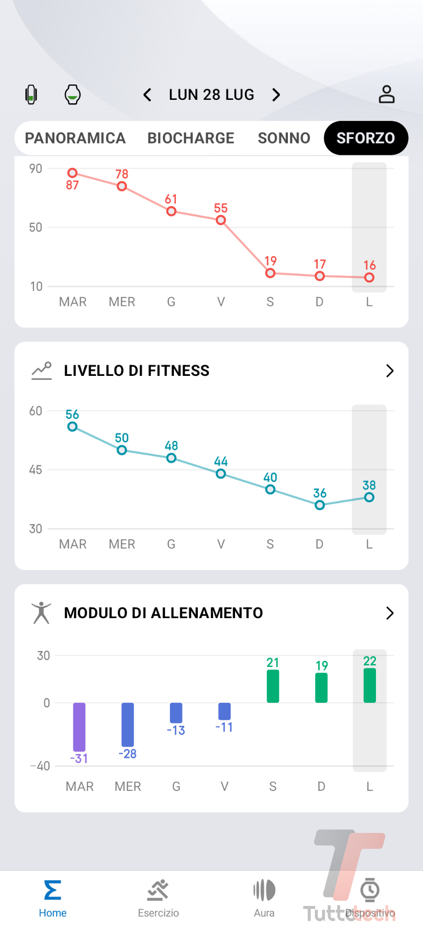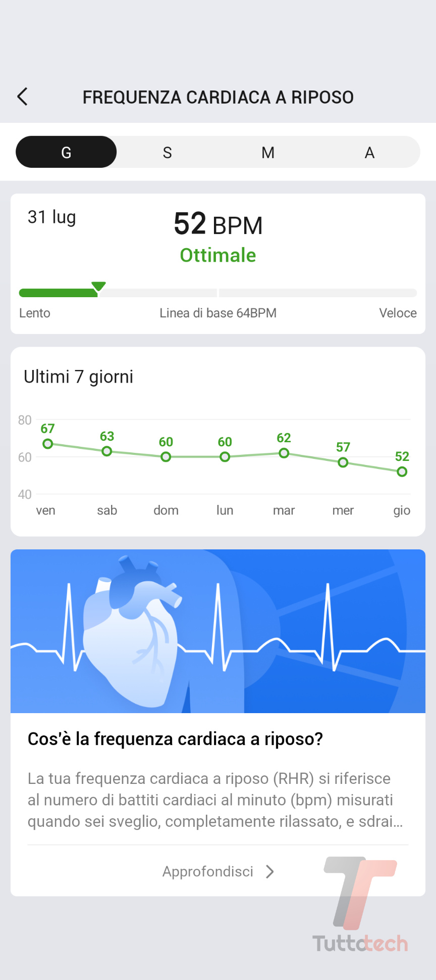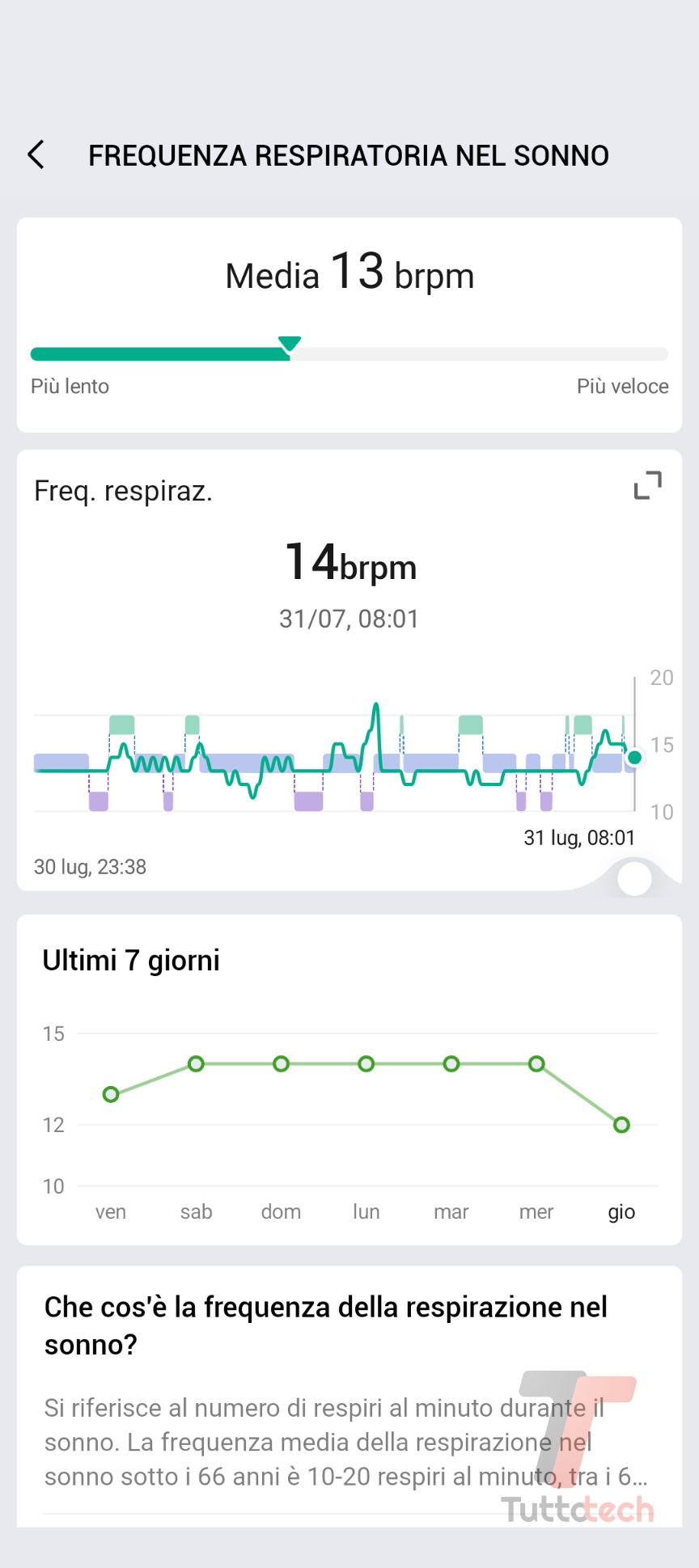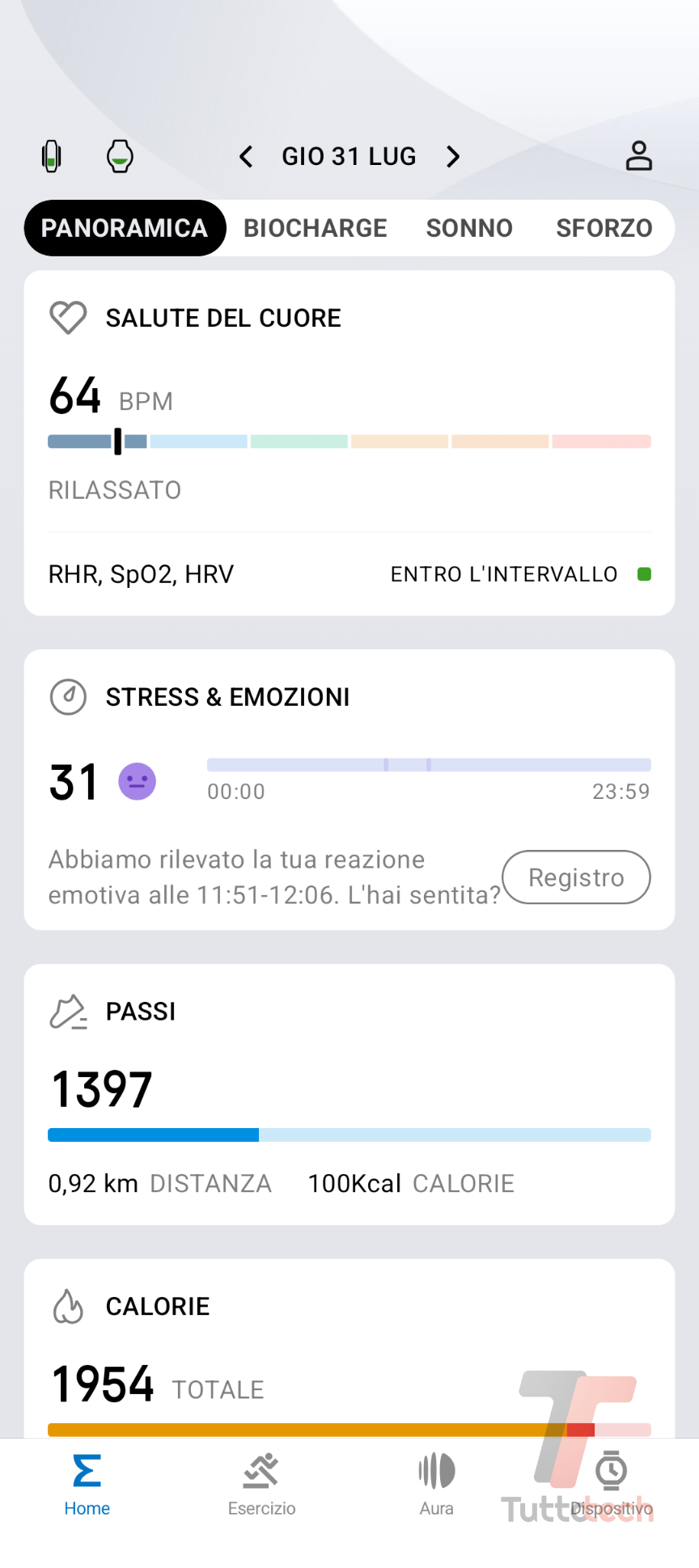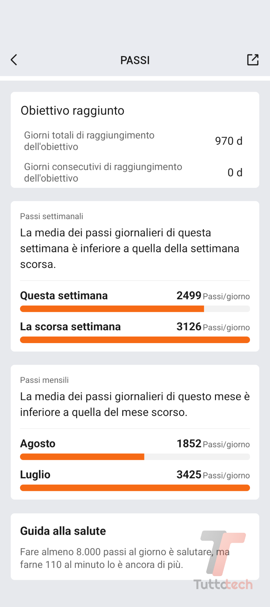 Da quello che abbiamo potuto vedere è sempre stato così e non ha mai perso un colpo nelle misurazioni risultando sempre sul pezzo e affidabile, soprattutto per quanto riguarda la frequenza cardiaca dato che è il parametro vitale che misura più soggetto a variazioni. Lui poi non si limita a mostrare i dati raccolti in modo misero, cosa comunque possibile, ma, così come per il sonno, li mixa fra loro per fornire delle funzioni sulla salute un po’ più articolate, fatte di andamenti, bei grafici ricchi di dettagli e consigli, sia tramite l’applicazione per smartphone che tramite il suo display. Può misurare i valori in tempo reale, in base agli intervalli selezionati nelle impostazioni oppure manualmente su richiesta, perciò offre un’ampia scelta per quanto riguarda il monitoraggio. Le uniche sua mancanze da questo punto di vista riguardano l’assenza di funzioni avanzate e attuali per il monitoraggio della salute, come ECG, rigidità arteriosa, pressione sanguigna, BIA e indice antiossidanti, che invece bene o male ritroviamo nei suoi diretti concorrenti e che gli avrebbero permesso di essere uno strumento ancora più completo sotto questo aspetto.