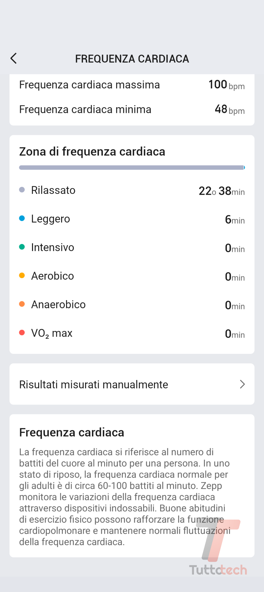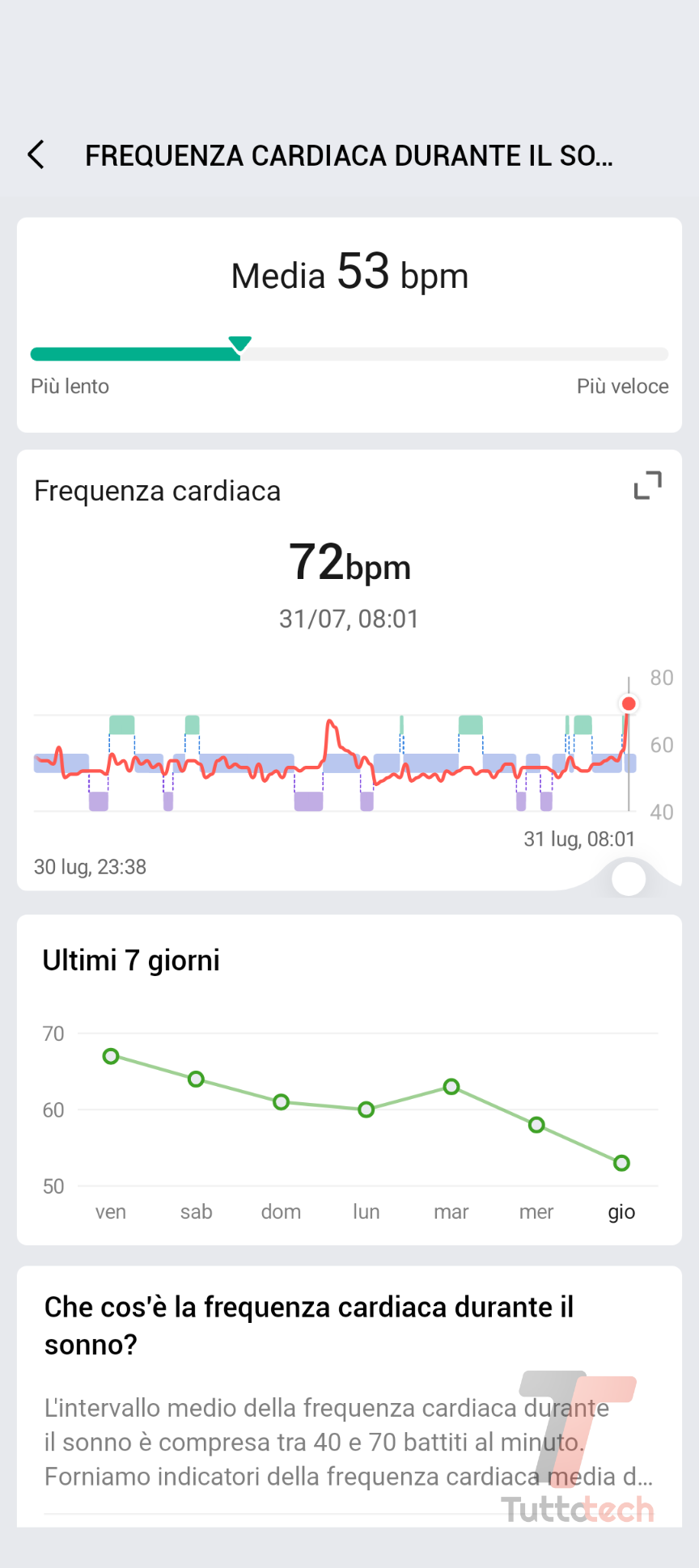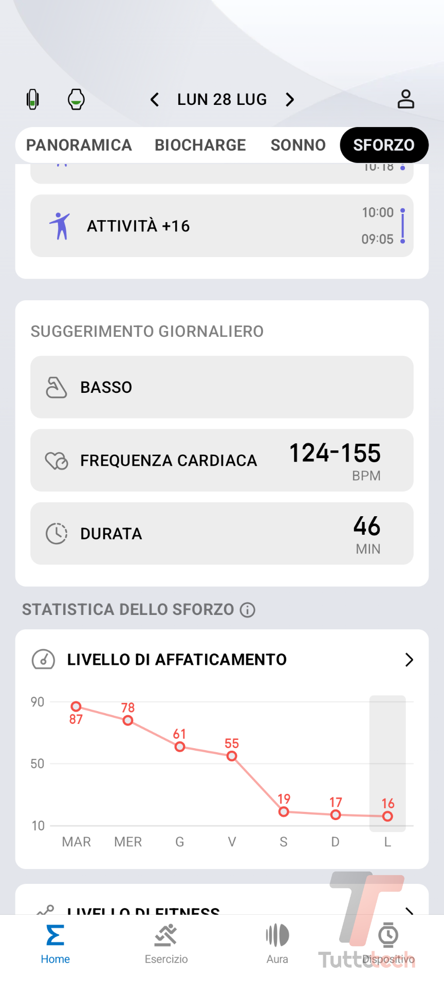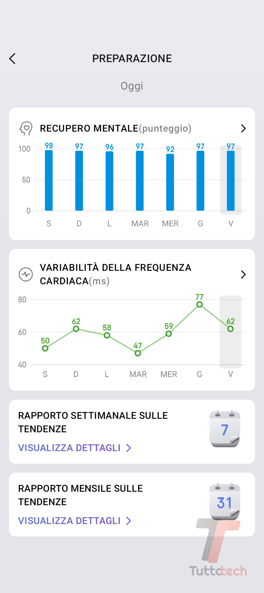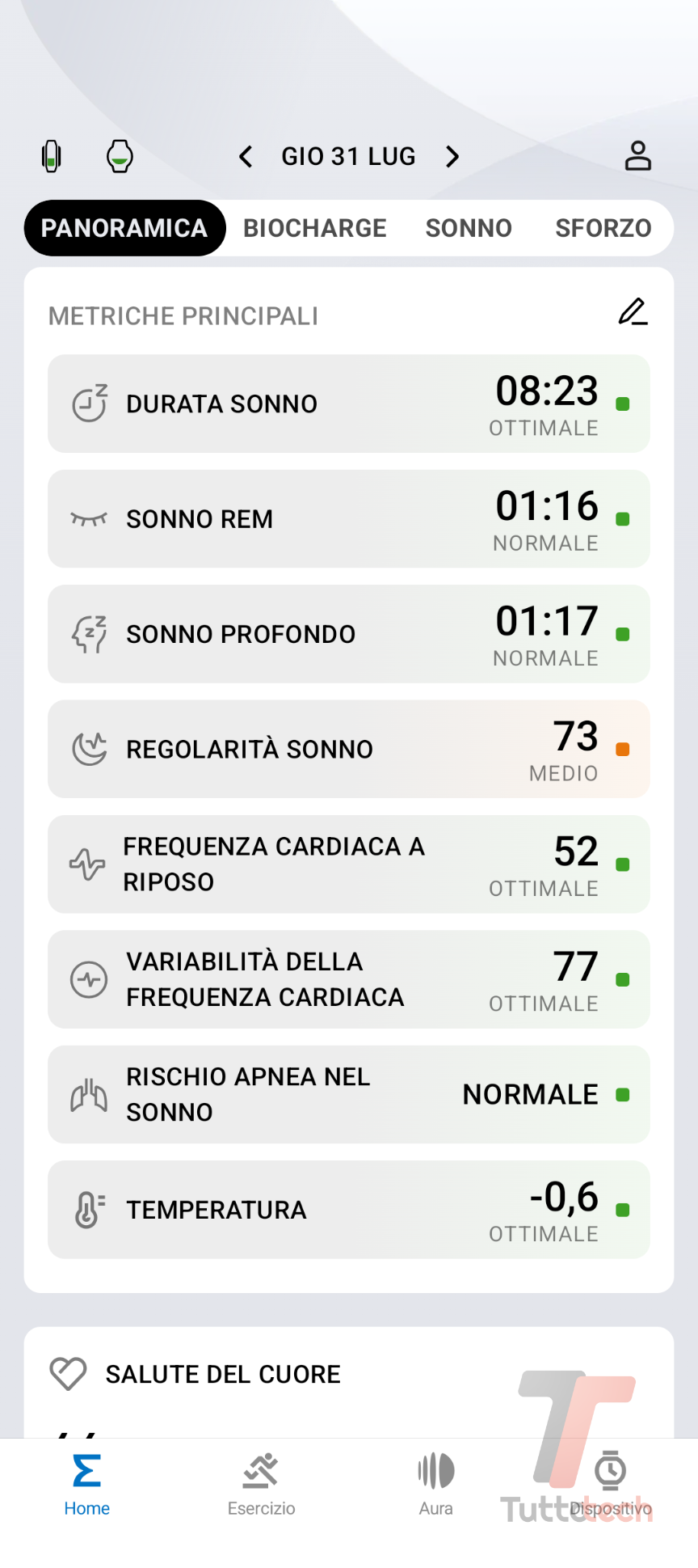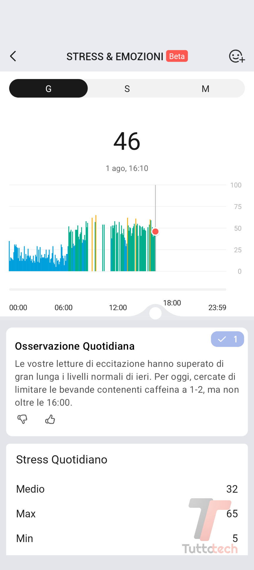 Da quello che abbiamo potuto vedere è sempre stato così e non ha mai perso un colpo nelle misurazioni risultando sempre sul pezzo e affidabile, soprattutto per quanto riguarda la frequenza cardiaca dato che è il parametro vitale che misura più soggetto a variazioni. Lui poi non si limita a mostrare i dati raccolti in modo misero, cosa comunque possibile, ma, così come per il sonno, li mixa fra loro per fornire delle funzioni sulla salute un po’ più articolate, fatte di andamenti, bei grafici ricchi di dettagli e consigli, sia tramite l’applicazione per smartphone che tramite il suo display. Può misurare i valori in tempo reale, in base agli intervalli selezionati nelle impostazioni oppure manualmente su richiesta, perciò offre un’ampia scelta per quanto riguarda il monitoraggio. Le uniche sua mancanze da questo punto di vista riguardano l’assenza di funzioni avanzate e attuali per il monitoraggio della salute, come ECG, rigidità arteriosa, pressione sanguigna, BIA e indice antiossidanti, che invece bene o male ritroviamo nei suoi diretti concorrenti e che gli avrebbero permesso di essere uno strumento ancora più completo sotto questo aspetto.
